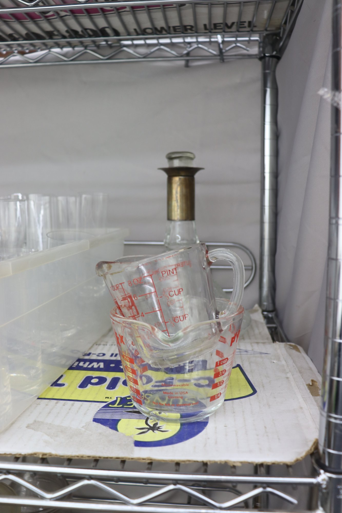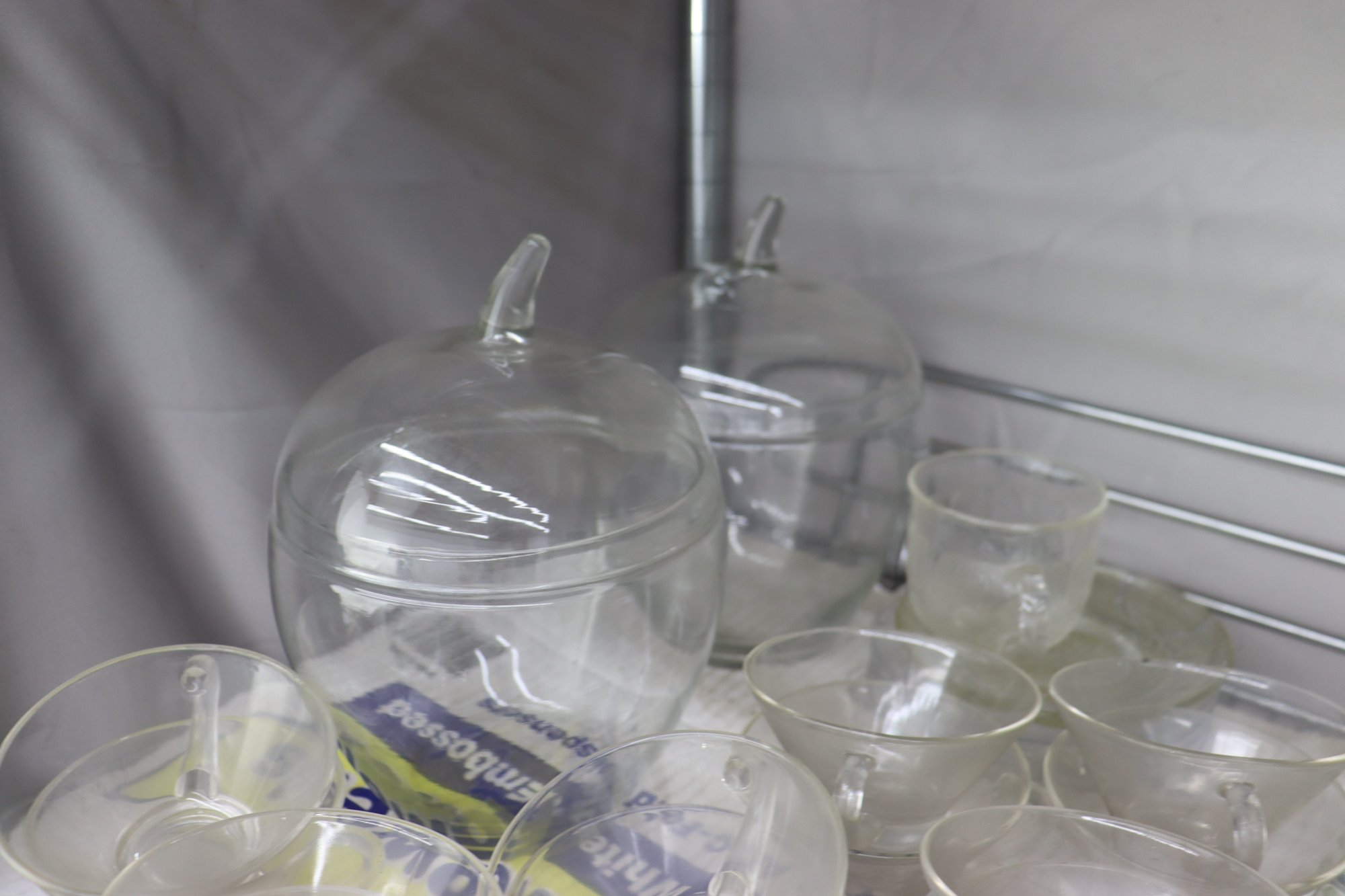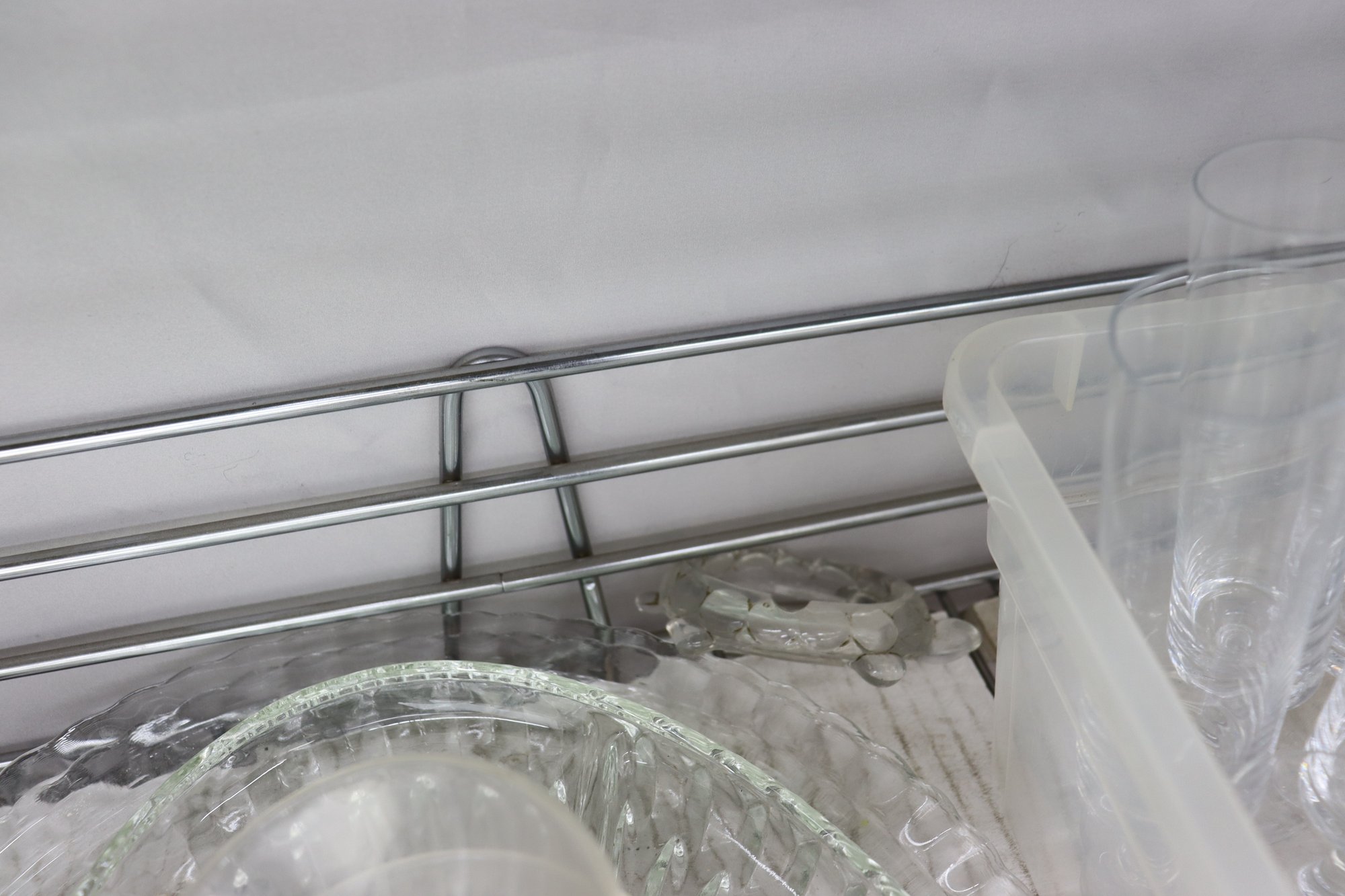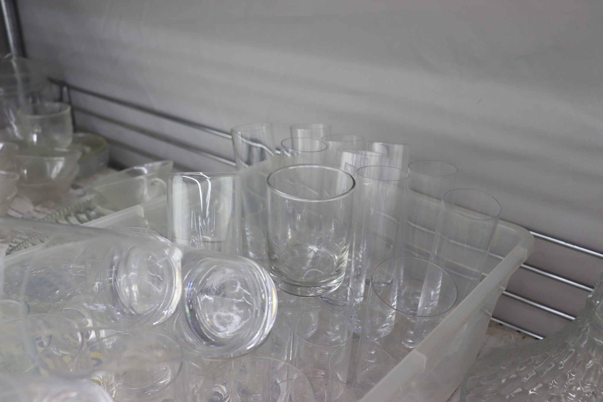 a full shelf lot of clear glassware, sold exactly as shown. This assortment includes a variety of bowls, cups, small dishes, serving pieces, and glass accessories in multiple shapes and sizes.