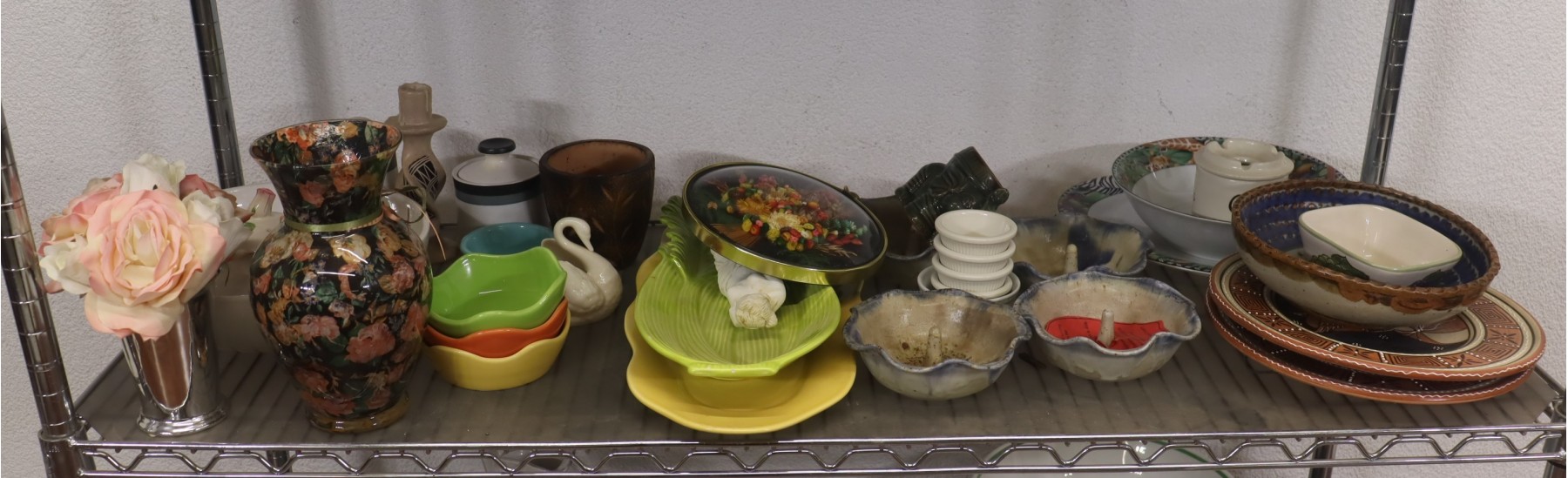 Shelf Lot Of Colorful Table Ware Kitschy Ware, Kitchen Ware, Vases And More