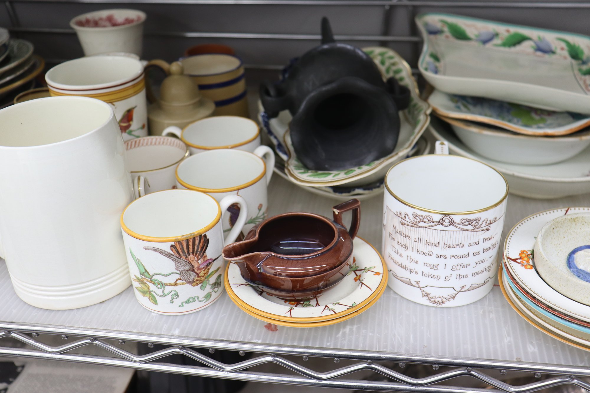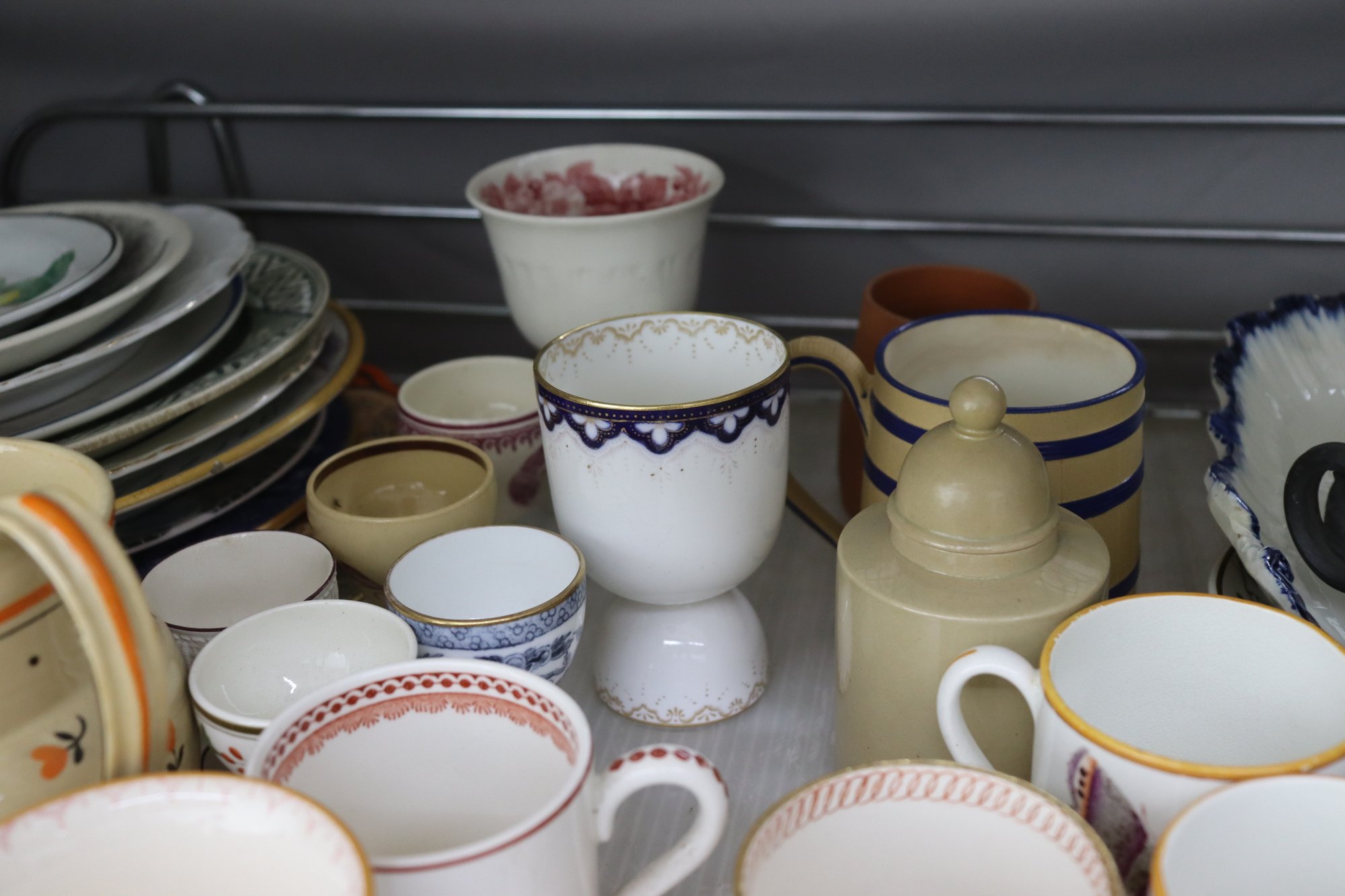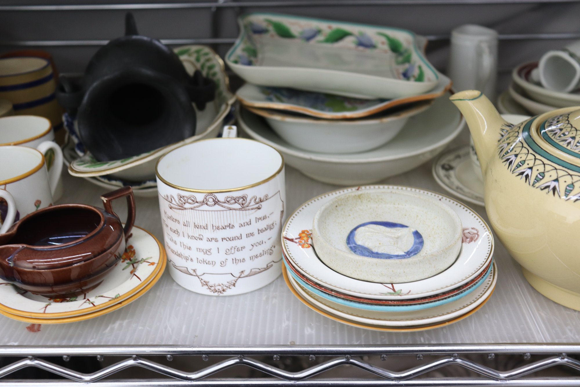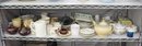 a full shelf lot of mixed pottery and ceramic items, exactly as shown. This group includes a variety of bowls, cups, small vessels, planters, and decorative pieces in assorted forms, glazes, and colors.