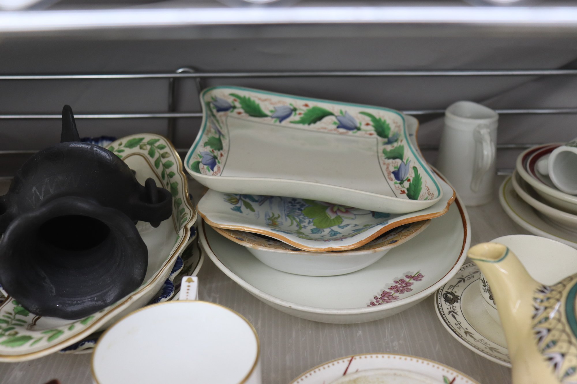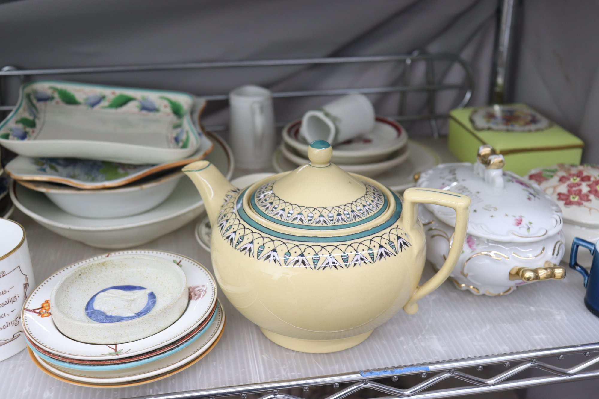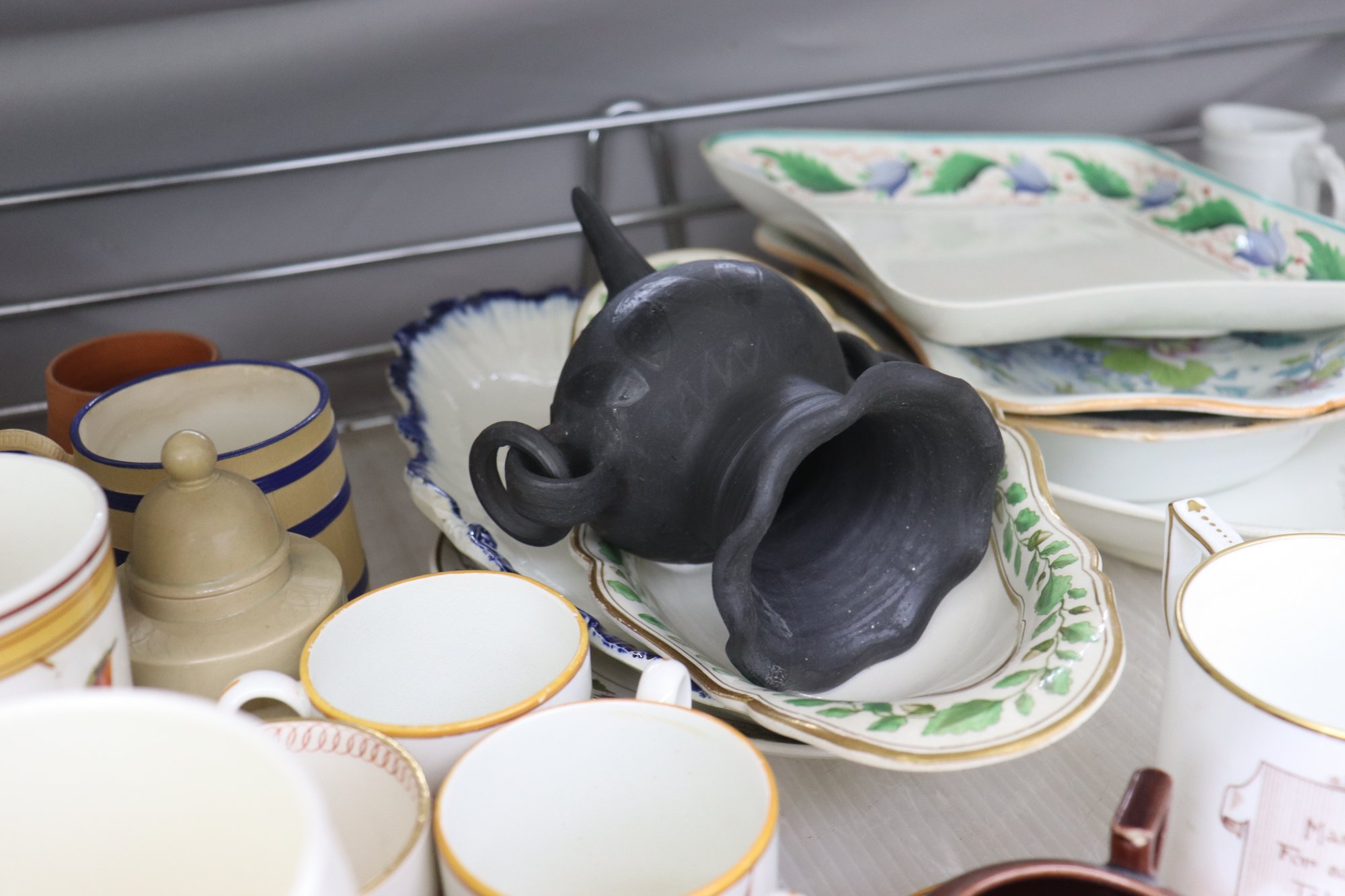 a full shelf lot of mixed pottery and ceramic items, exactly as shown. This group includes a variety of bowls, cups, small vessels, planters, and decorative pieces in assorted forms, glazes, and colors.
