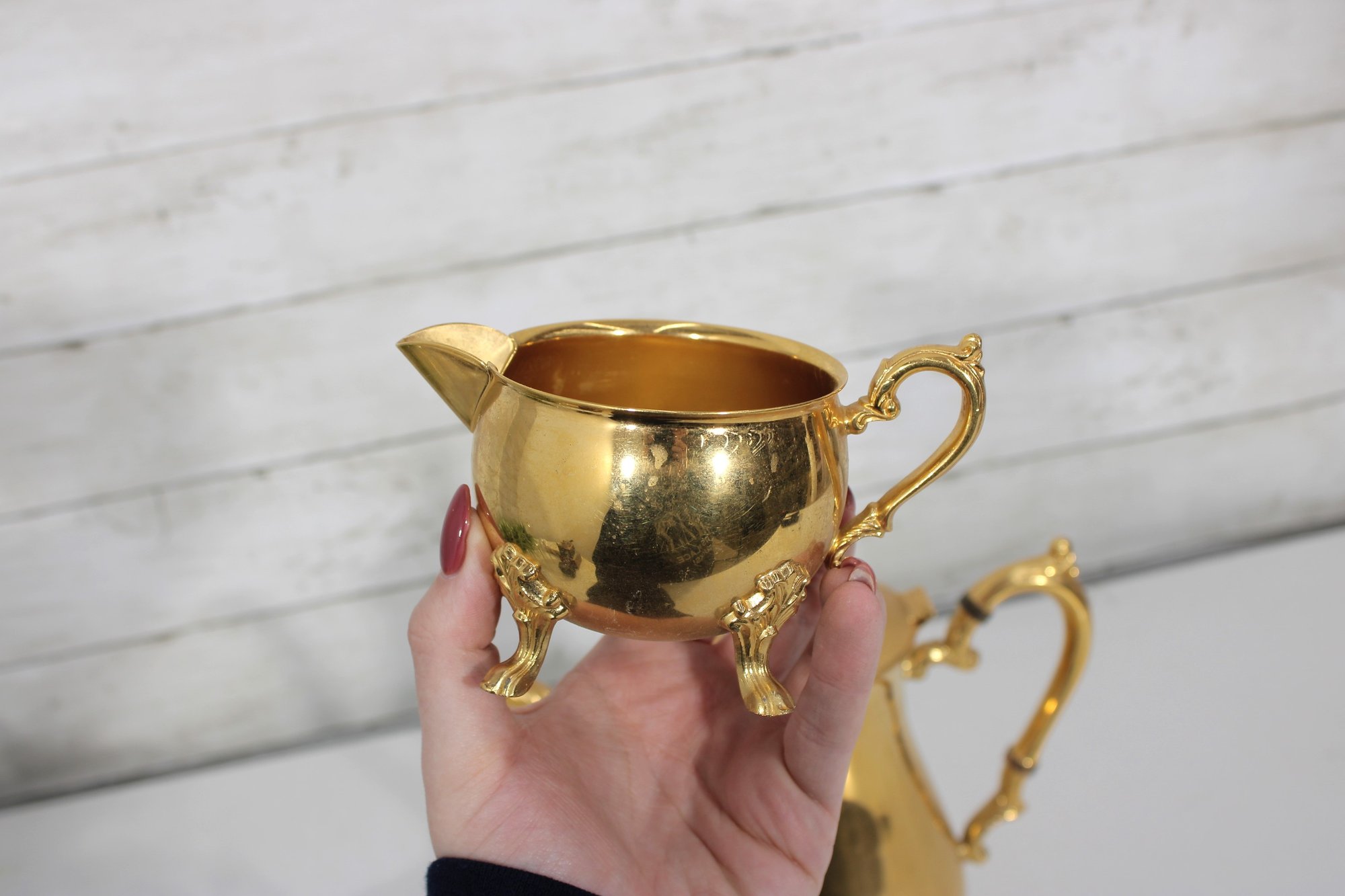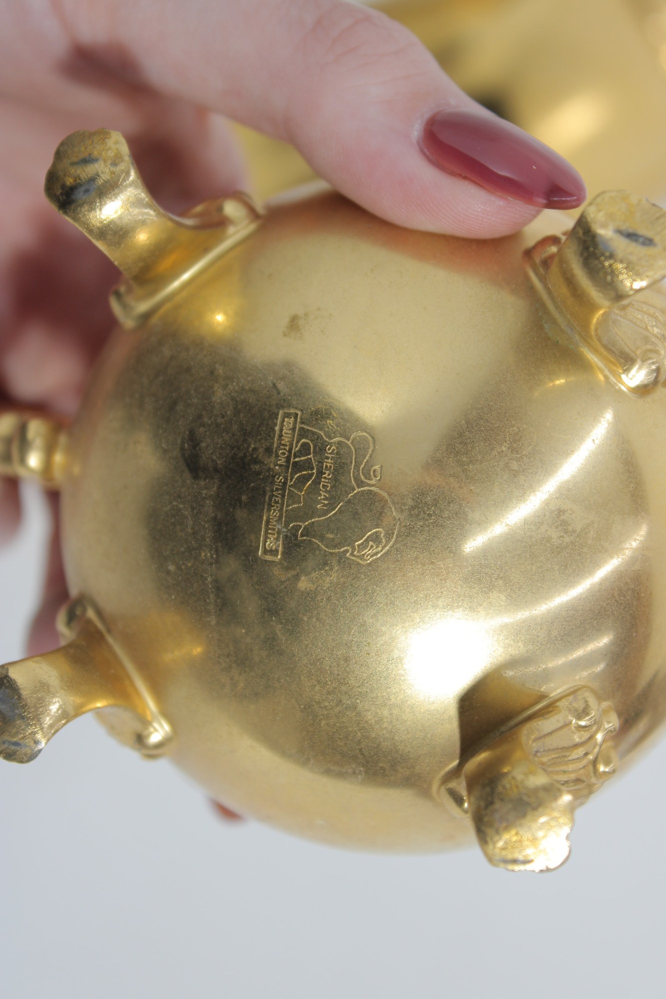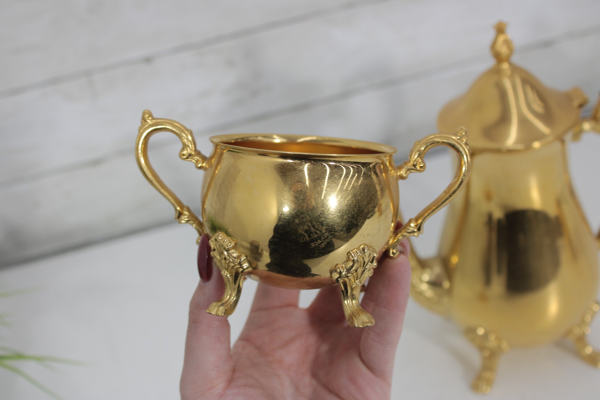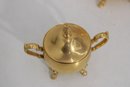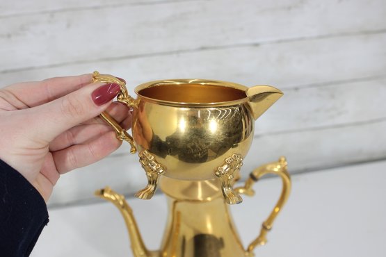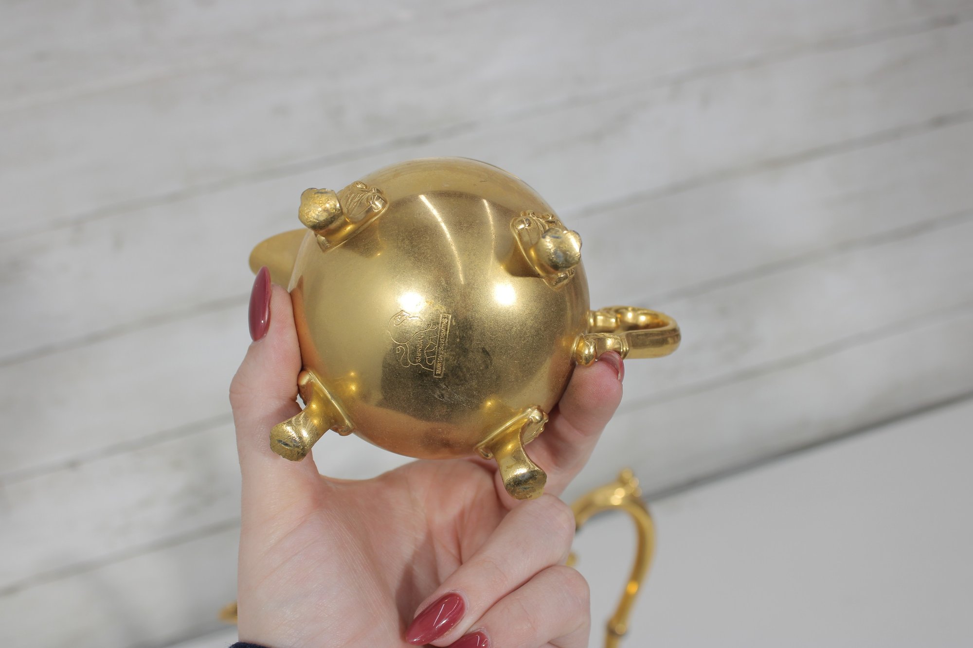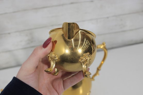 The polished gold tone surface reflects beautifully and makes this set perfect for entertaining, display in a china cabinet, or as a decorative accent. Marked Sheridan on the underside, known for producing quality silverplate hollowware.