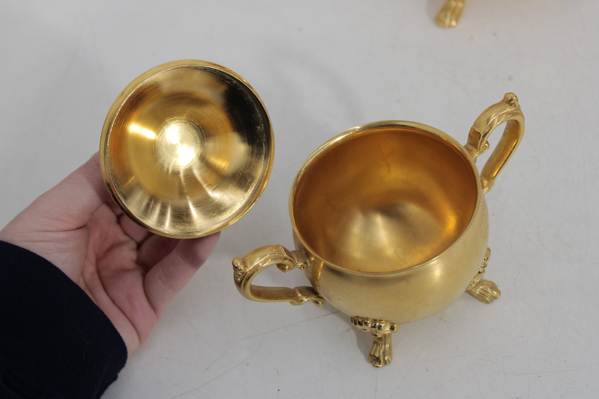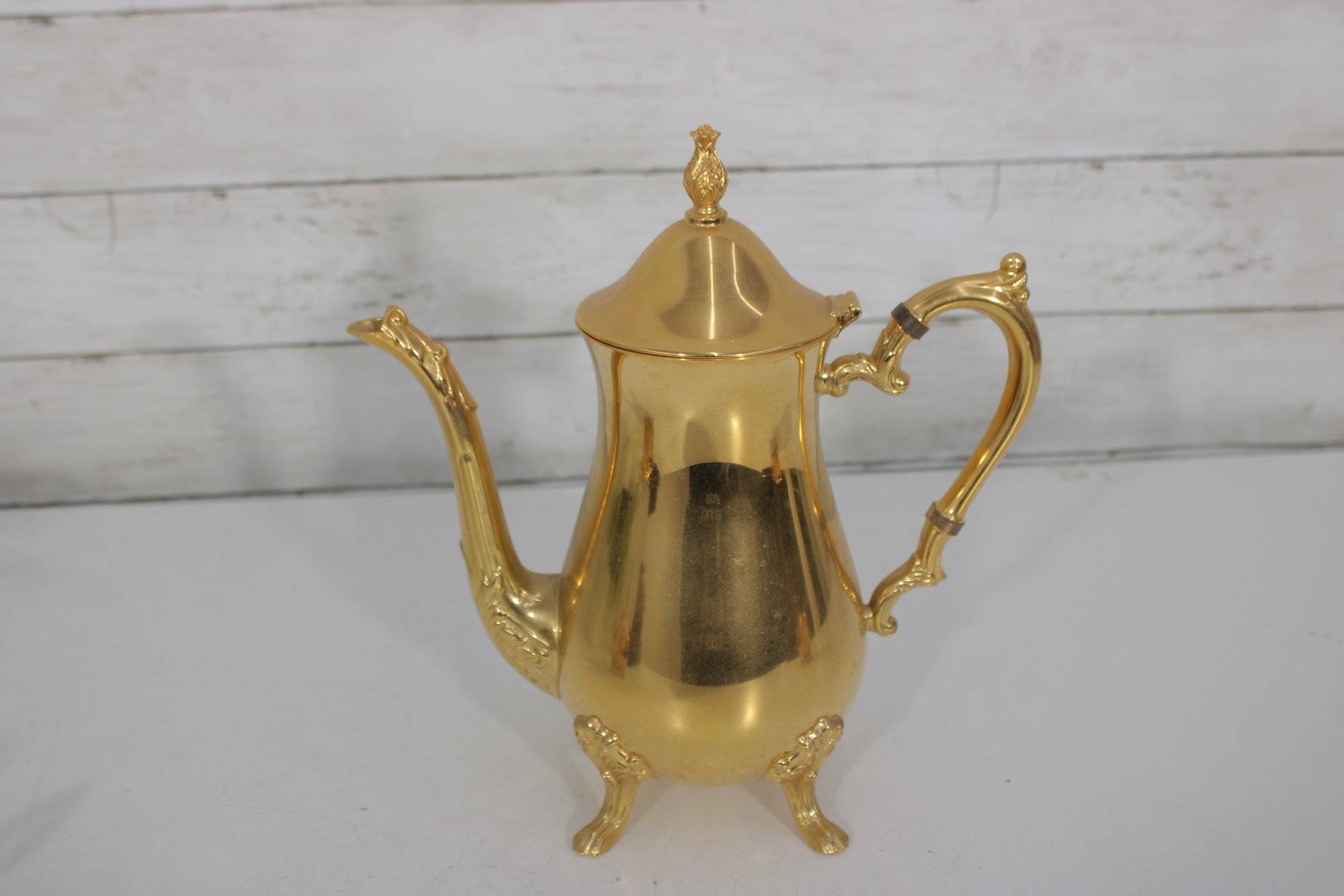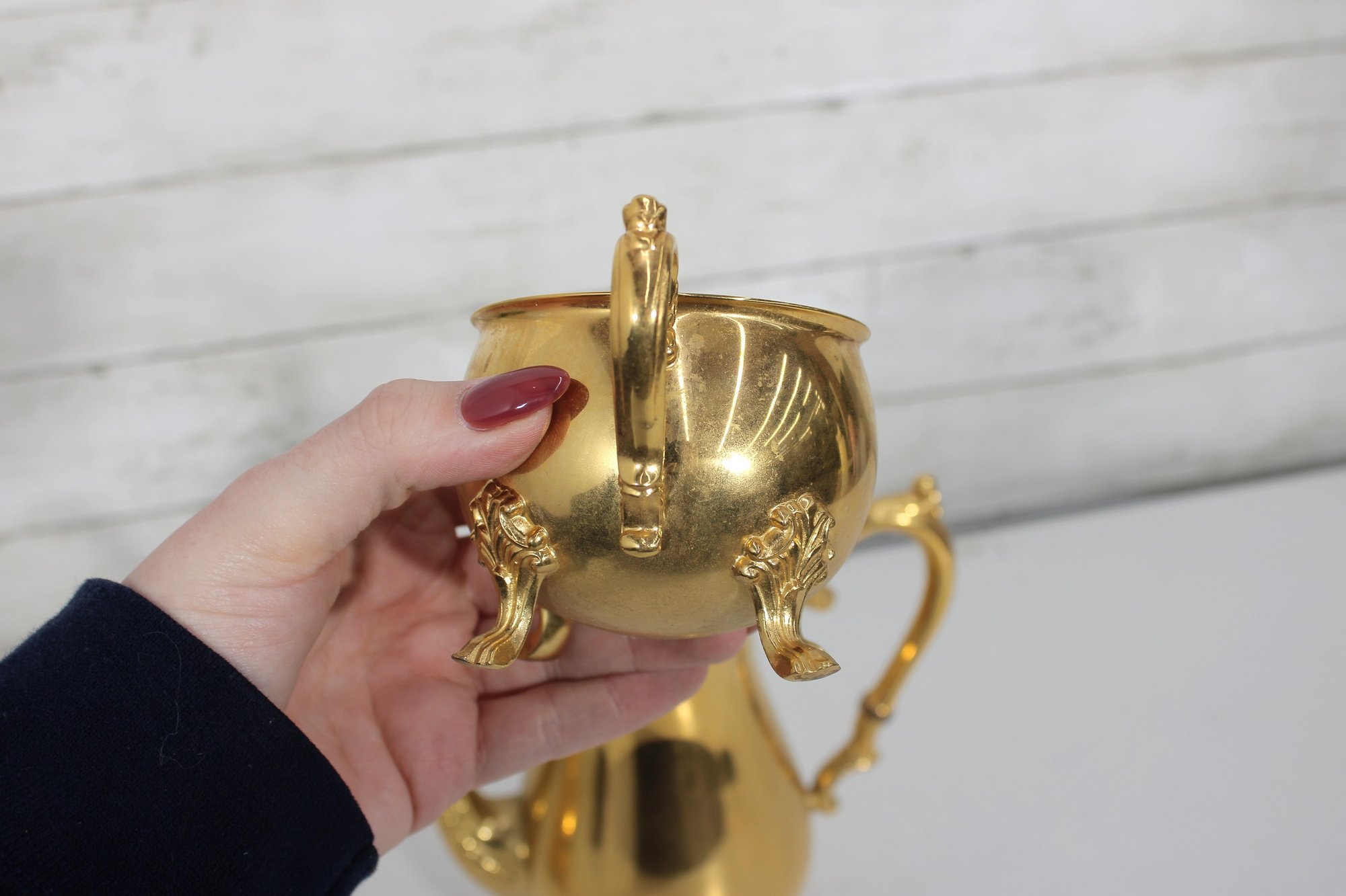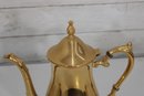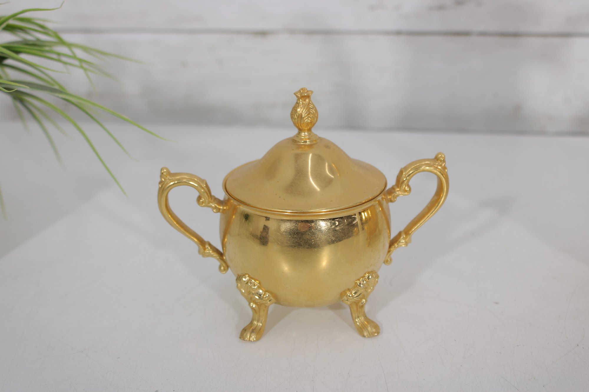 The polished gold tone surface reflects beautifully and makes this set perfect for entertaining, display in a china cabinet, or as a decorative accent. Marked Sheridan on the underside, known for producing quality silverplate hollowware.
