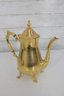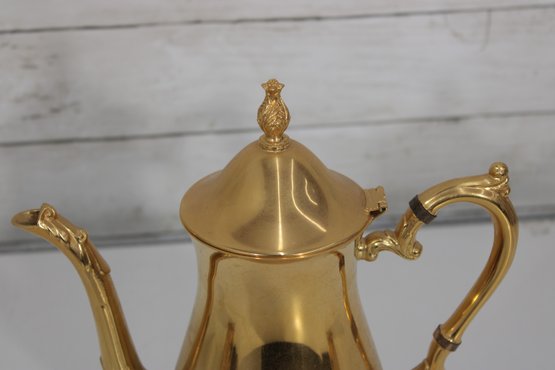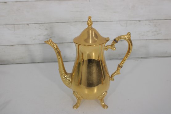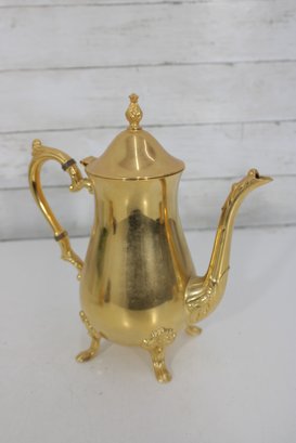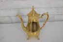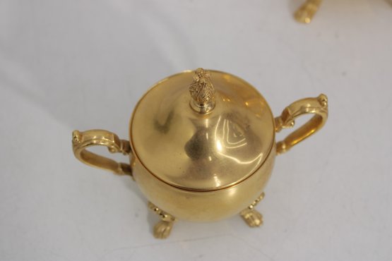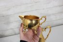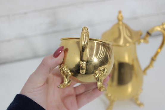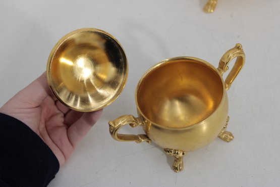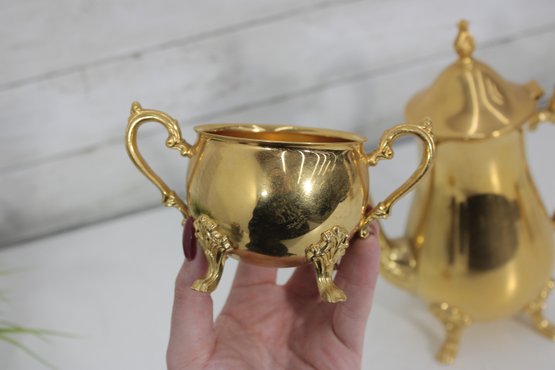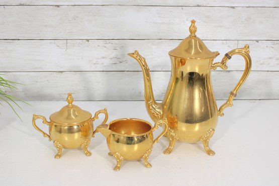 Sheridan silverplate coffee or tea service featuring a striking gold tone finish and classic traditional styling. This three-piece set includes a tall coffee pot, open creamer, and covered sugar bowl, each designed with ornate handles, decorative feet, and graceful lines that add a touch of vintage sophistication to any table or display.