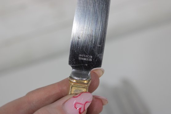 Vintage Insico stainless steel flatware partial set featuring a mix of knives, forks, and spoons with elegant gold-tone handles. This mid-century style flatware displays a classic tapered design, offering a clean and timeless look suitable for everyday use or replacement pieces for an existing set.
