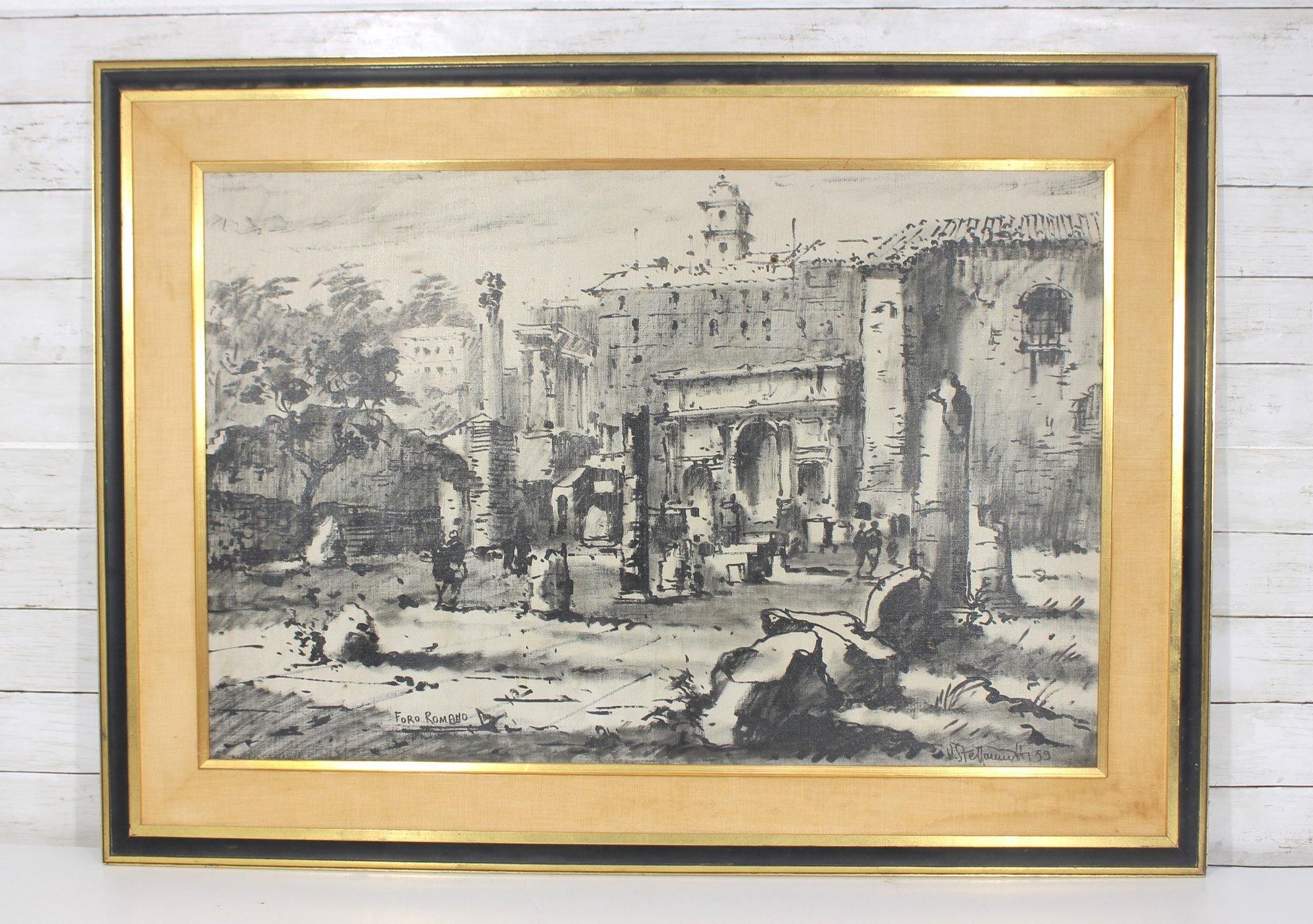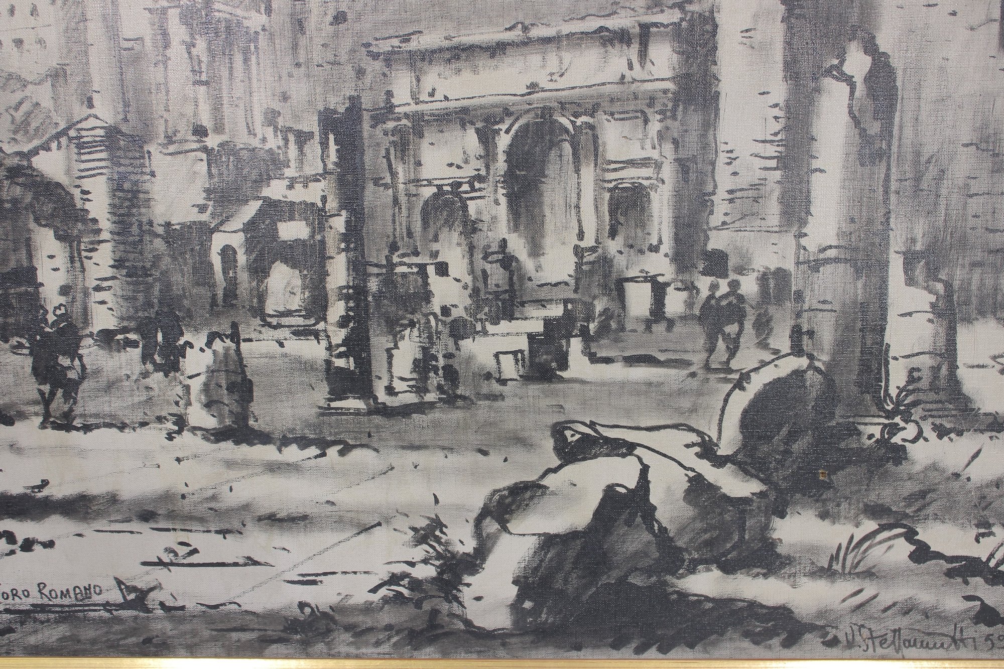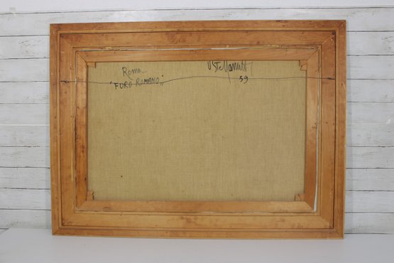 The artwork is signed and dated “U. Stevanazzi ’59” and titled “Roma – Foro Romano.” The composition features impressive architectural detail and atmospheric shading typical of mid-century travel or architectural studies.