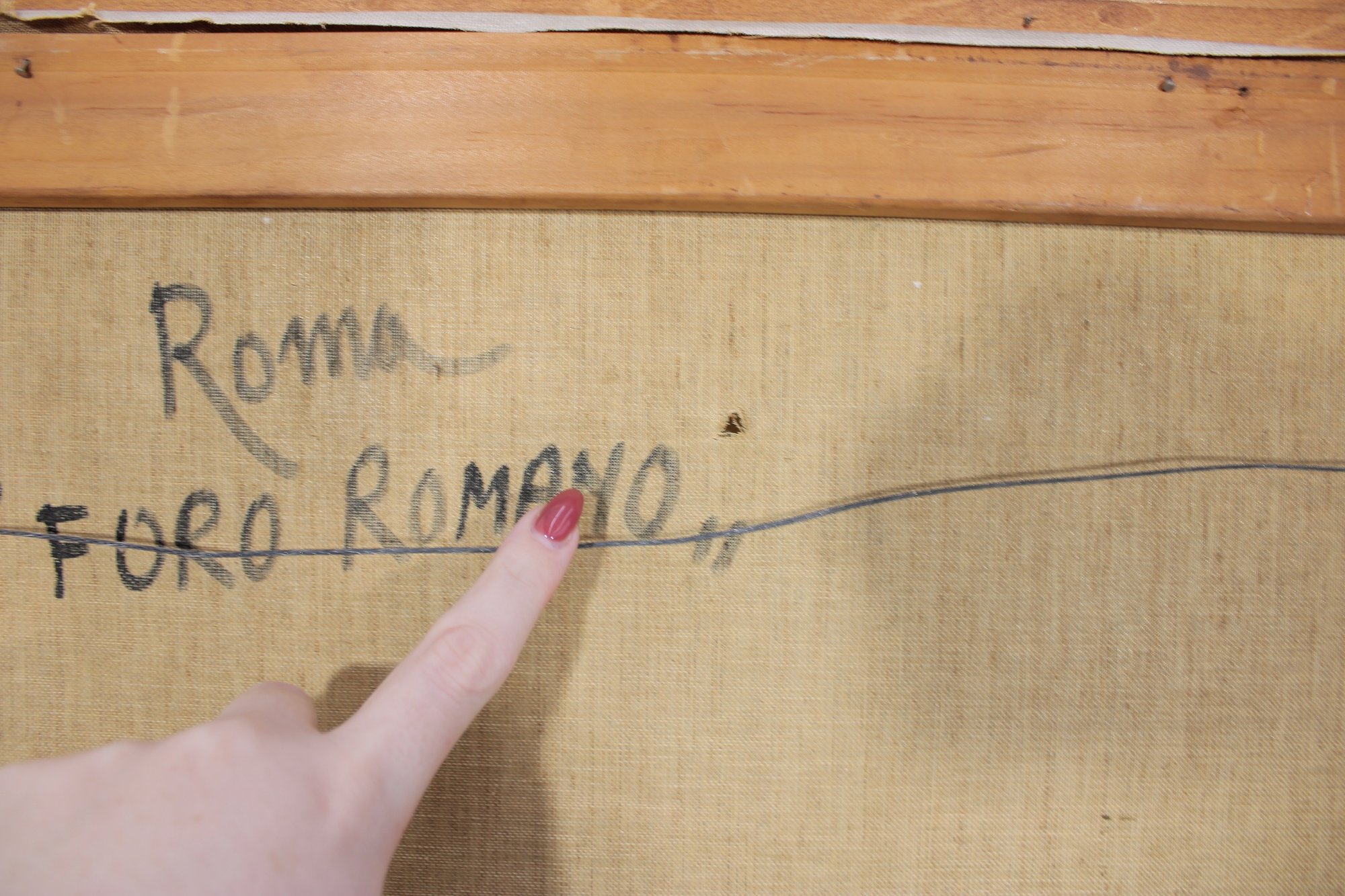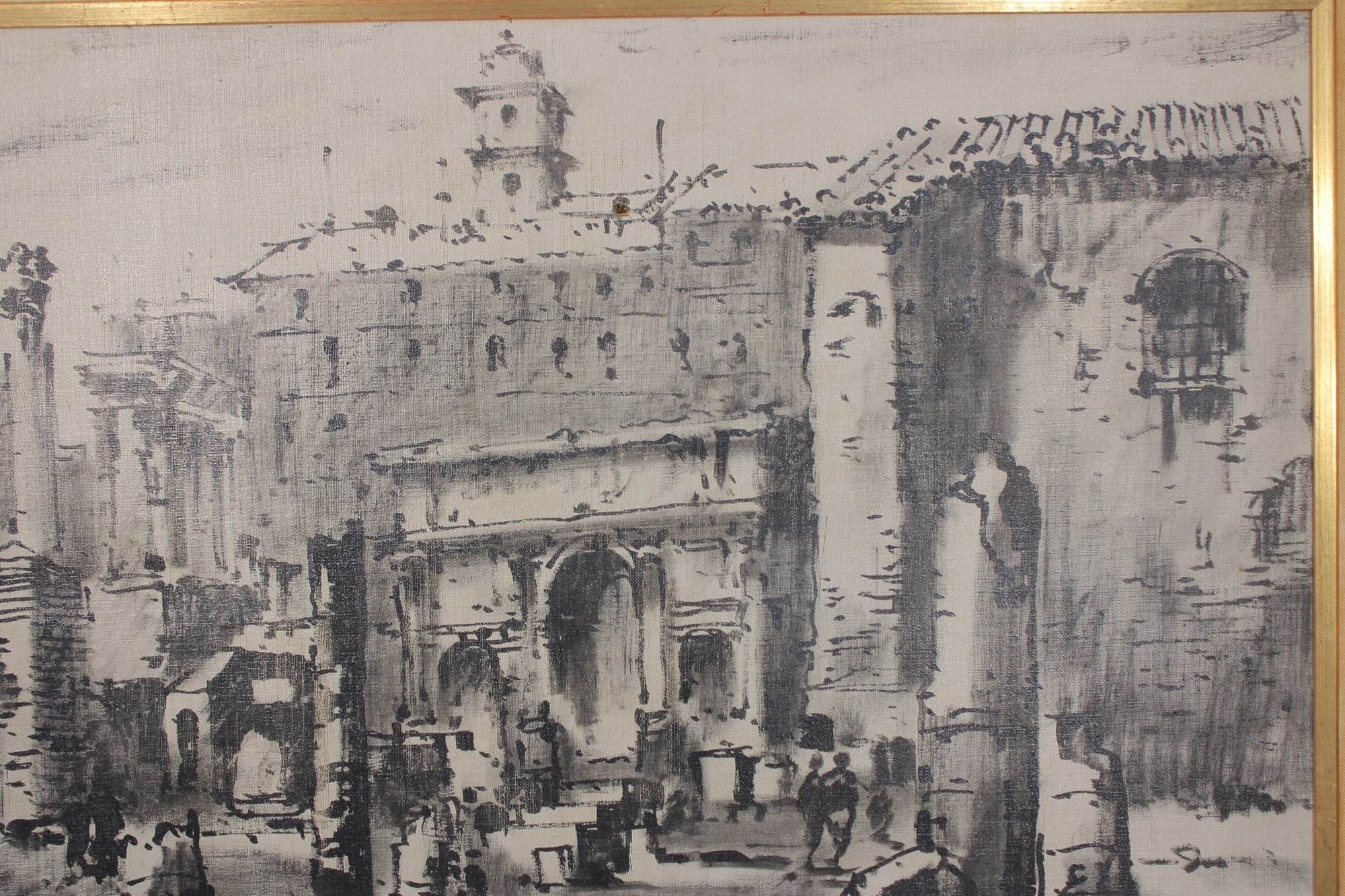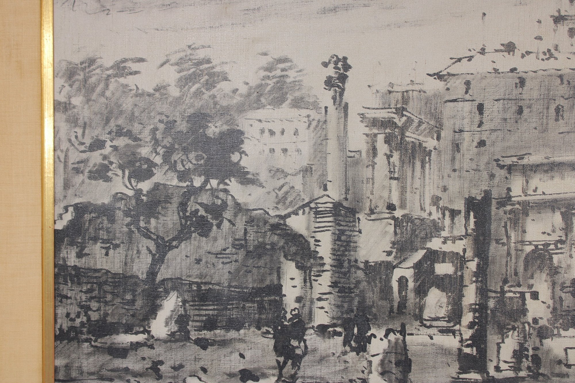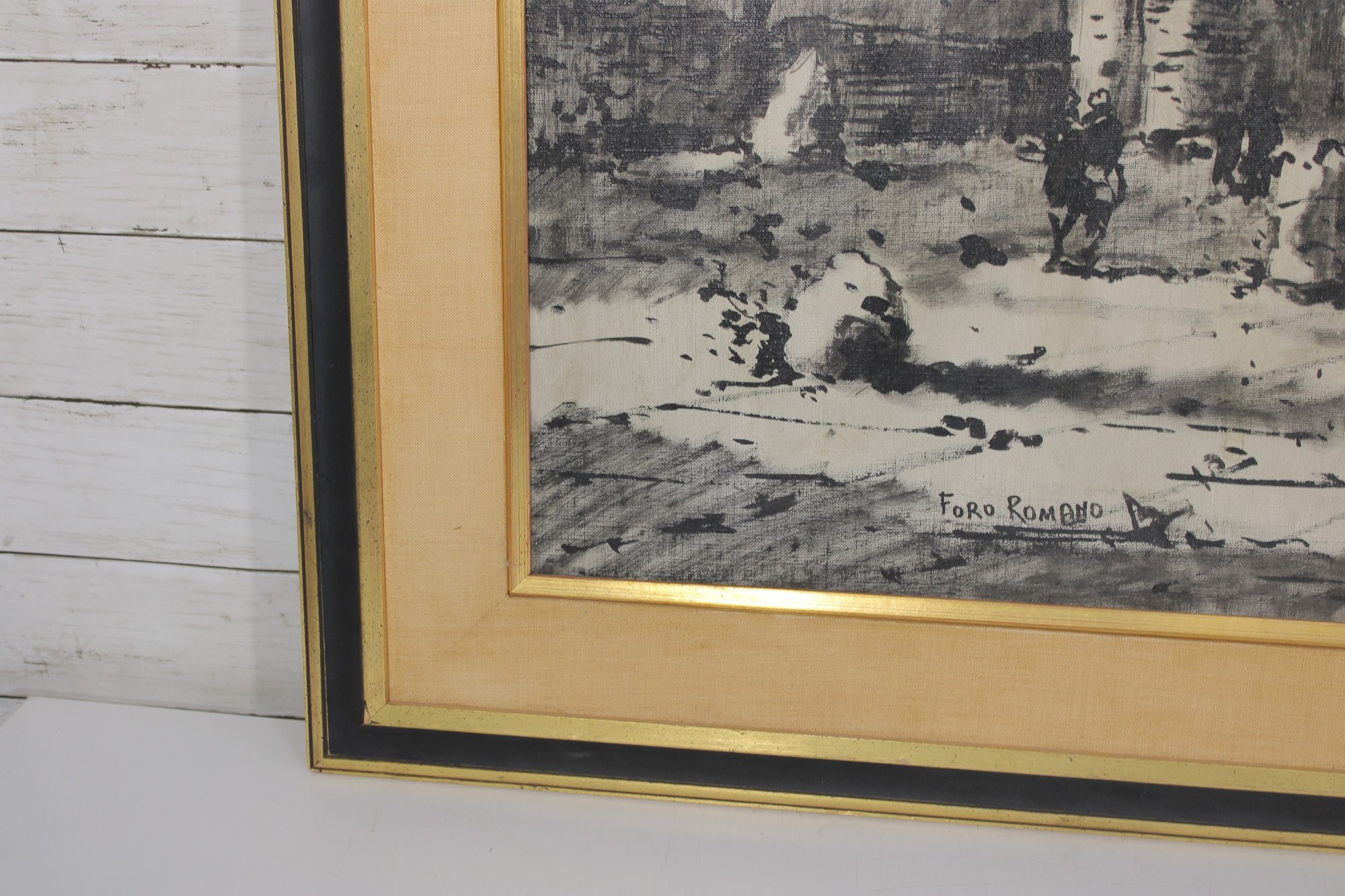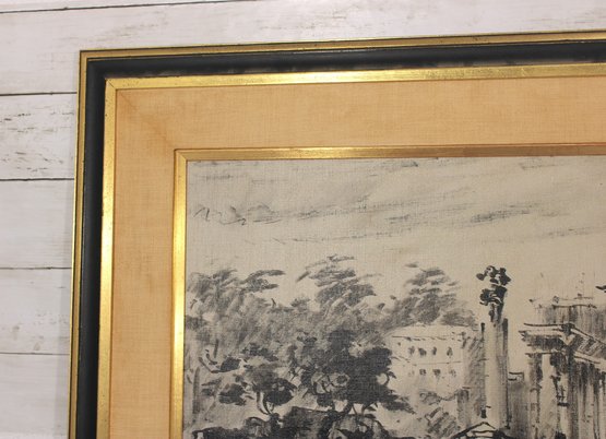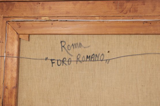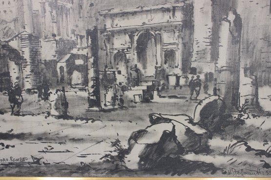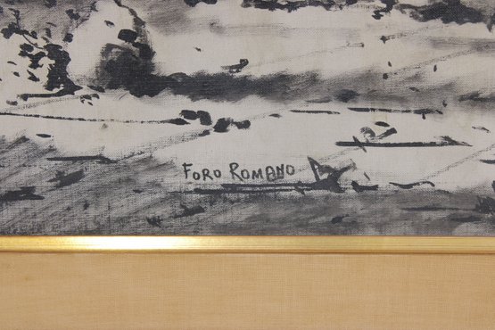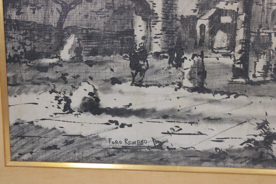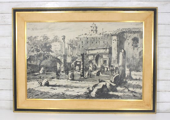 Striking framed architectural watercolor/ink painting titled “Foro Romano” (Roman Forum) depicting a lively historic scene in Rome, Italy. The artwork captures classical ruins, arches, and figures within the famous Roman Forum using expressive ink linework and soft tonal washes, giving the piece a timeless European character.