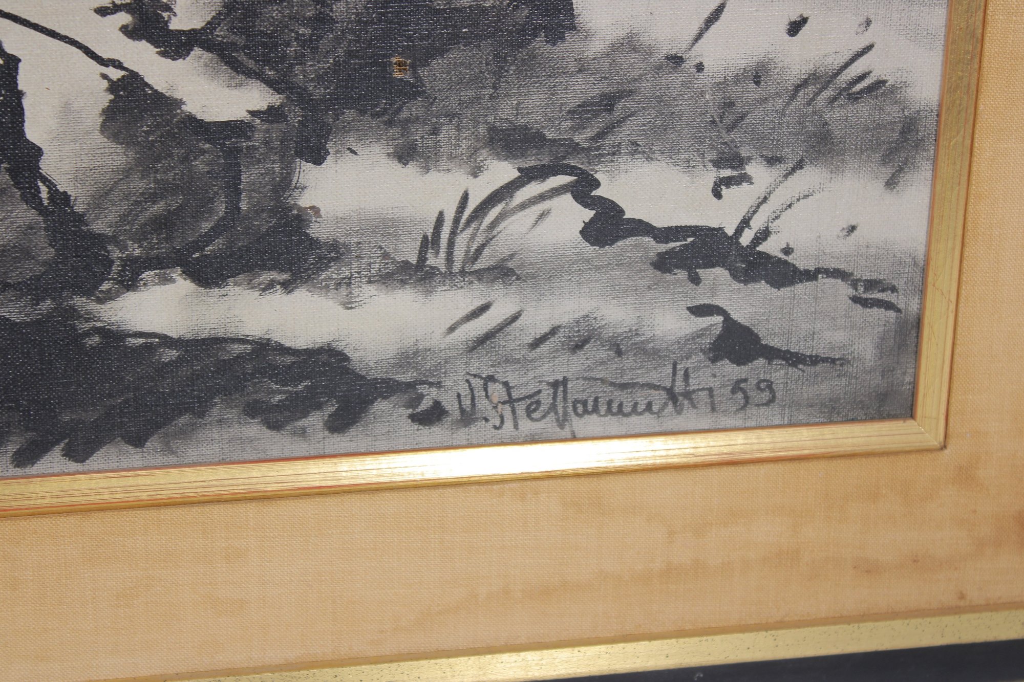 The piece is attractively presented in a gold-tone and dark accent frame with wide matting,