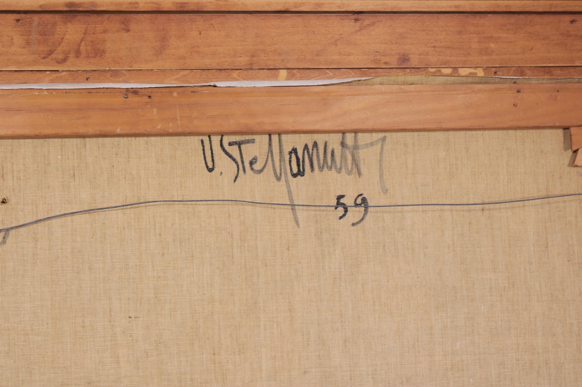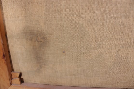 There is a tiny hole visible in the artwork along with light wear consistent with age. Frame shows minor wear.