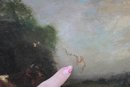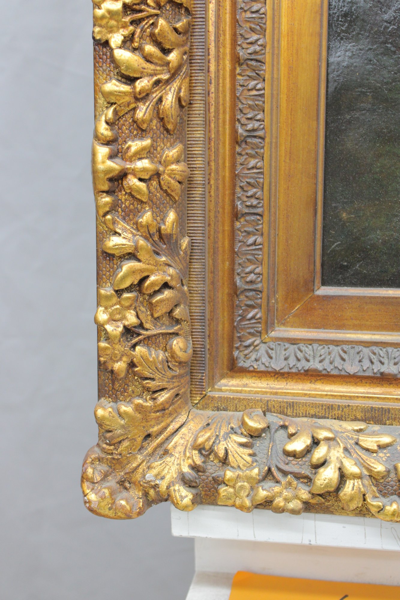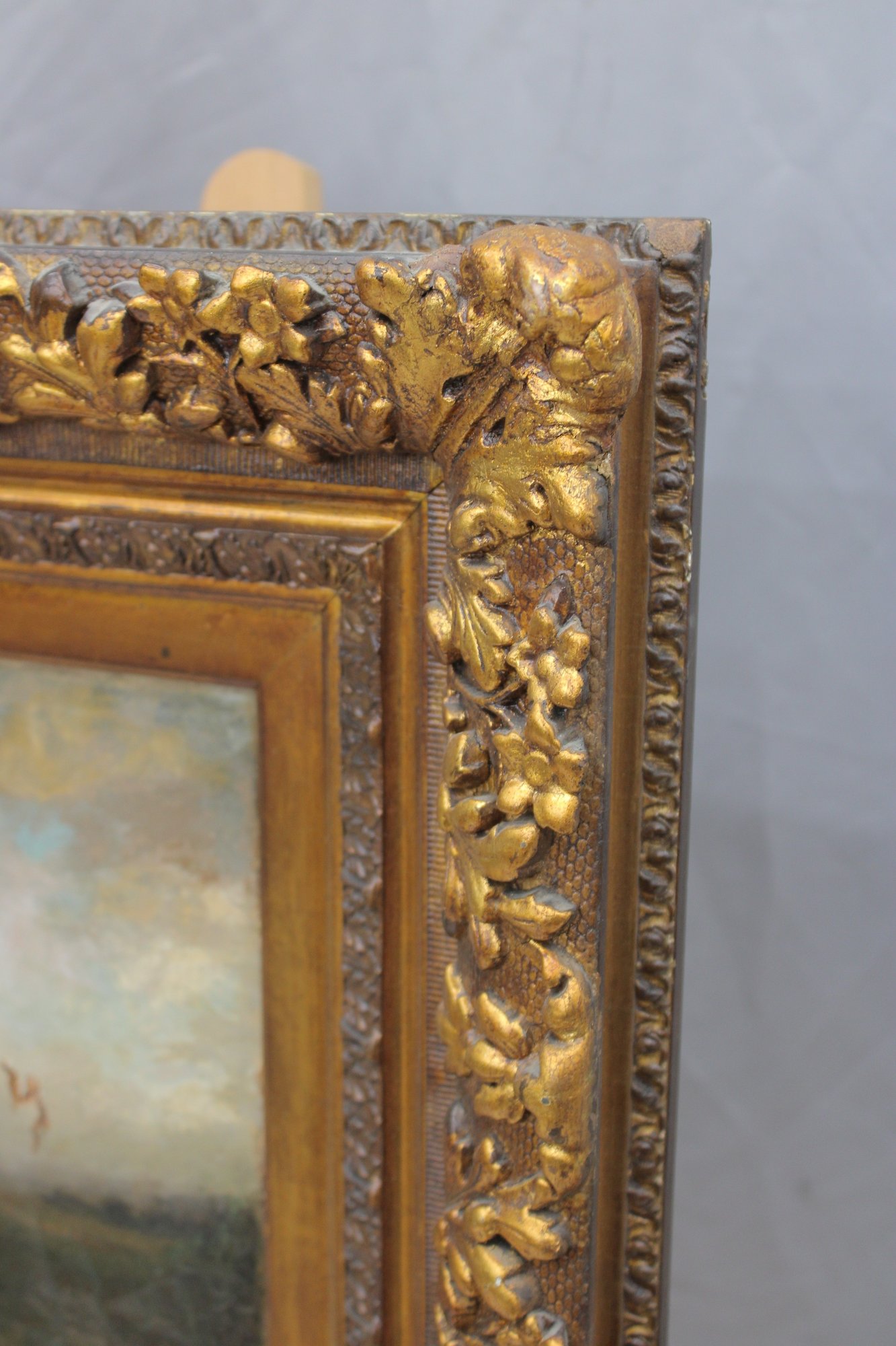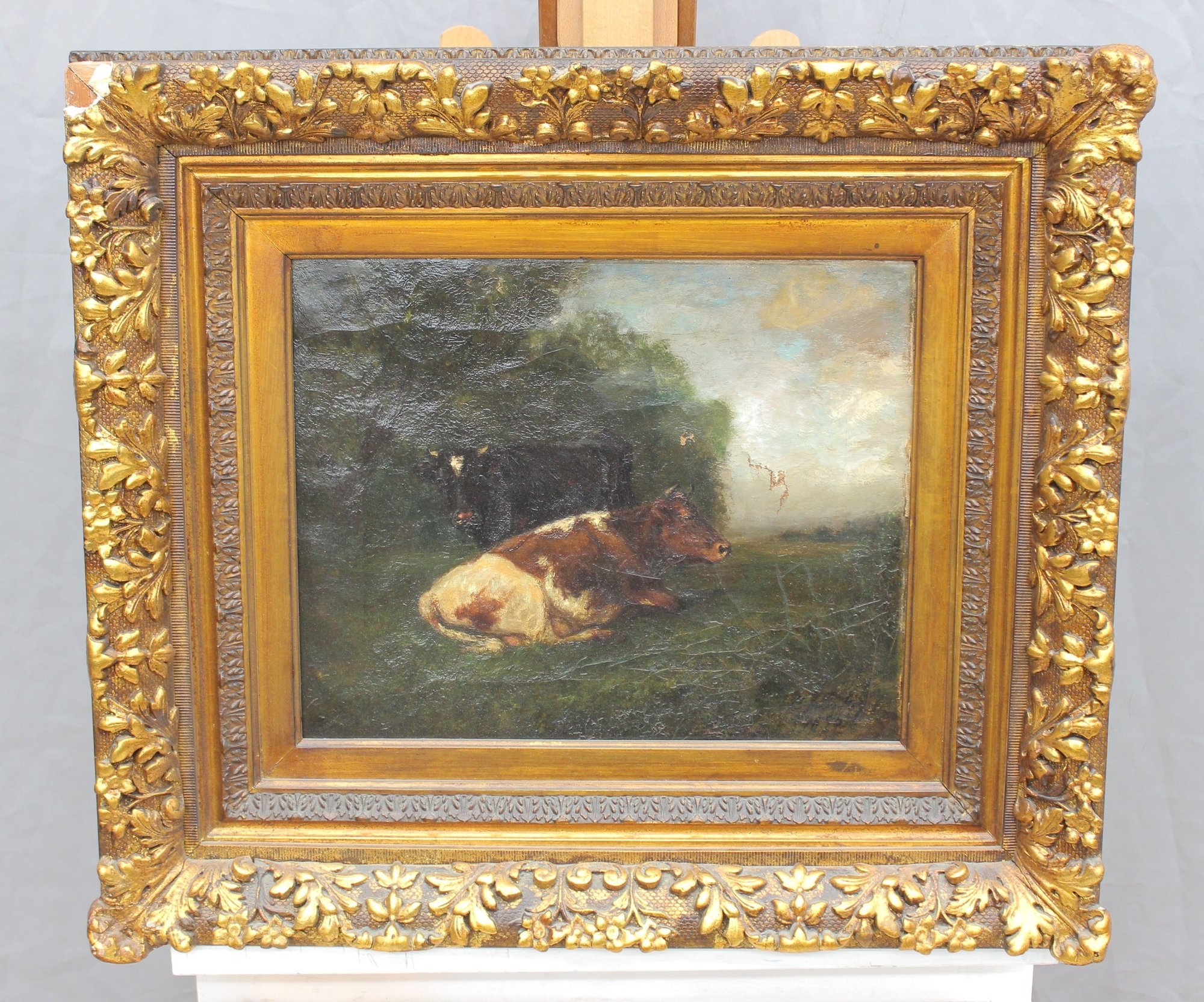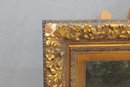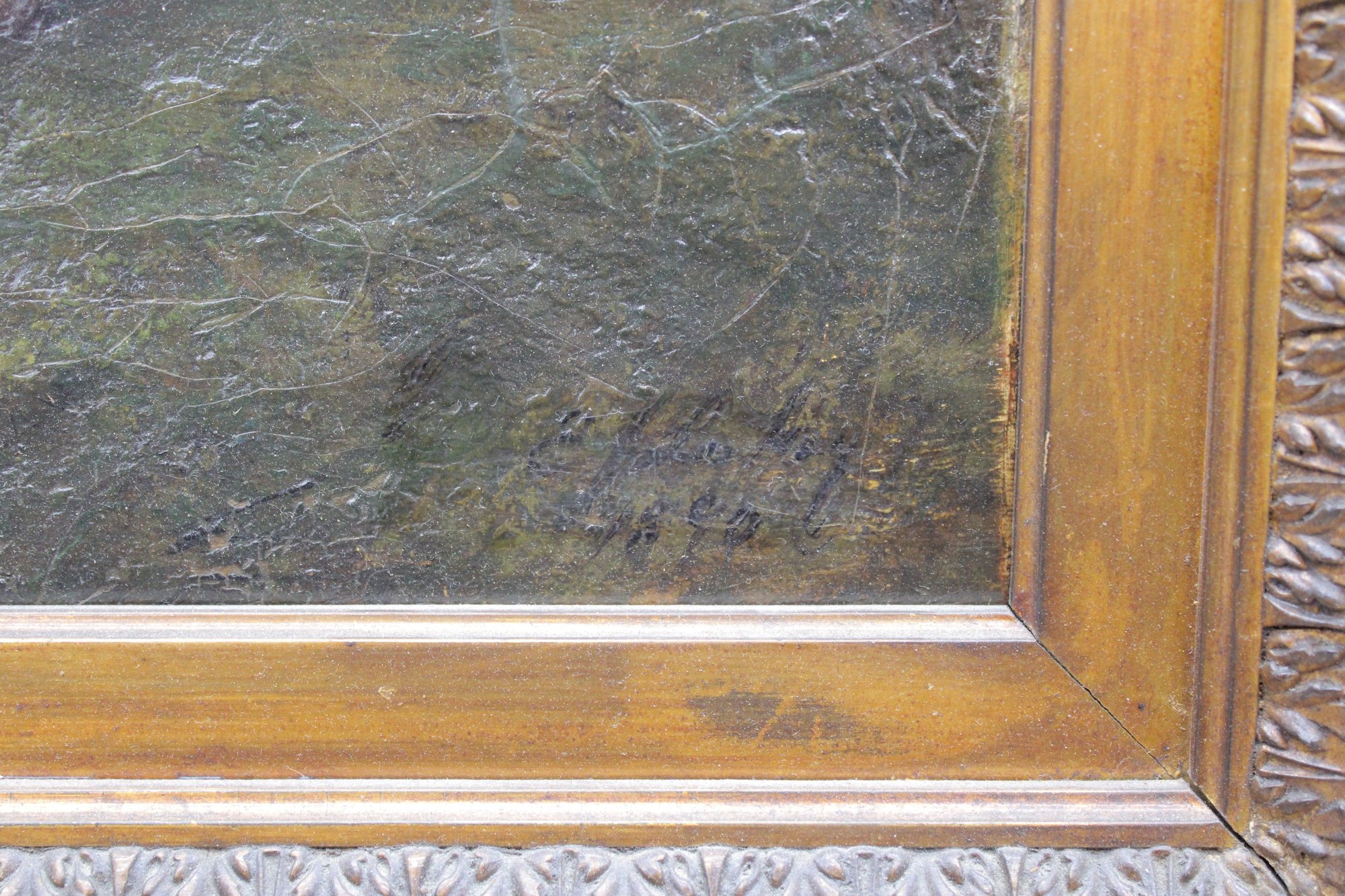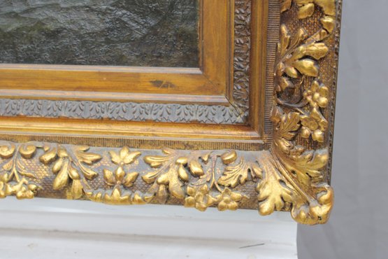 The painting is signed in the lower right (signature appears partially obscured and difficult to decipher). It is housed in an impressive ornate gilded frame with floral and foliate decoration, which strongly complements the period character of the work and adds substantial visual impact.
