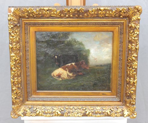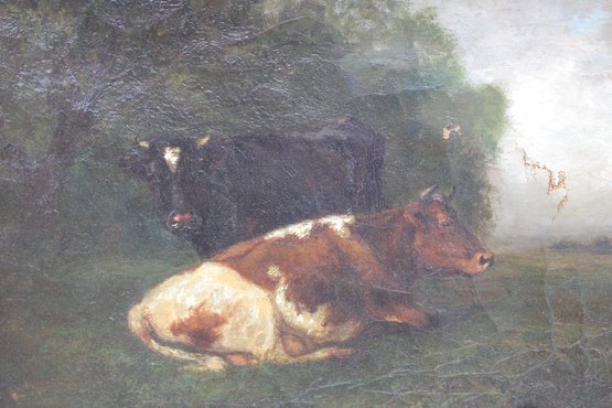 signed oil on canvas painting depicting a tranquil pastoral scene with resting cattle beneath trees, rendered in a naturalistic European style. The artist demonstrates confident brushwork and a sensitive handling of light and atmosphere, particularly in the sky and landscape, giving the composition a calm, timeless presence.