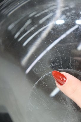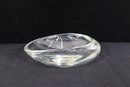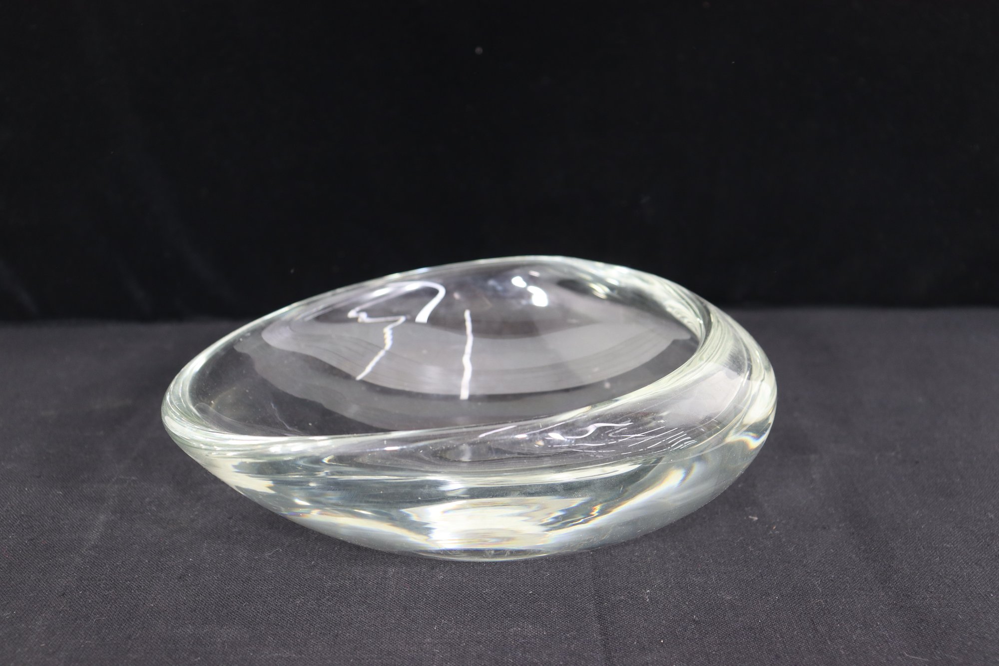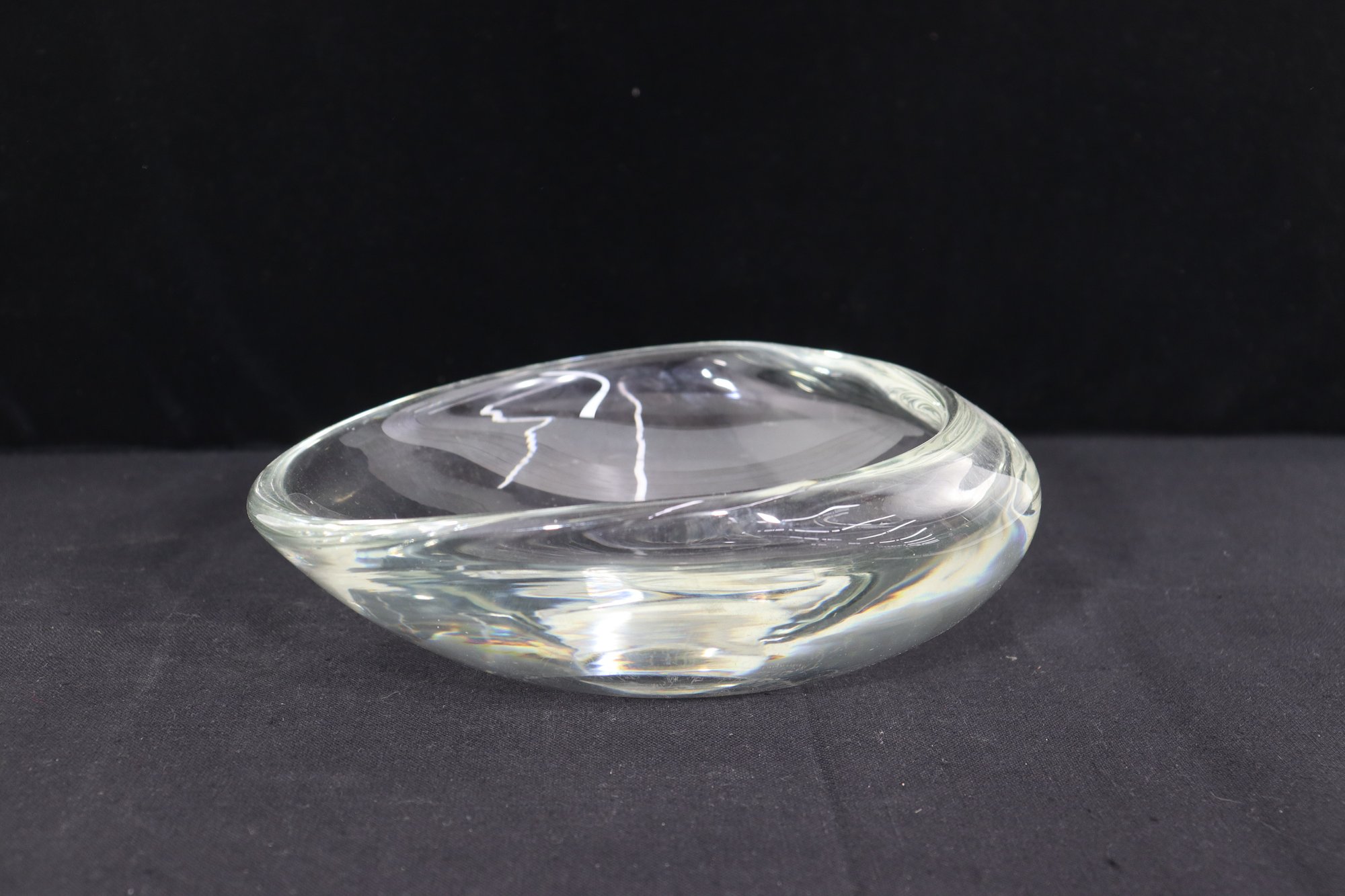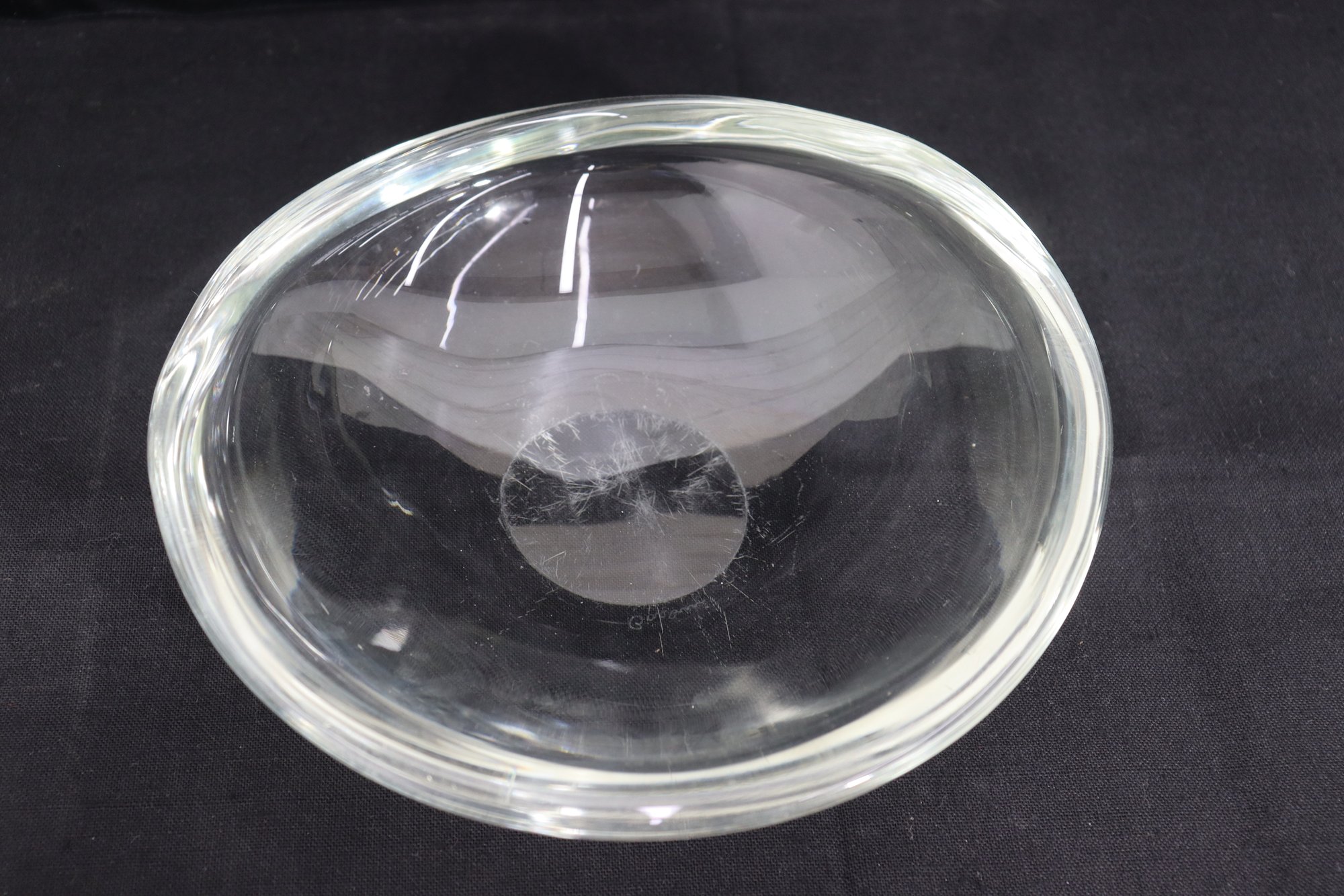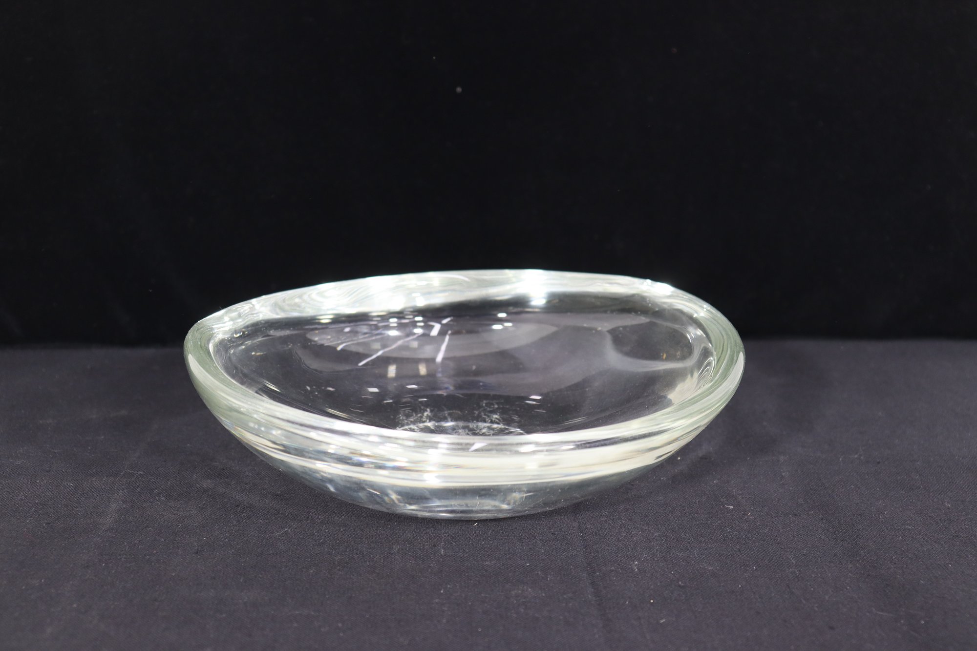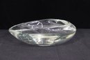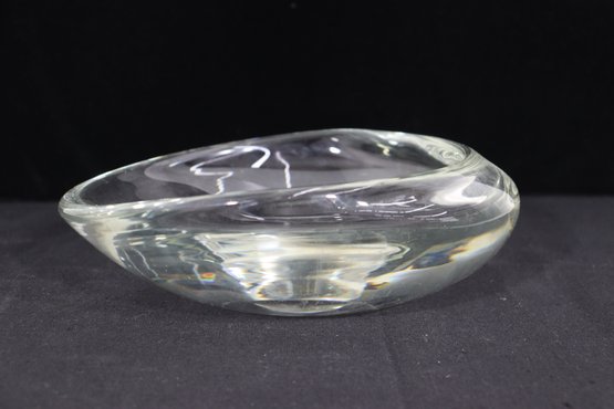 Stunning signed art glass freeform bowl marked . Beautiful sculptural organic shape with thick clear glass and smooth polished finish. Measures approx. 3”H x 9.5”W x 9.5”D.