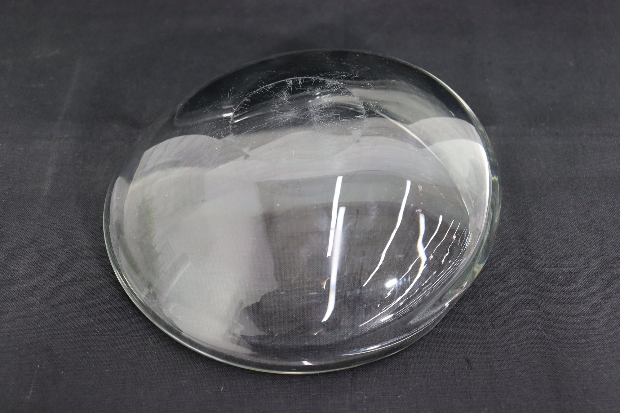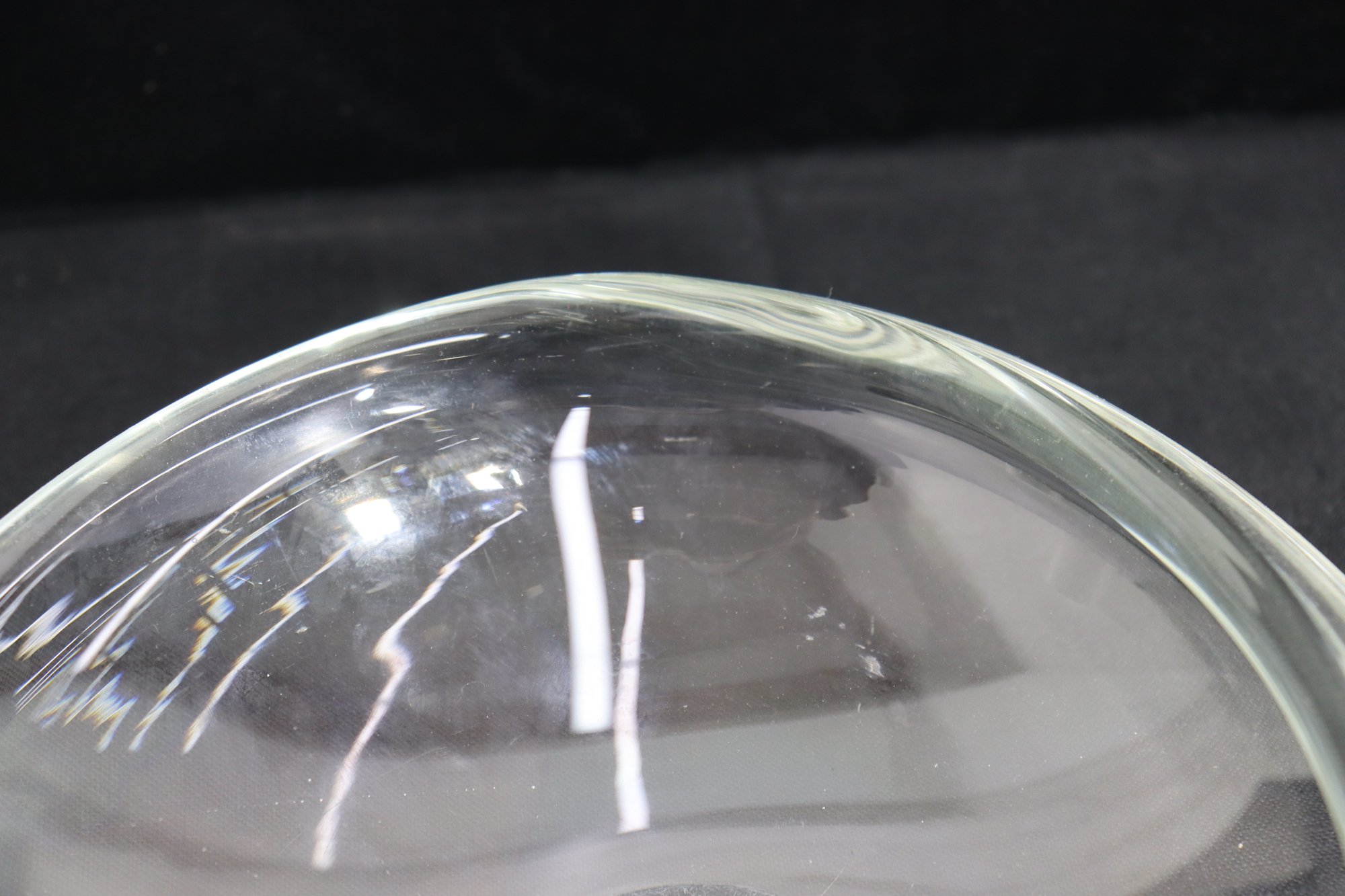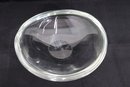 This piece displays wonderfully as a centerpiece bowl, console bowl, modern art glass accent, vanity dish, or shelf decor. High quality heavy glass construction with excellent clarity and form.