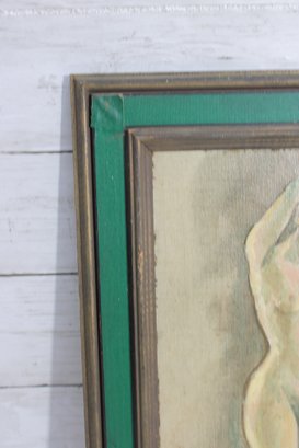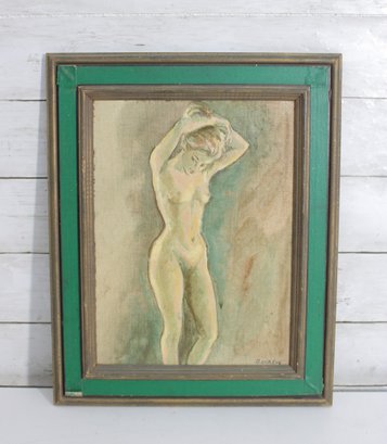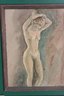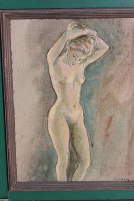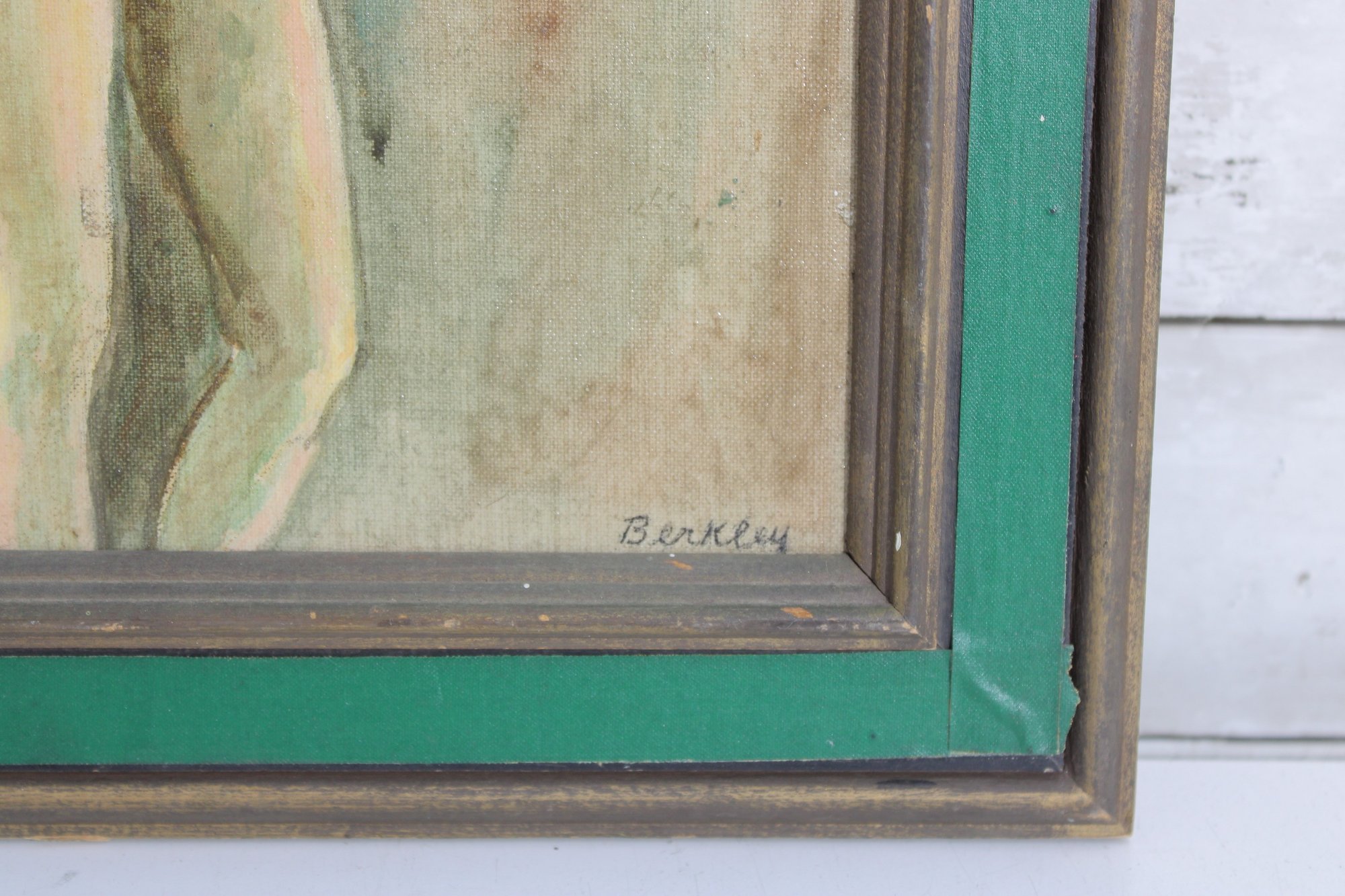 vintage painting signed “Berkley,” featuring a graceful nude female figure rendered in soft, muted tones. The composition captures a classical pose with the subject standing and arms raised, conveying both movement and delicacy.
