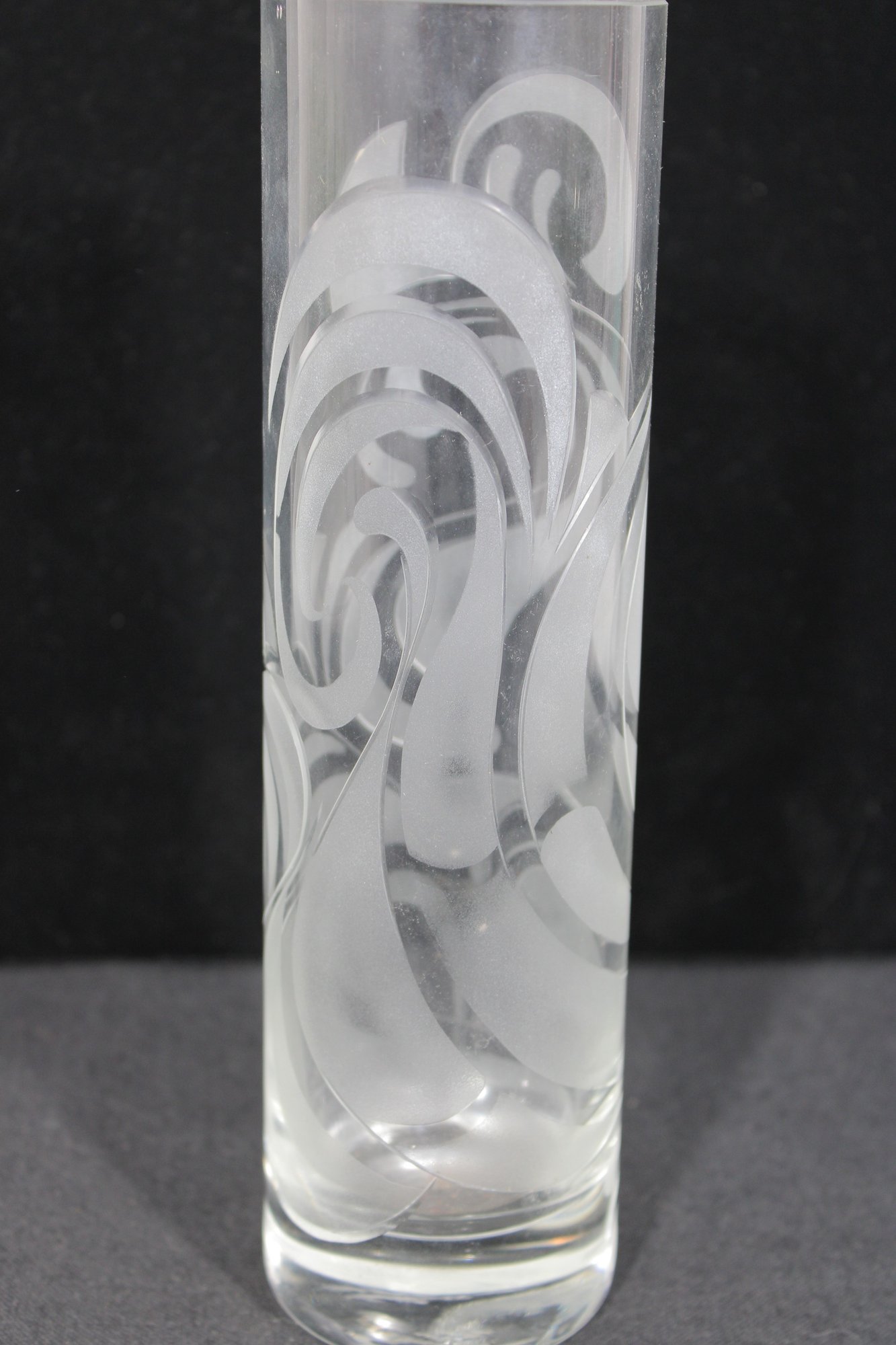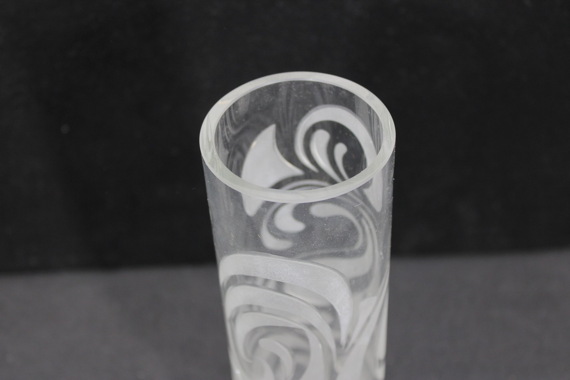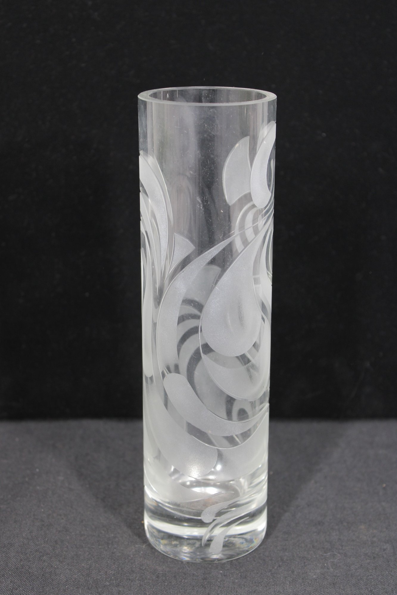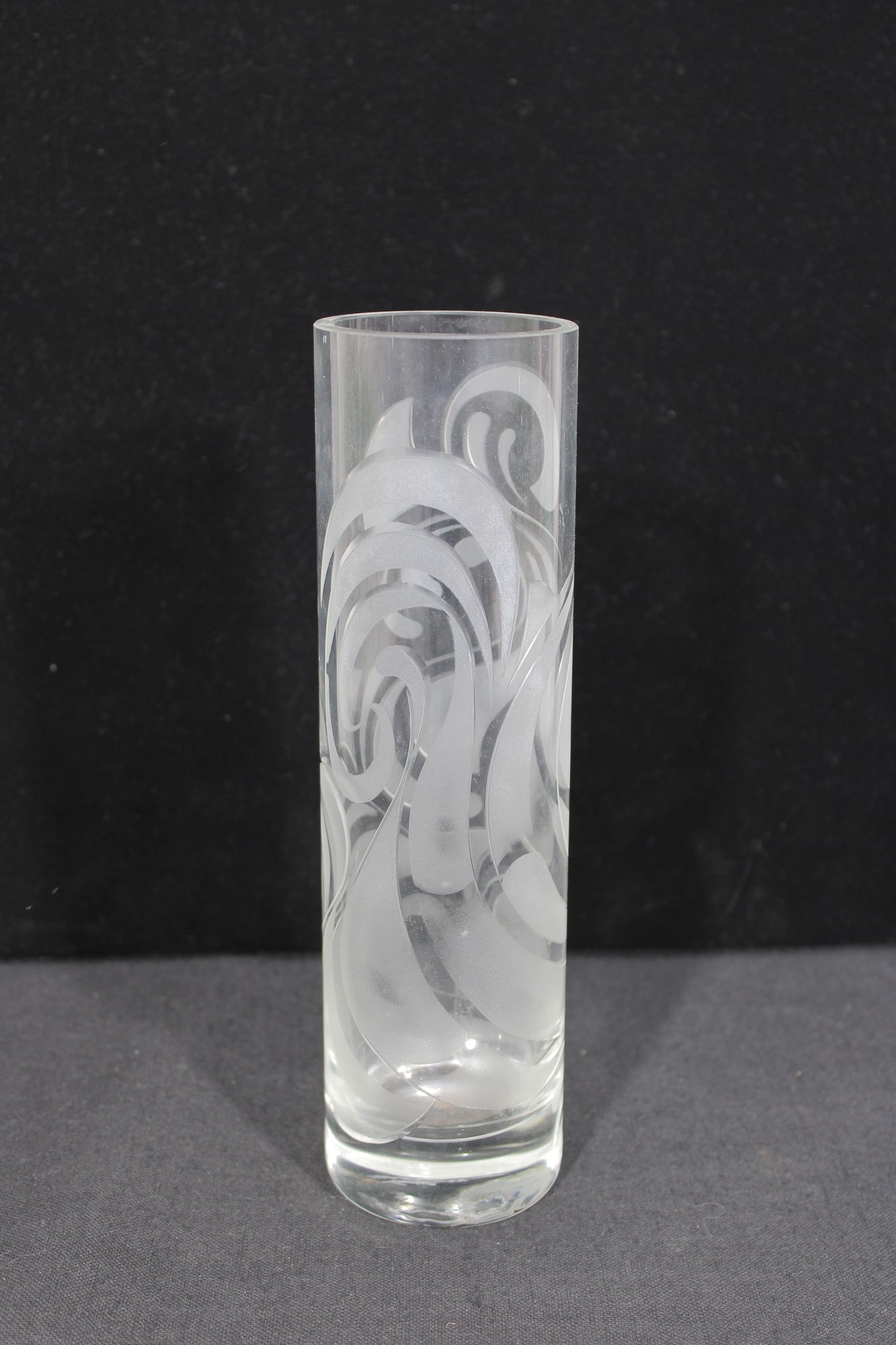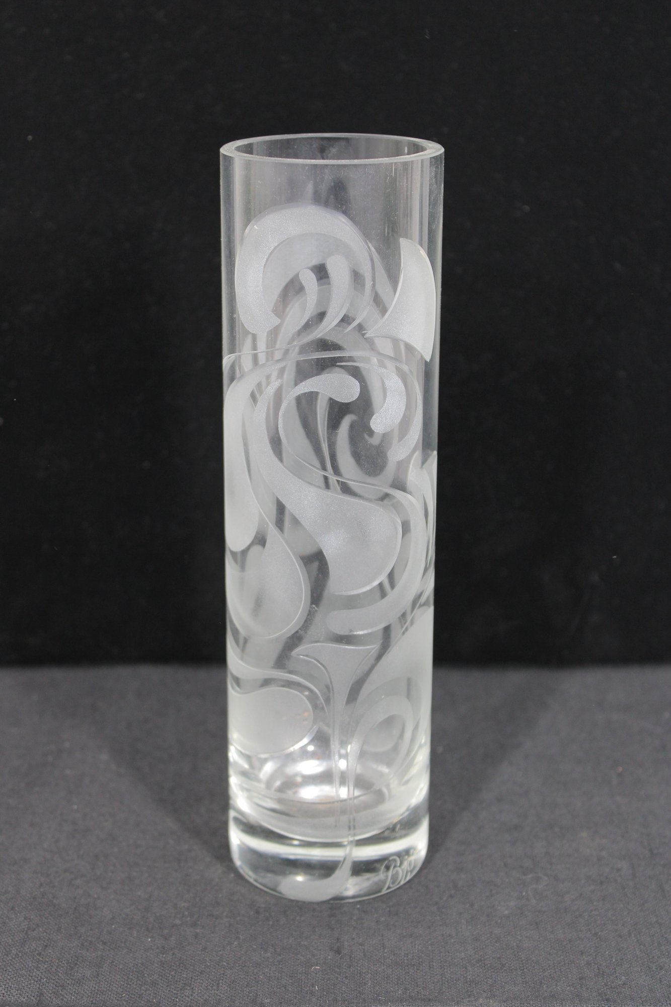 a beautiful signed Bjørn Wiinblad for Rosenthal Studio Linie crystal vase, featuring an elegant etched swirl pattern that wraps fluidly around the cylindrical form.