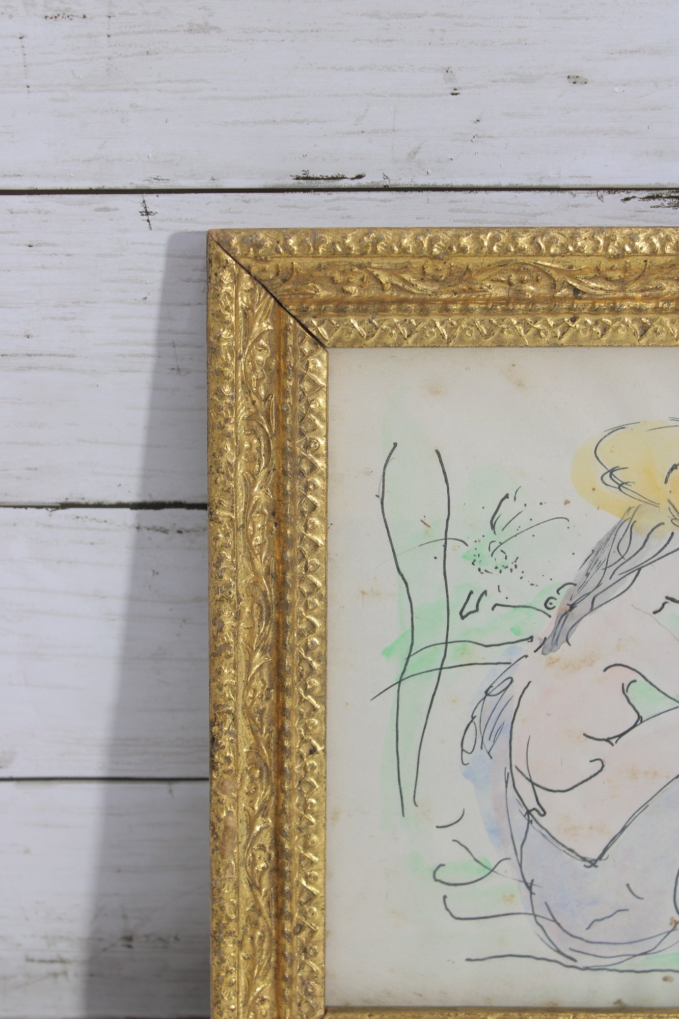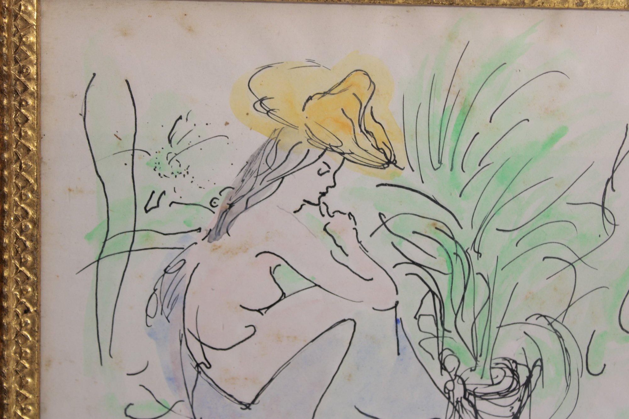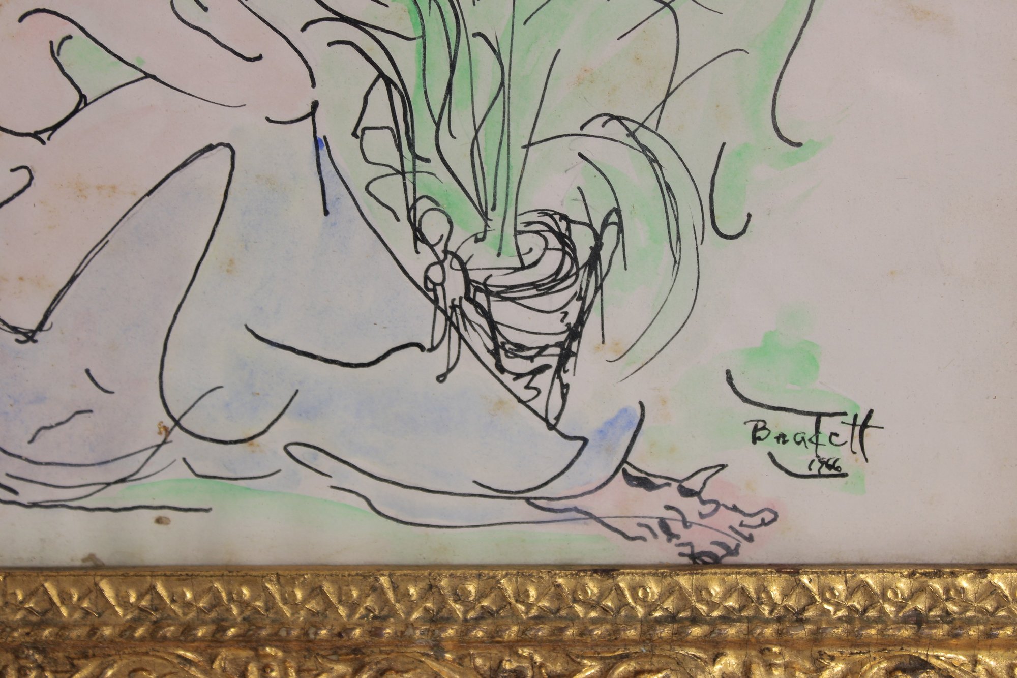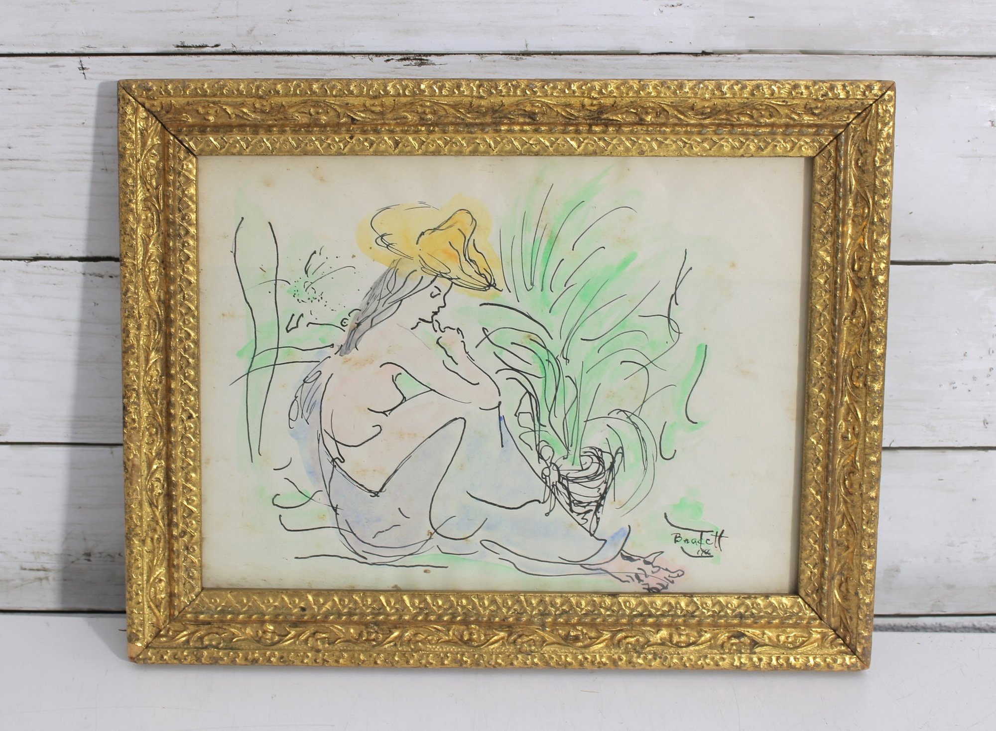 a striking original artwork signed “Bradett” and dated 1966, featuring a graceful nude female figure rendered in a loose, expressive line style. The composition is enhanced with soft washes of color, including subtle greens and yellows, giving the piece a fluid, modernist feel.