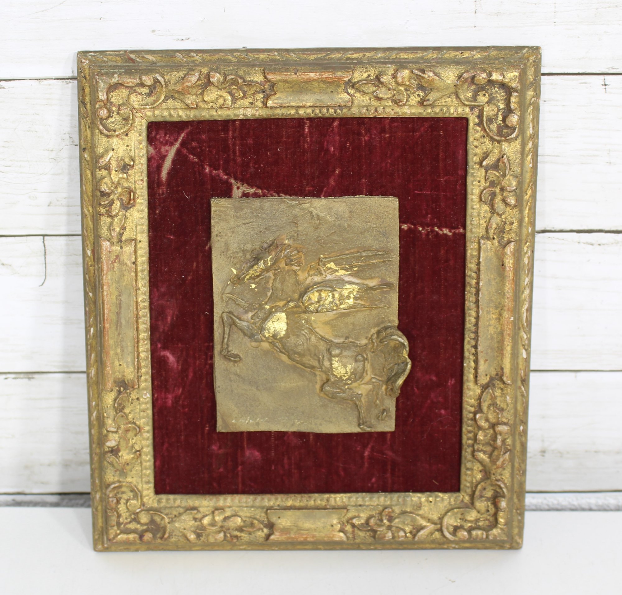 Vintage signed brass relief artwork depicting a dynamic horse and rider scene, beautifully mounted on a deep red velvet background within an ornate gilt frame. The brass panel features intricate detailing and raised textures that capture the motion and energy of the subject. Signature visible on the lower edge of the brass plate (artist name partially legible).