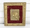 The piece is framed under glass with a richly embossed gold frame, showing light wear and patina consistent with age. The red velvet backing adds warmth and depth to the presentation, complementing the metallic tones of the relief.