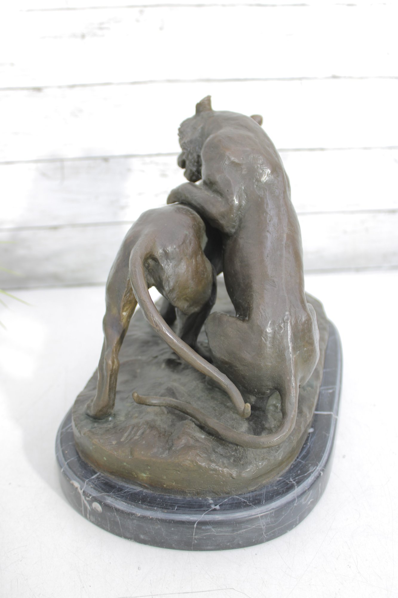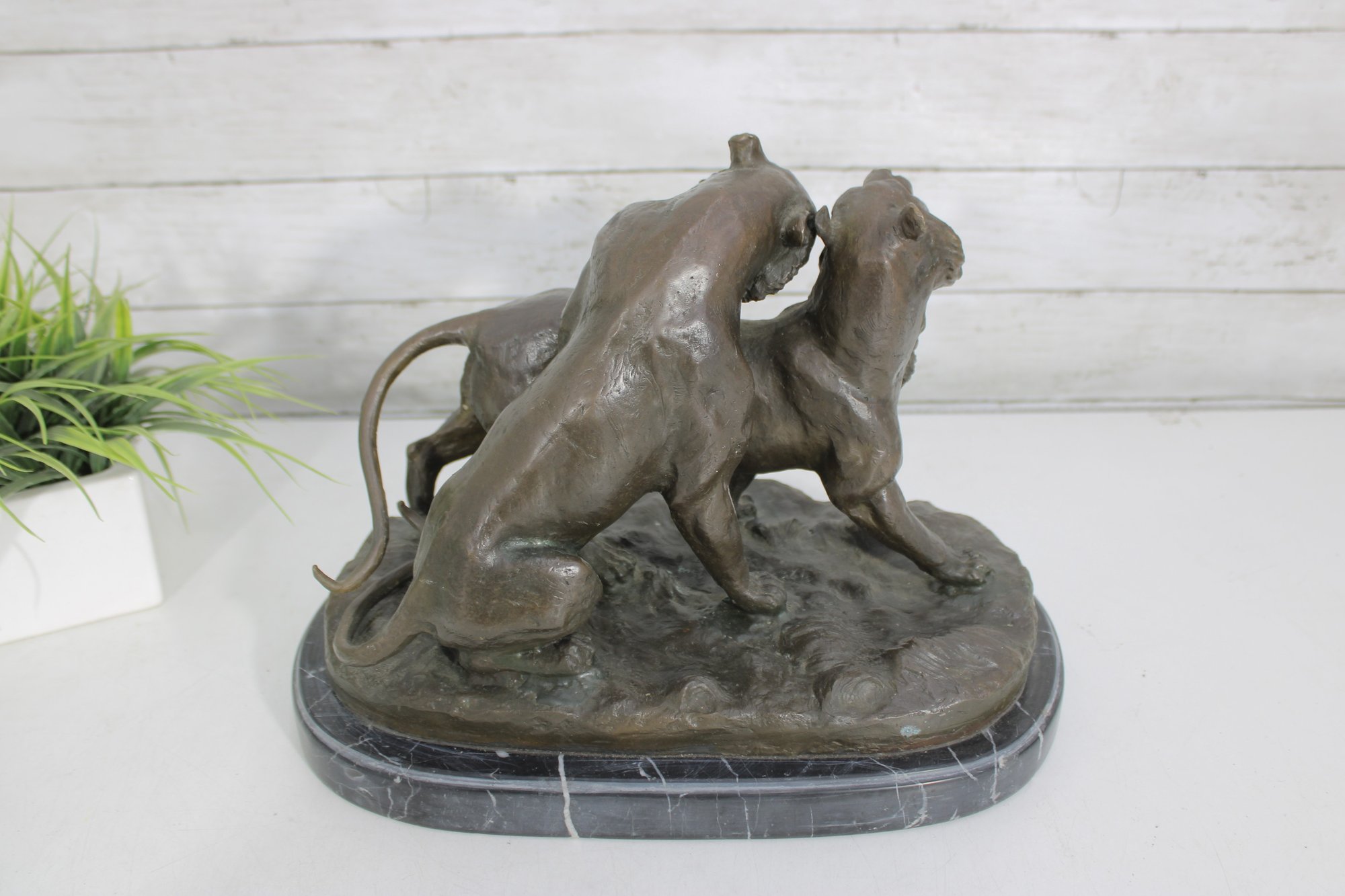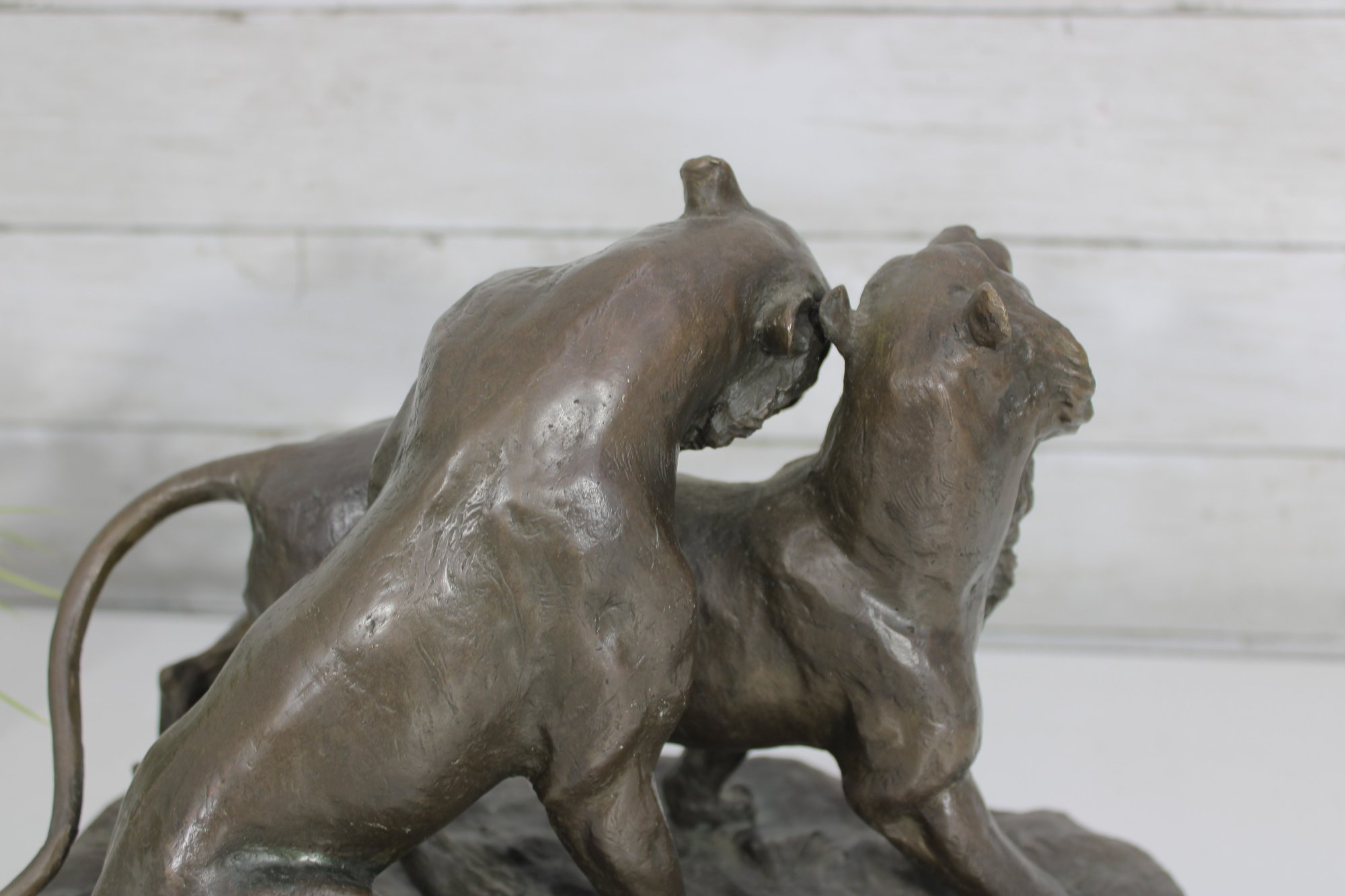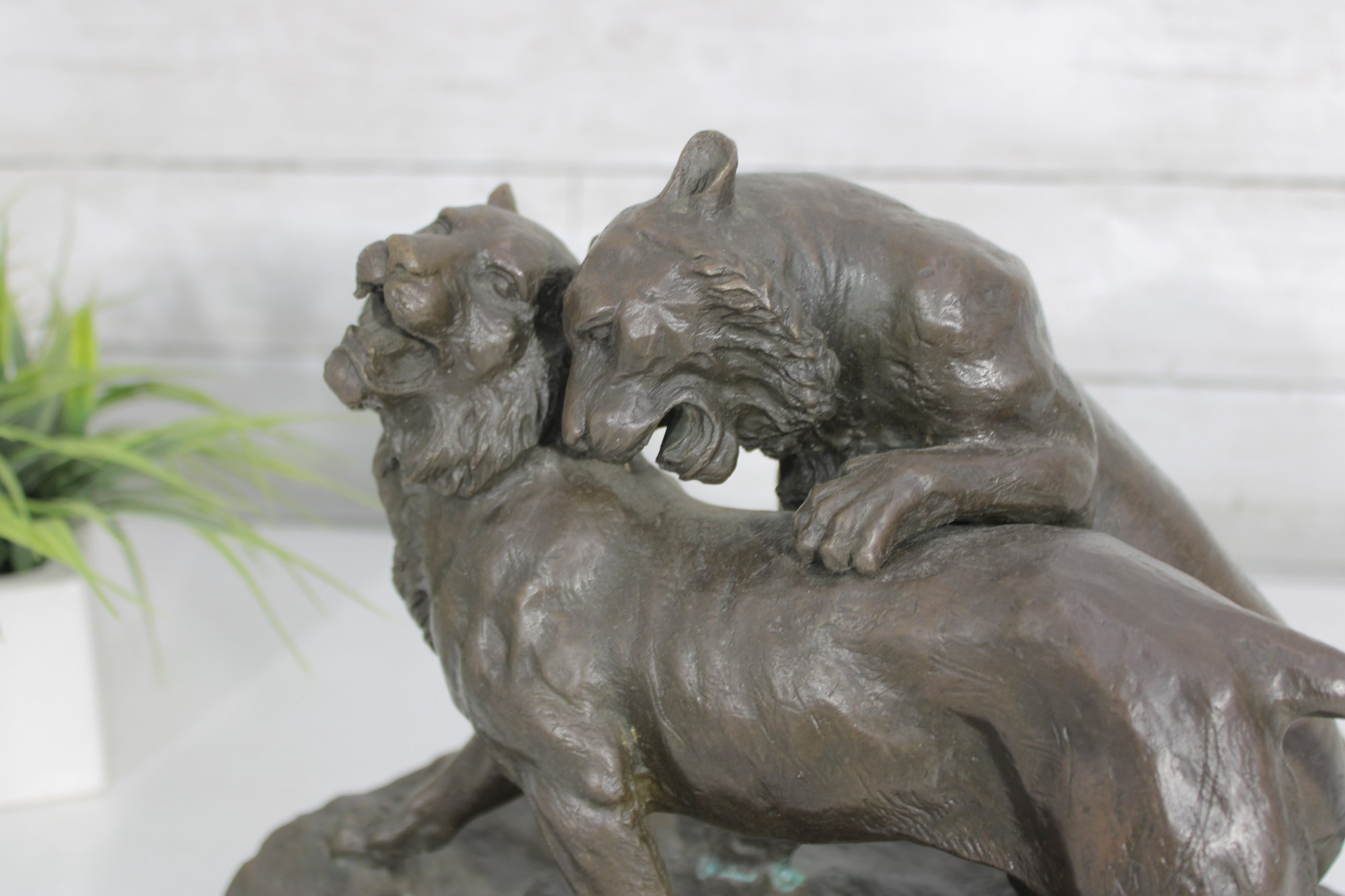 an impressive bronze animalier sculpture depicting a dynamic lion and lioness group, captured mid-interaction with strong movement and expressive realism. The composition conveys power and tension, with finely modeled musculature, textured fur, and naturalistic poses that bring the scene to life.