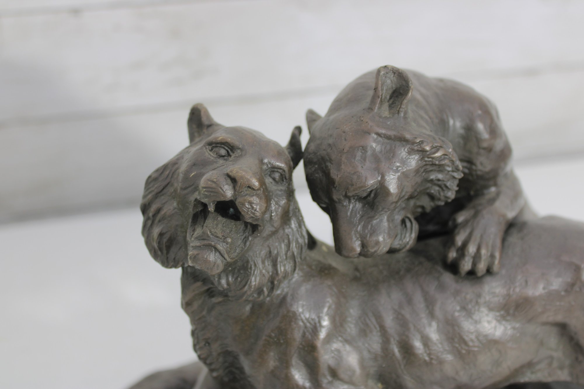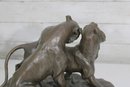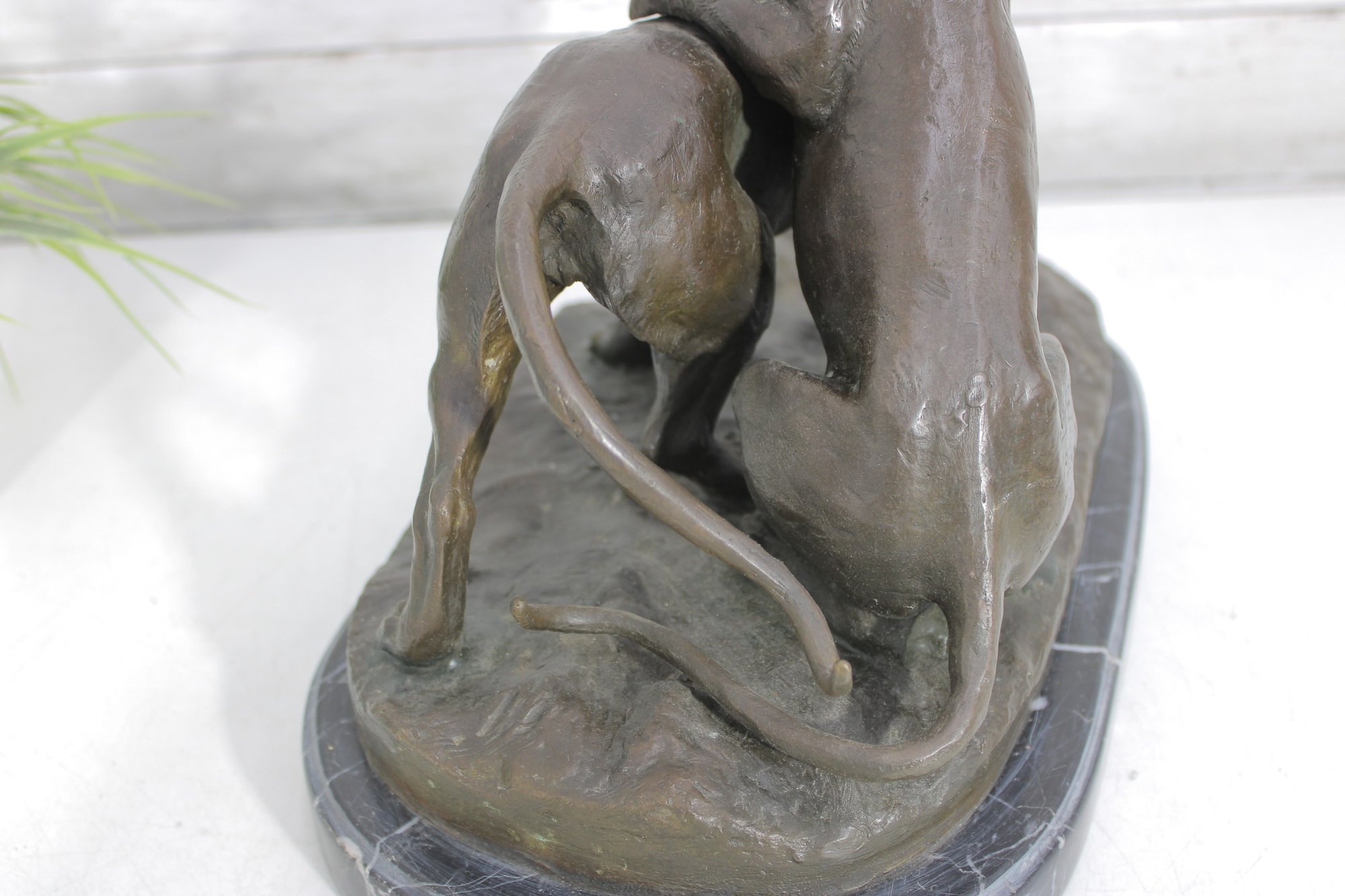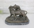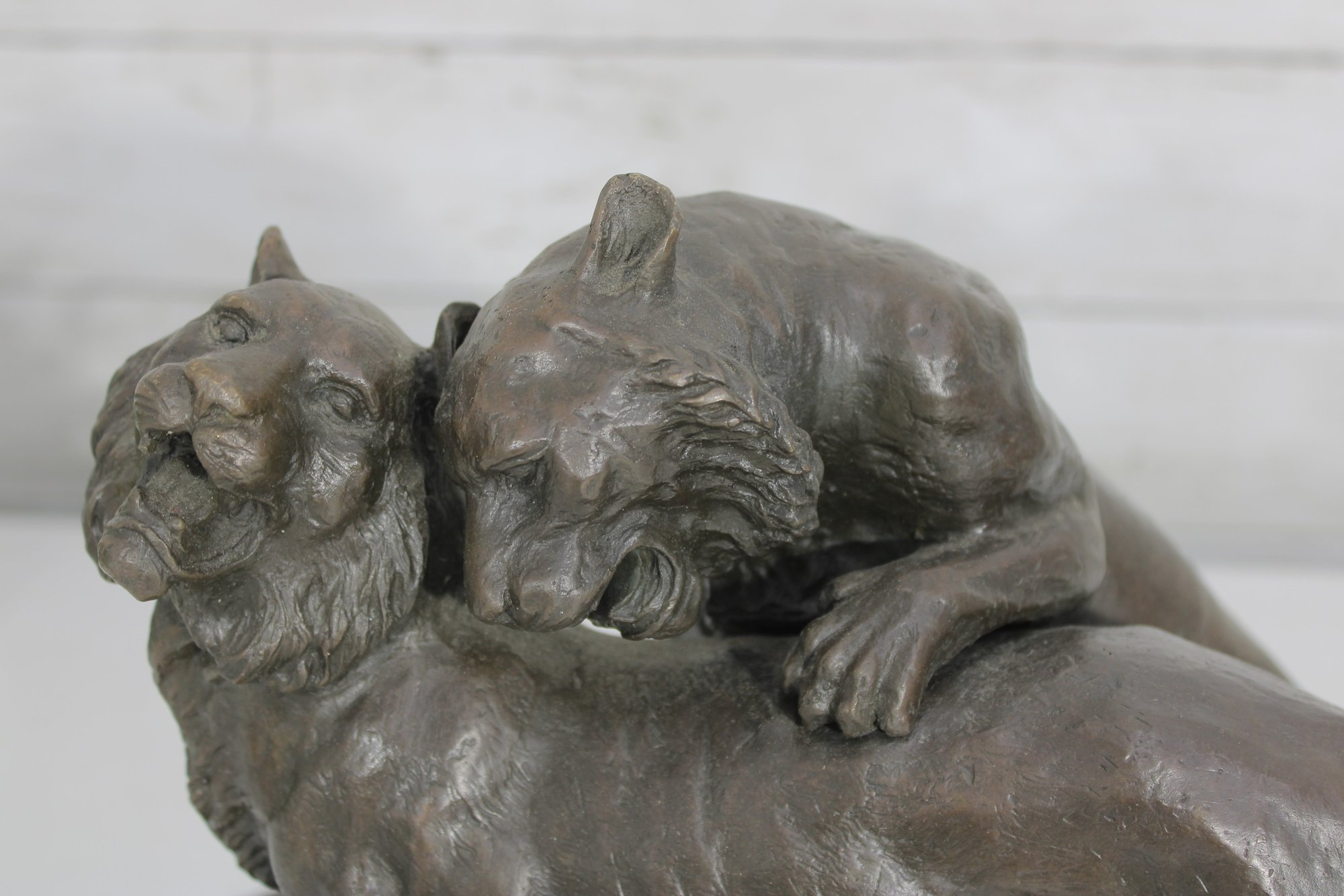 an impressive bronze animalier sculpture depicting a dynamic lion and lioness group, captured mid-interaction with strong movement and expressive realism. The composition conveys power and tension, with finely modeled musculature, textured fur, and naturalistic poses that bring the scene to life.