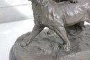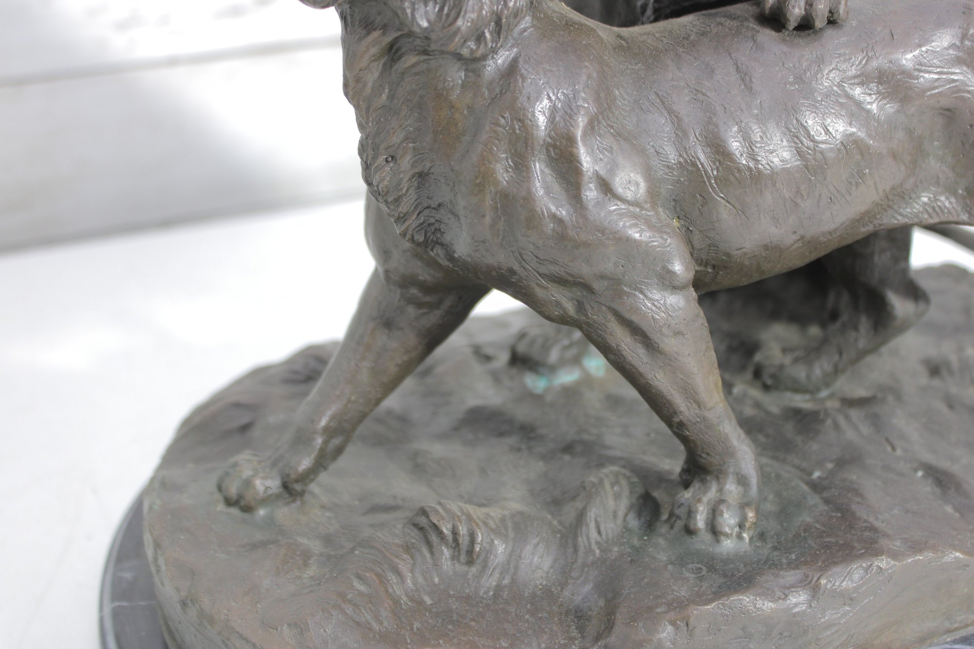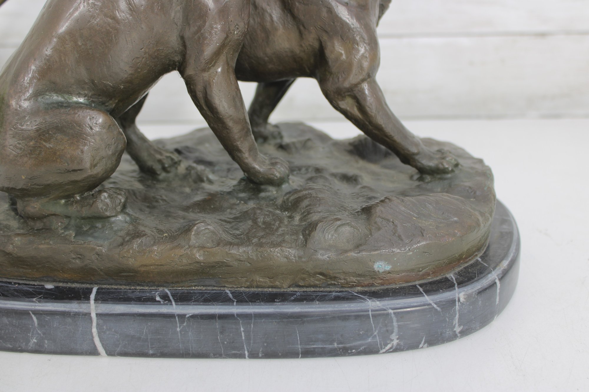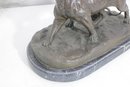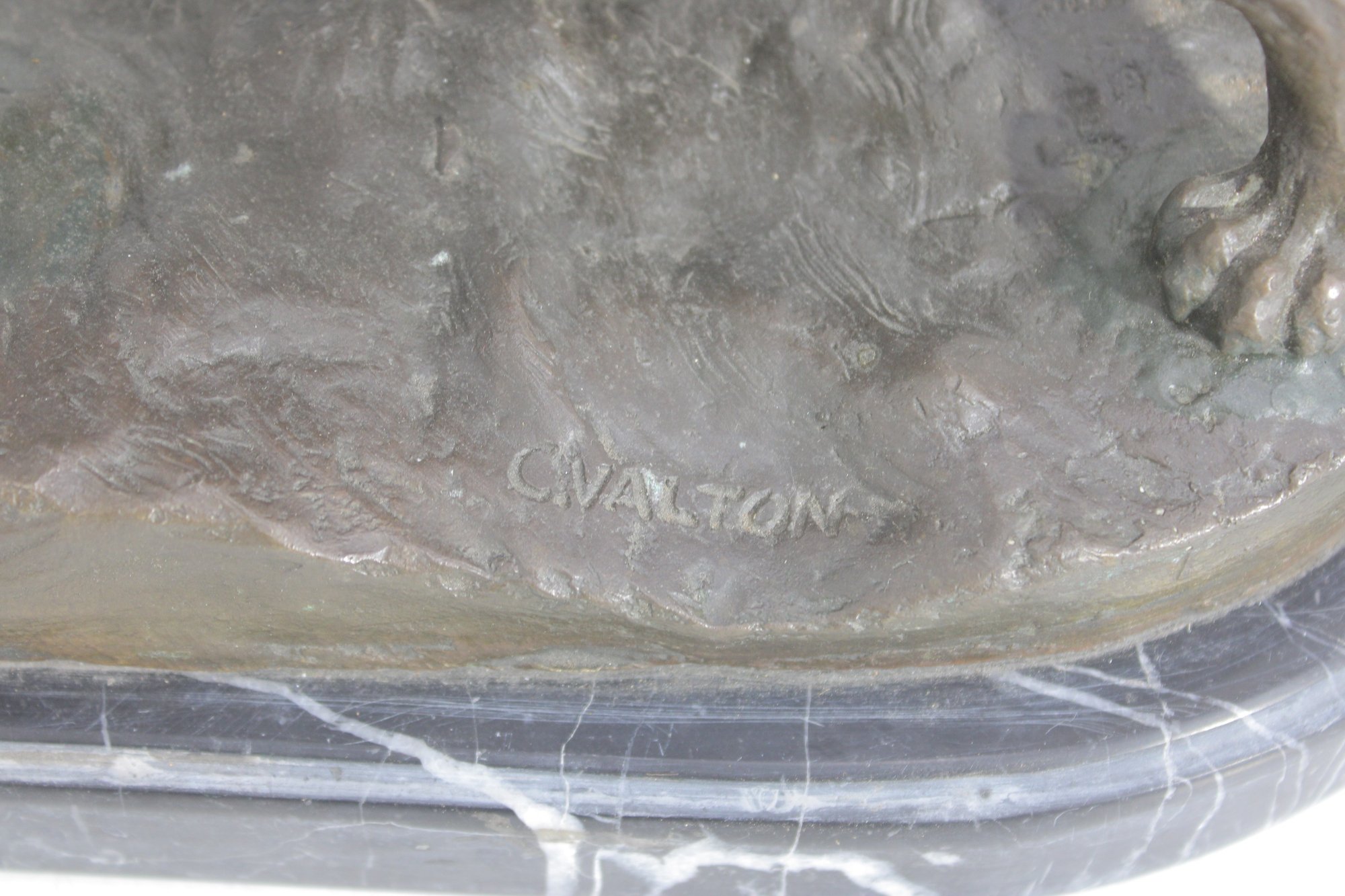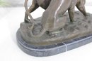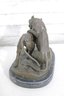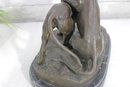 The sculpture is cast in solid bronze with a deep, dark patina and is mounted on an oval marble base, providing both contrast and stability. The bronze is signed on the casting (visible in photographs), adding artistic and collectible interest.