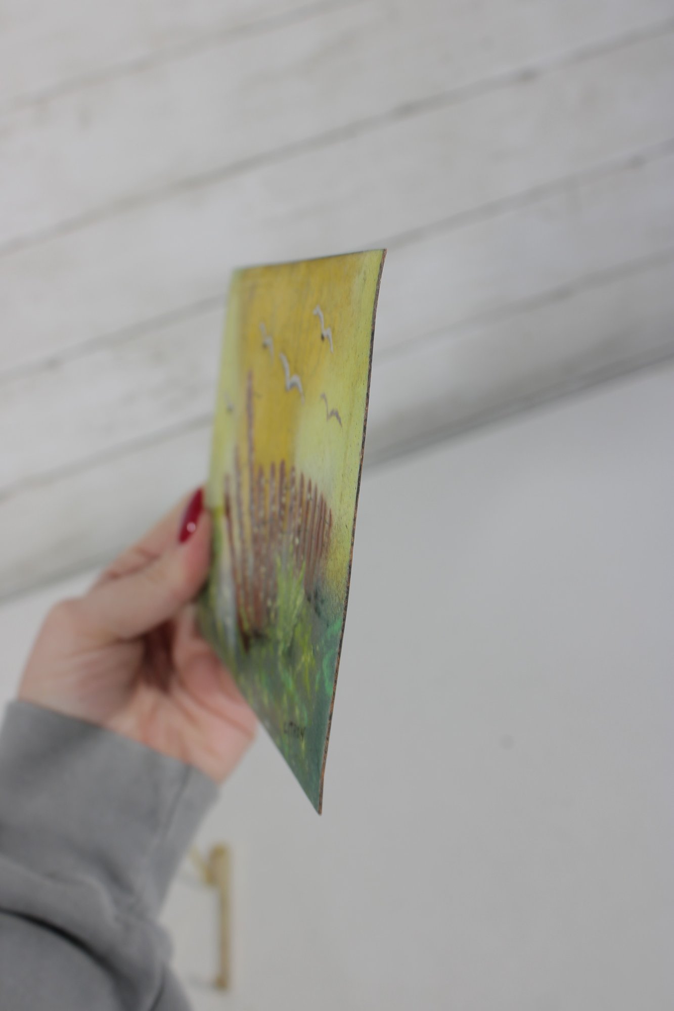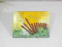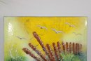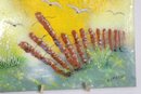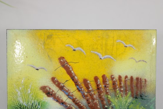 signed enamel on copper plaque by Citron, featuring a striking mid-century modern coastal scene. The artwork showcases stylized coral or sea plant forms in rich reddish tones set against a bold yellow sky with birds in flight, complemented by soft green and blue accents below.