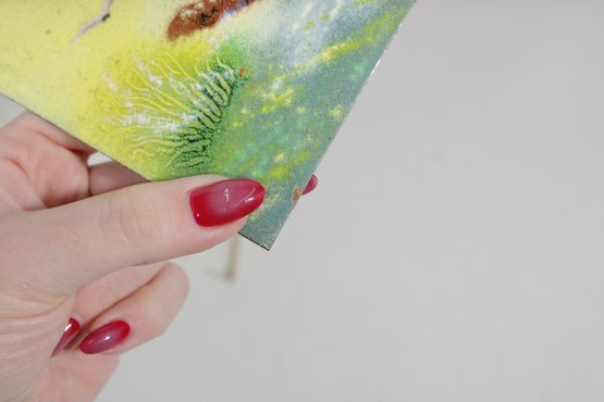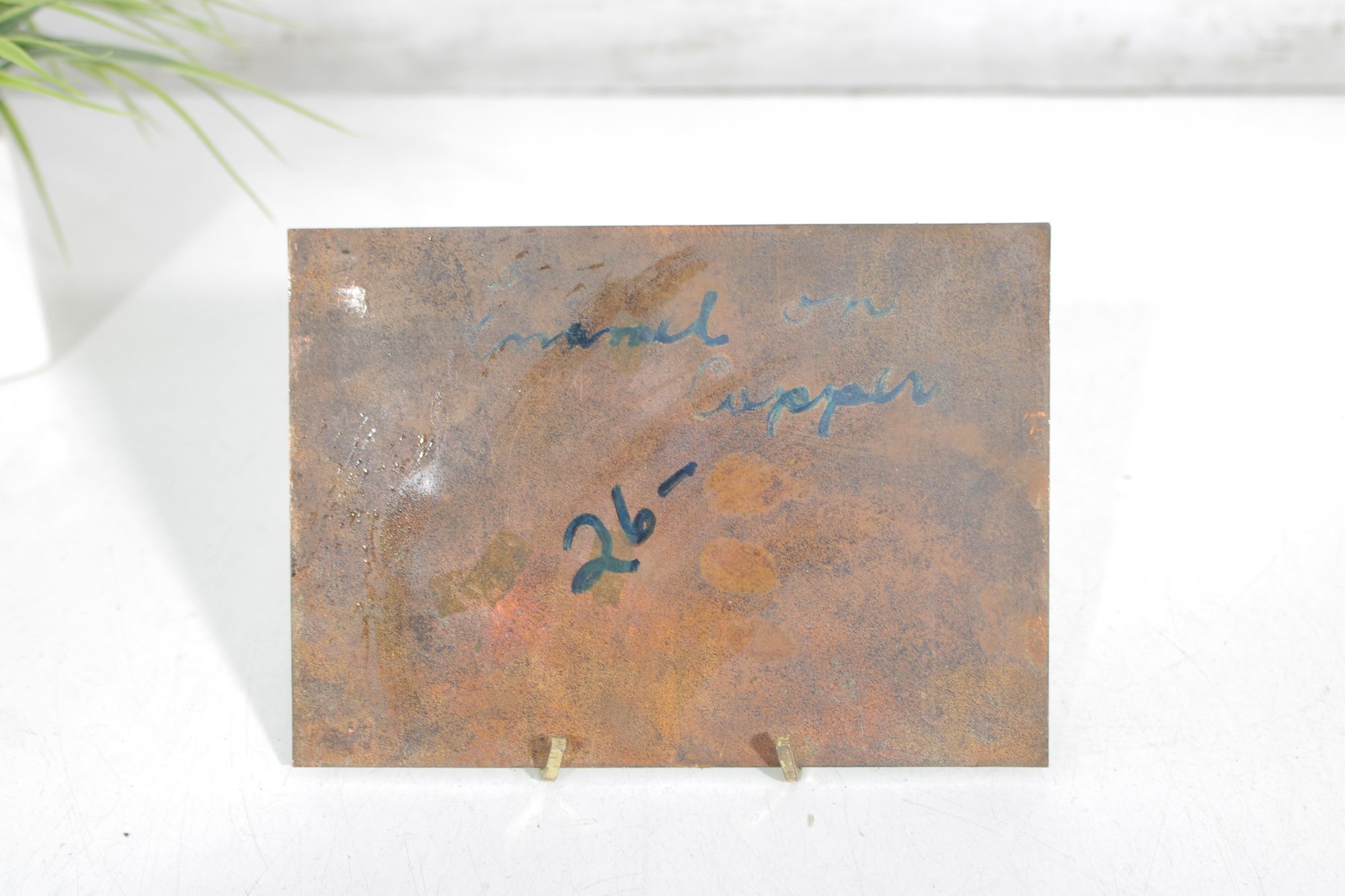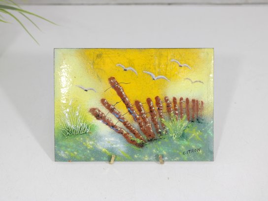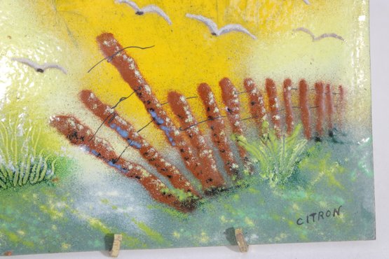Executed in enamel over copper, this piece has a beautiful glossy, textured surface that enhances its color and depth. The artist’s signature “Citron” is visible in the lower right corner, with handwritten notation on the reverse.
