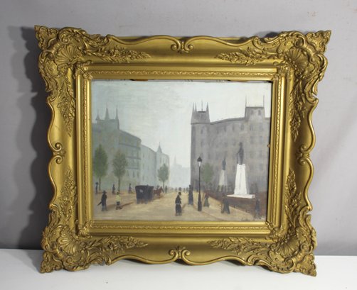 The scene is set in a misty atmosphere, where people dressed in period attire wander beneath the silhouette of grand buildings. The attention to detail, particularly in the street activity and architecture, gives the painting a timeless feel.