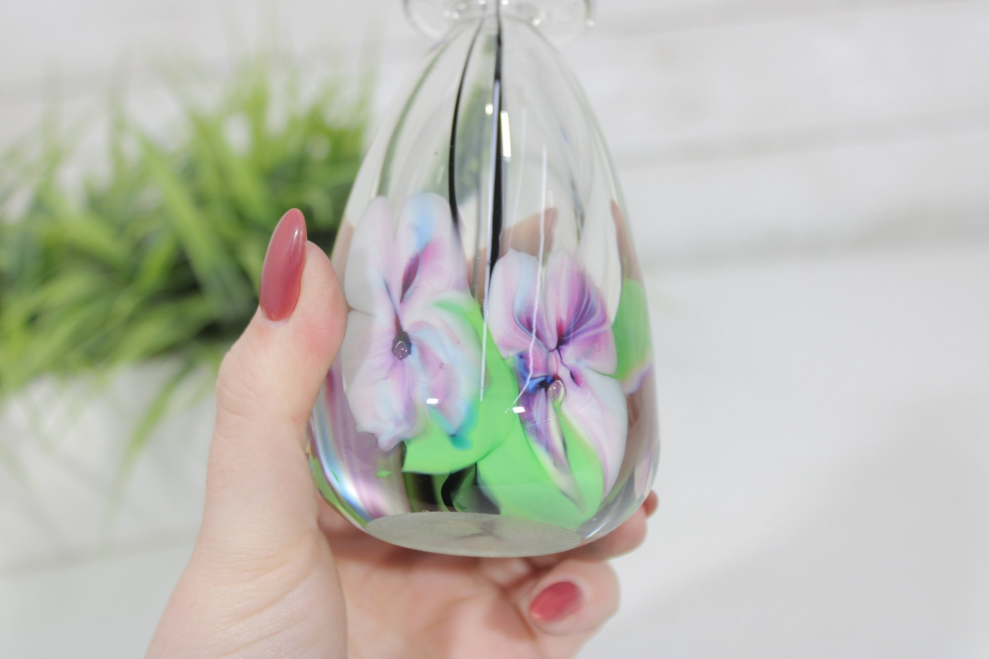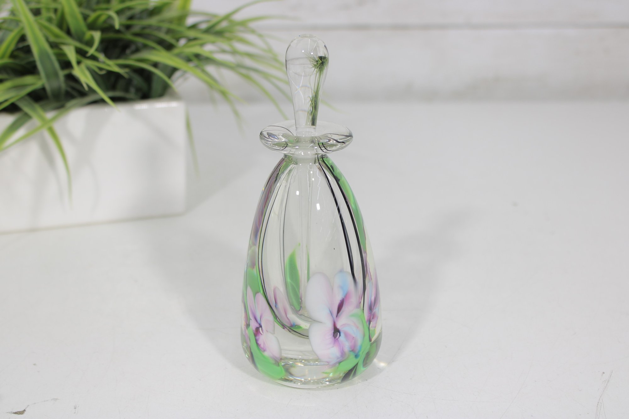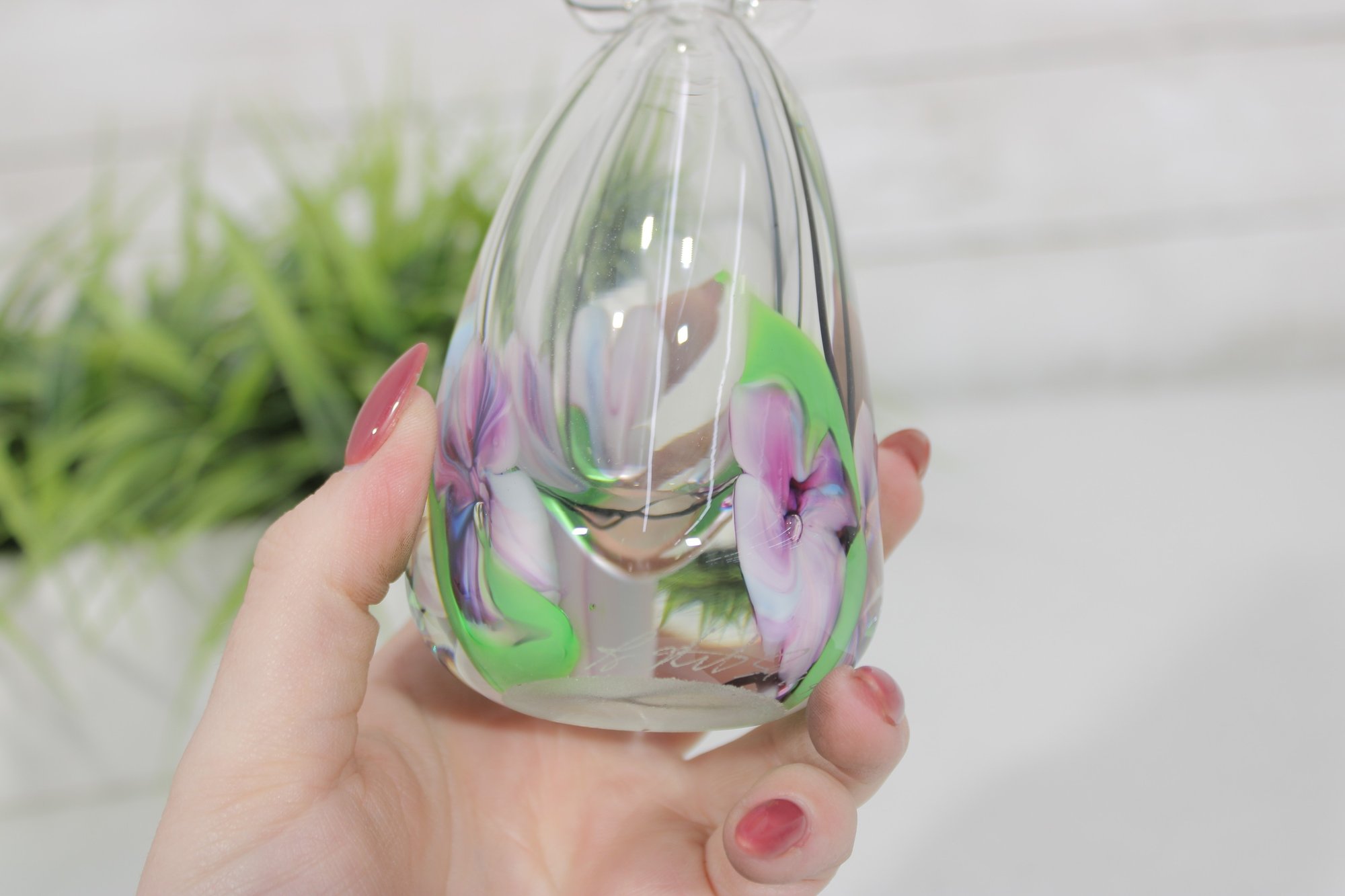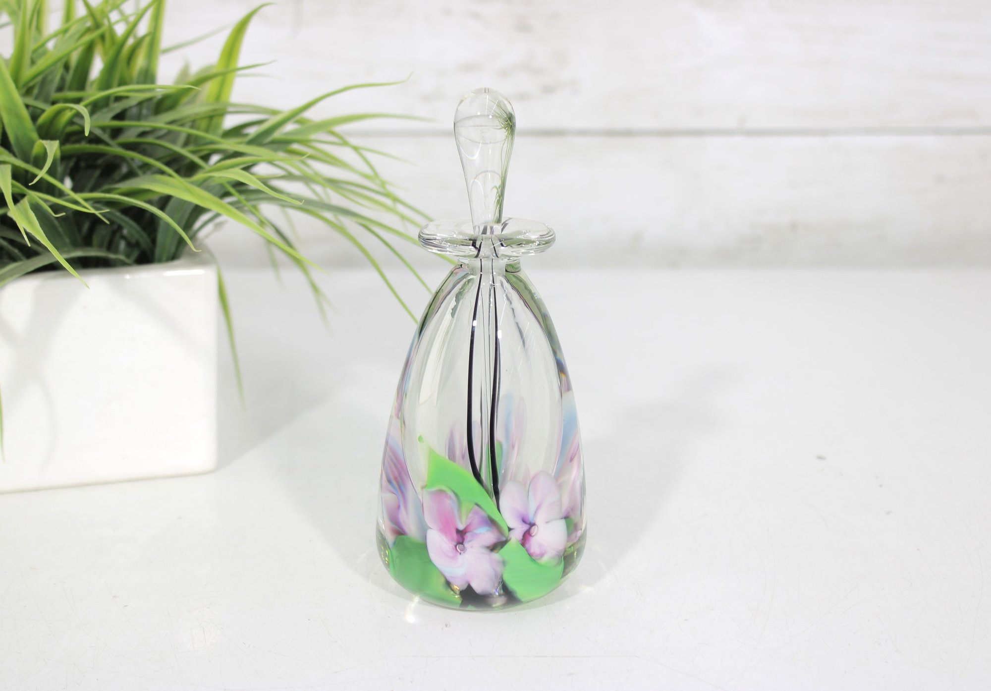 This elegant hand-blown piece showcases soft lavender-purple blossoms with vibrant green leaves, suspended inside the clear glass body. The bottle has a graceful teardrop shape with a matching clear glass stopper and decorative collar.