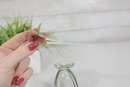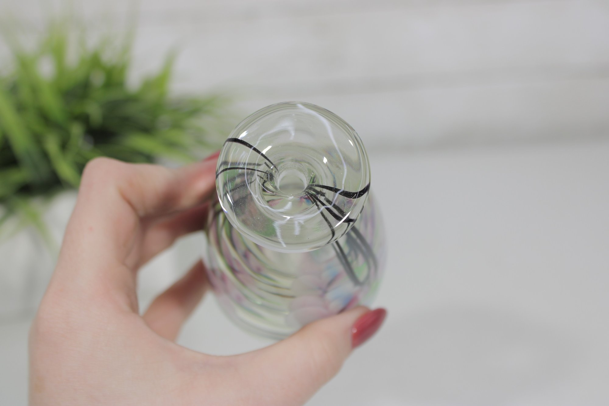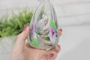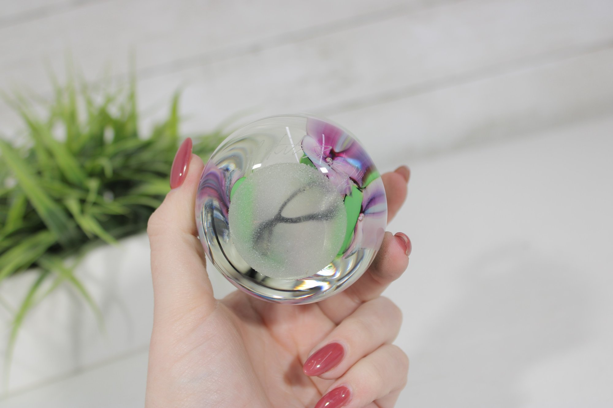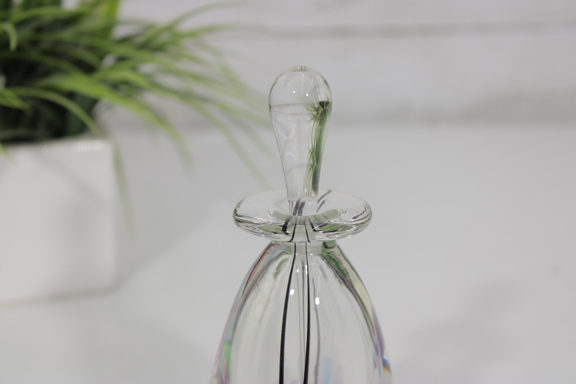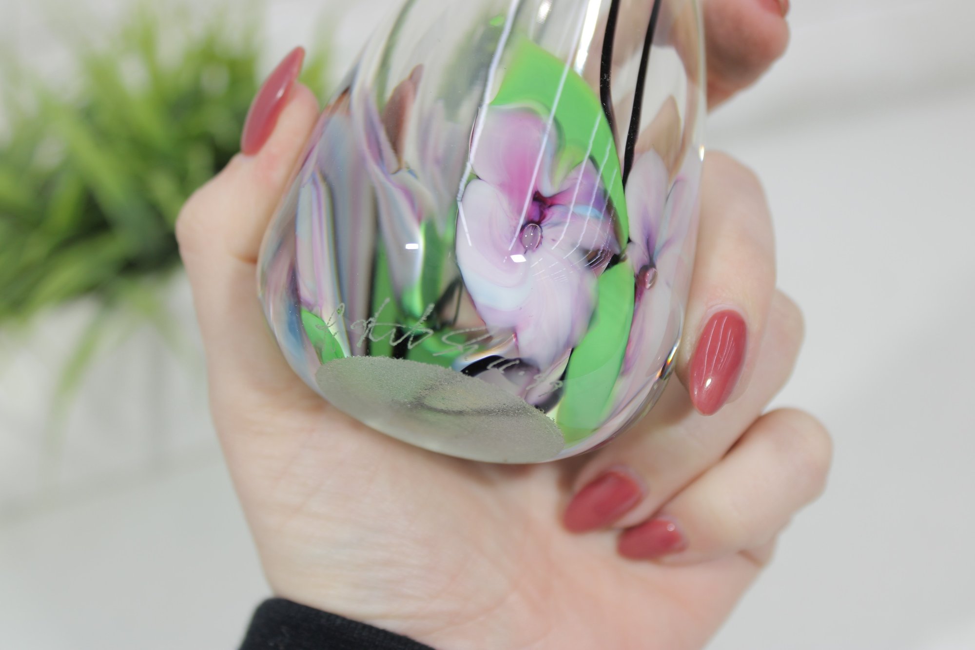 This elegant hand-blown piece showcases soft lavender-purple blossoms with vibrant green leaves, suspended inside the clear glass body. The bottle has a graceful teardrop shape with a matching clear glass stopper and decorative collar.