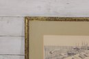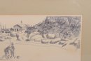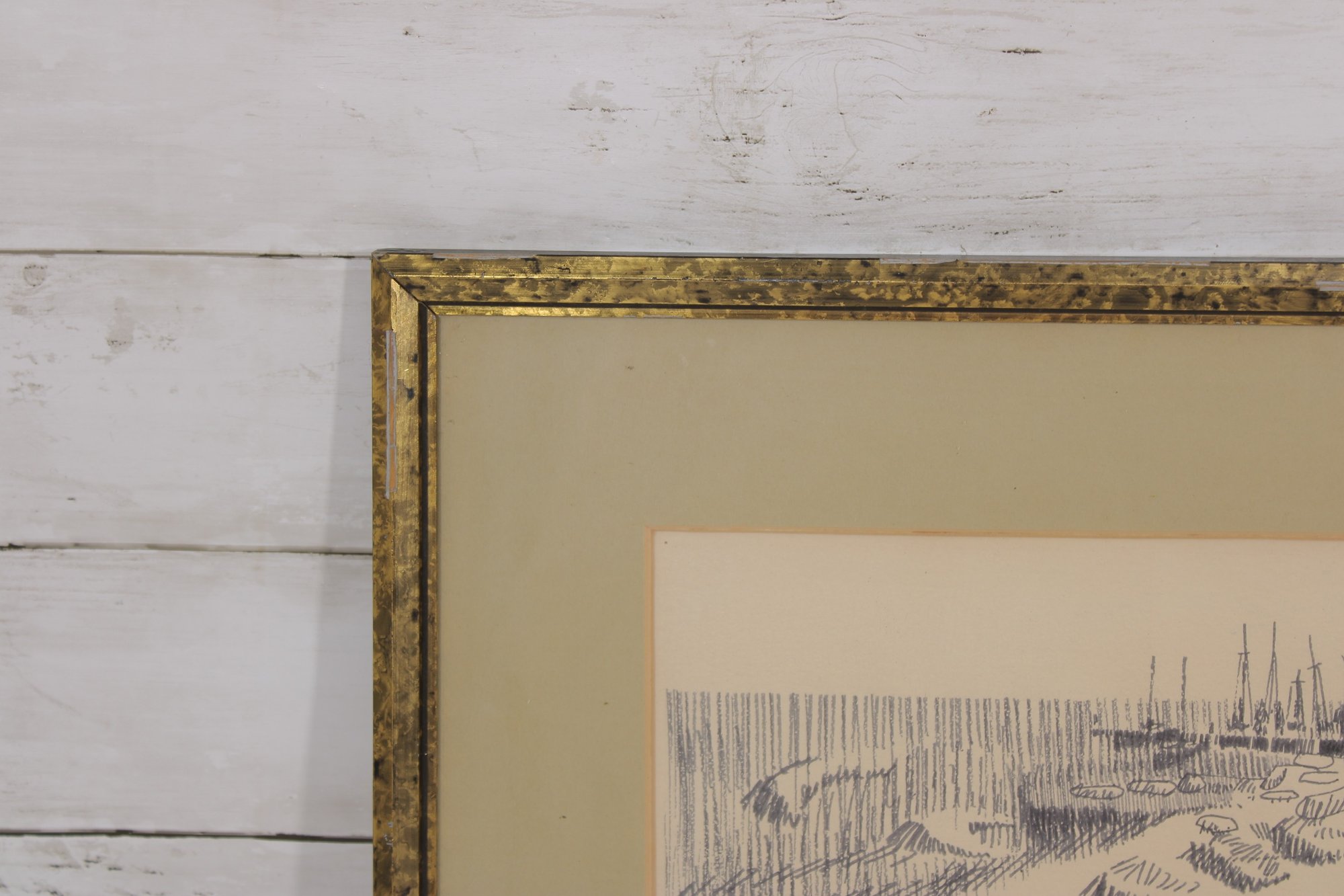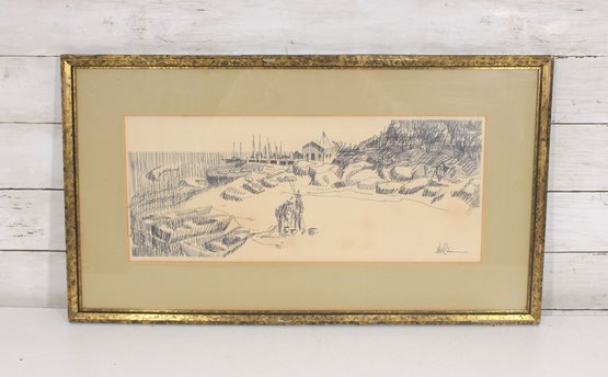 a beautifully composed signed coastal landscape drawing, presented in a classic frame with matting. This horizontal composition depicts a serene harbor or shoreline scene, featuring small buildings, boats, and figures along a rugged coastline.