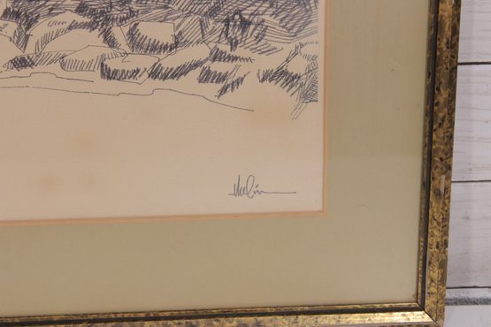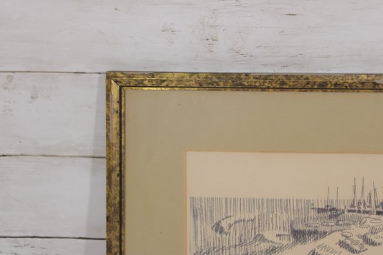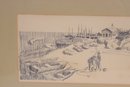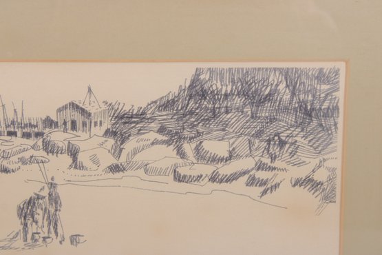 Executed in a loose, expressive line style (likely ink or lithograph), the artwork captures the charm of a seaside setting with confident sketchwork and fine detail. The monochromatic palette enhances the piece’s timeless and understated appeal, making it an excellent addition to both traditional and modern interiors.