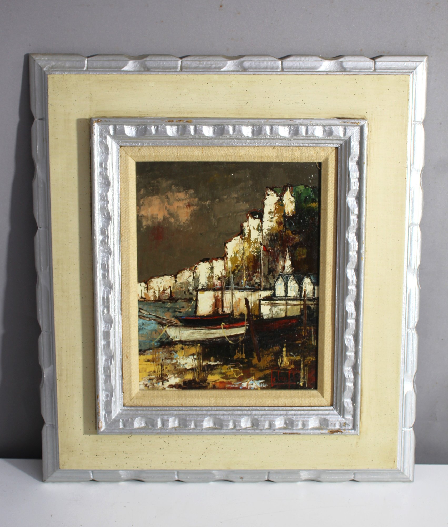 This beautifully textured oil painting on canvas features a dramatic coastal scene with cliffs and boats, capturing the rugged beauty of the seaside. The painting uses rich, earthy tones and a bold, expressive brushstroke technique to convey the power of nature and the serene charm of a harbor village. The detailed depiction of the boats anchored near the cliffs adds depth and character to the scene.
