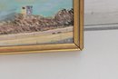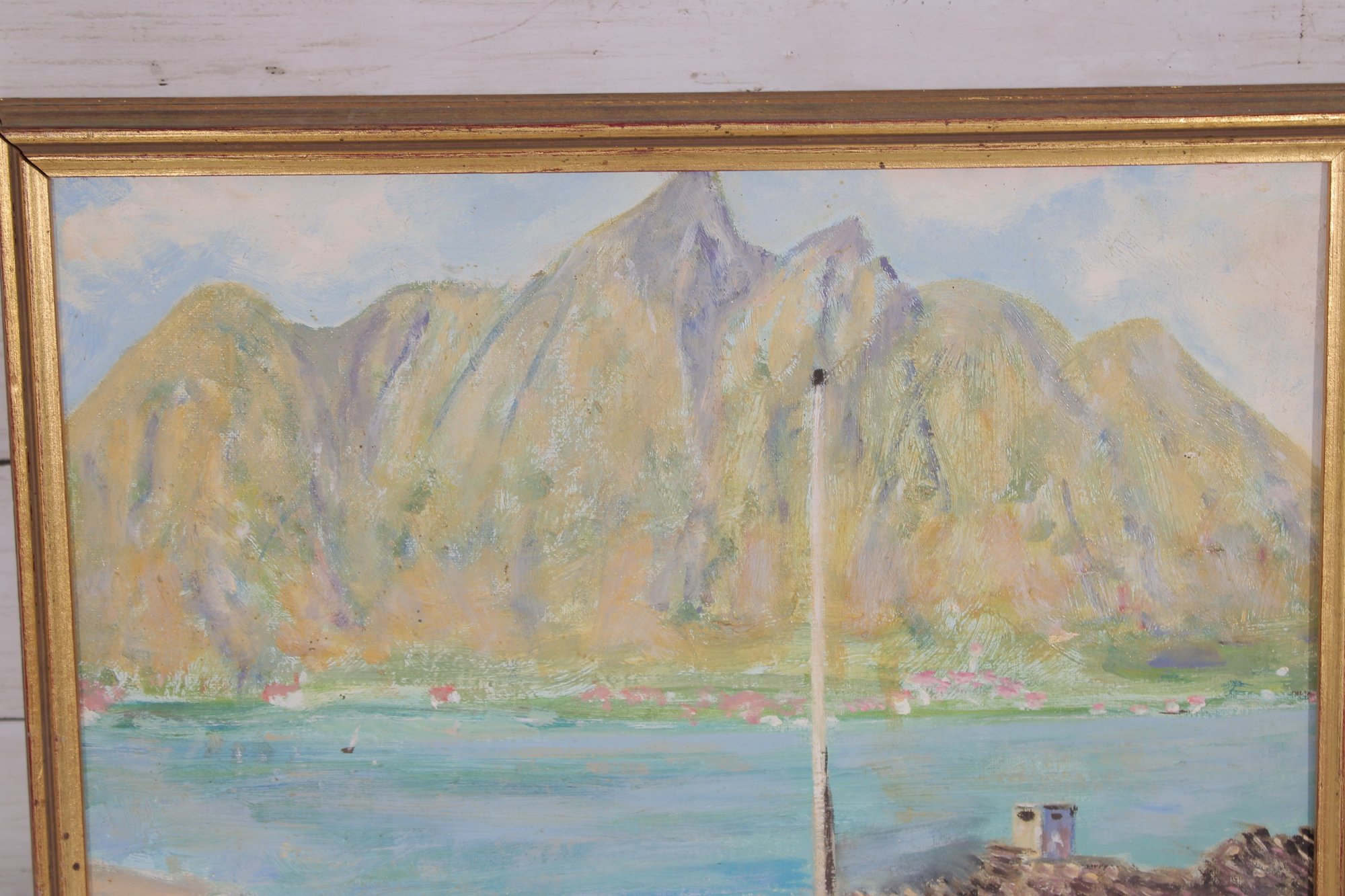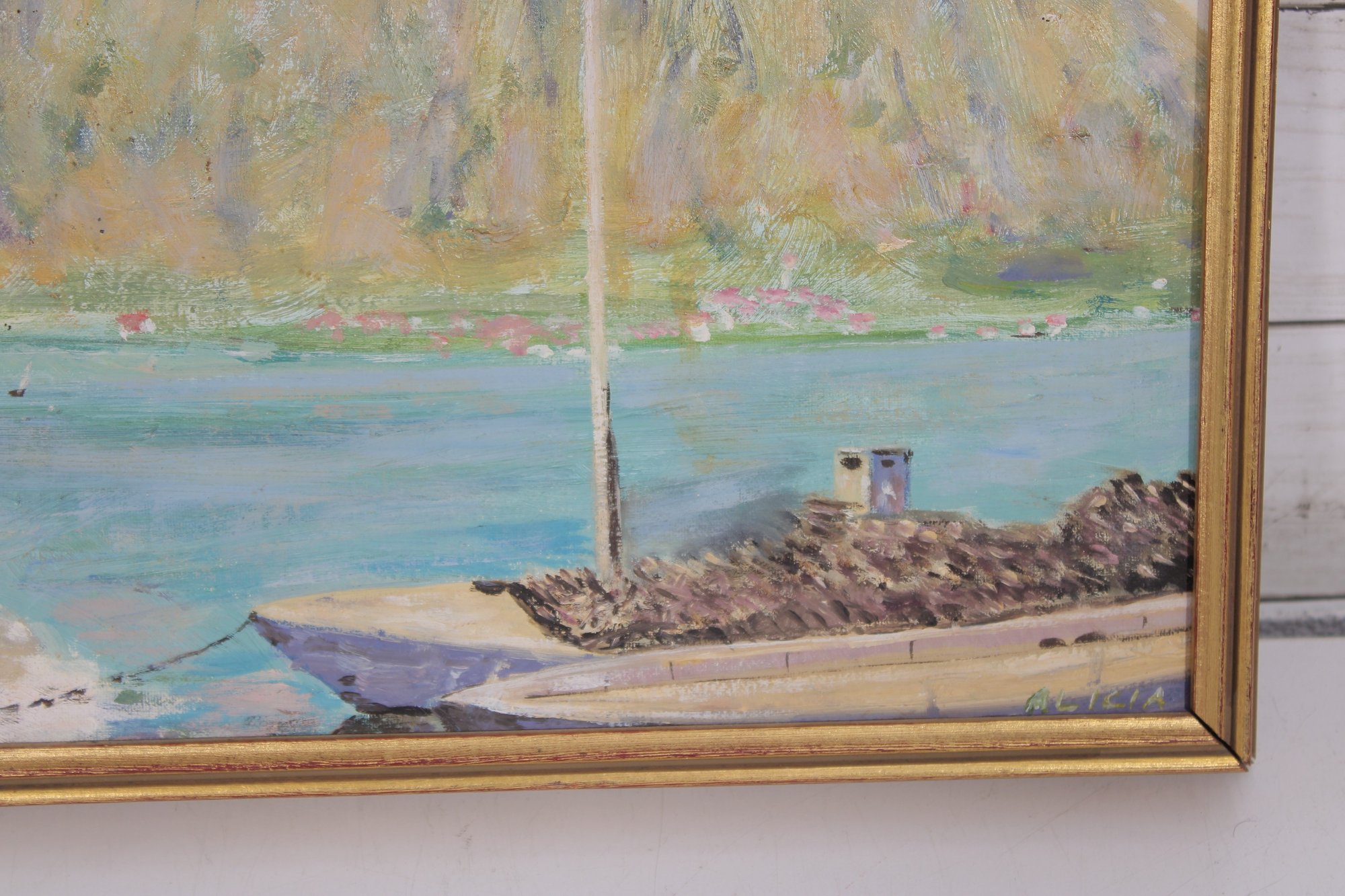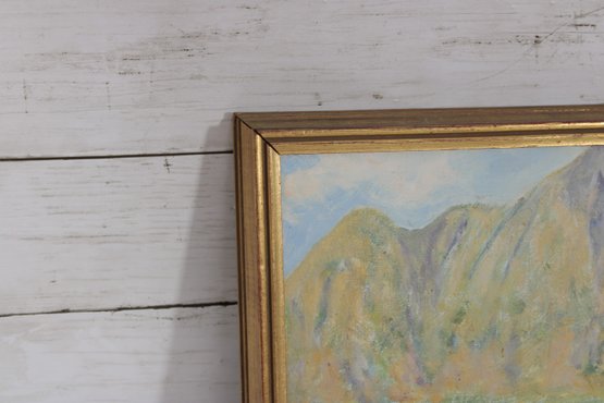 a serene original signed landscape painting depicting a coastal harbor scene with mountains rising in the background.