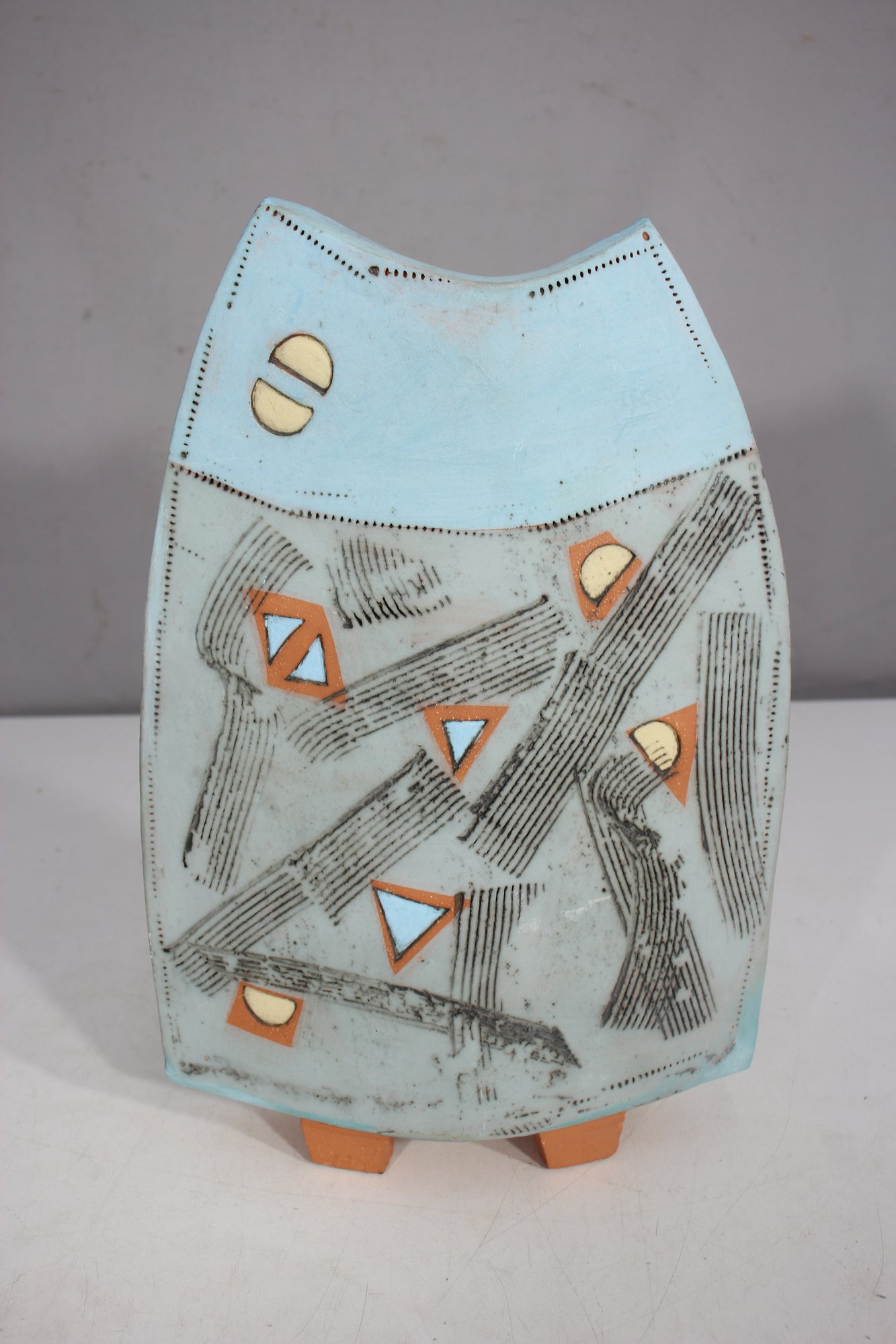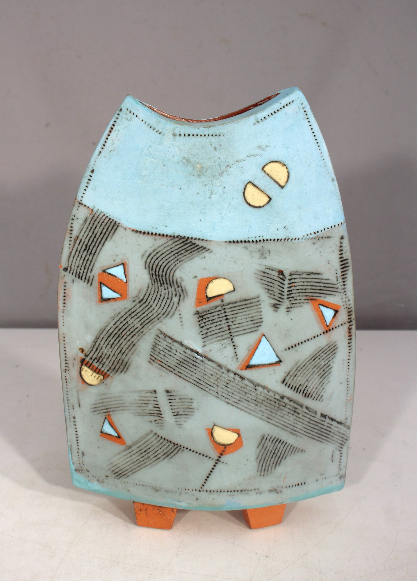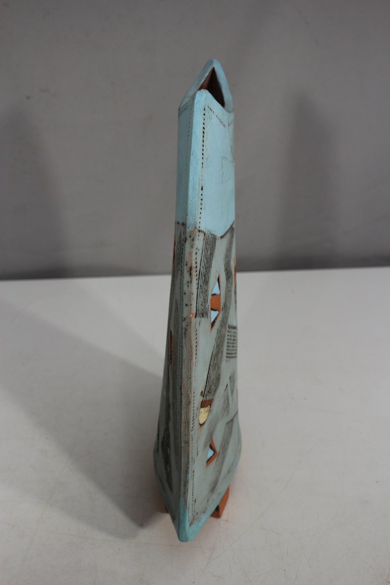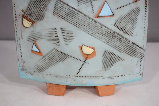 This striking handcrafted ceramic vase features a unique geometric form with an abstract modernist design. The textured surface showcases intricate incised patterns, raised triangular accents, and a dynamic blend of soft blue, gray, and earthy terracotta tones. The vase is supported by four small feet, adding to its sculptural appeal. Signed on the underside, this one-of-a-kind piece is perfect for collectors of contemporary ceramics, abstract pottery, or statement decor pieces. A beautiful fusion of form and function, ideal for adding an artistic touch to any space.
