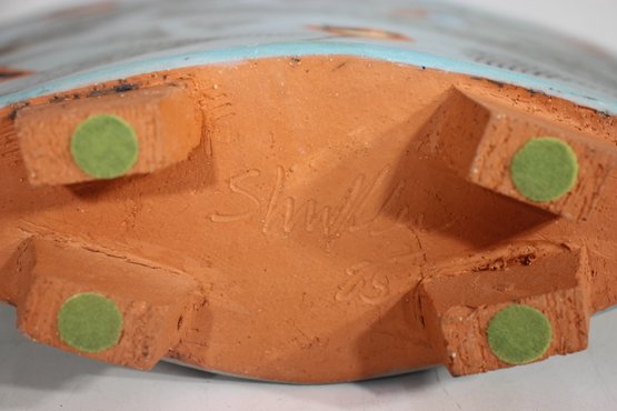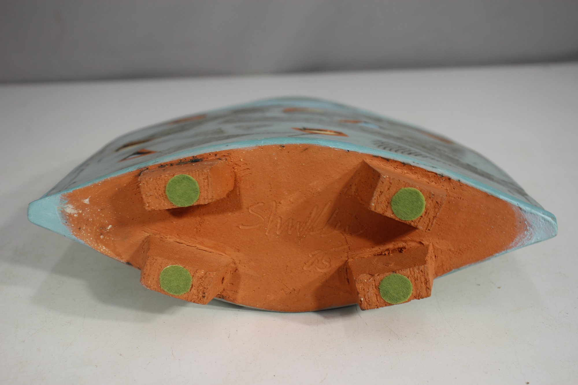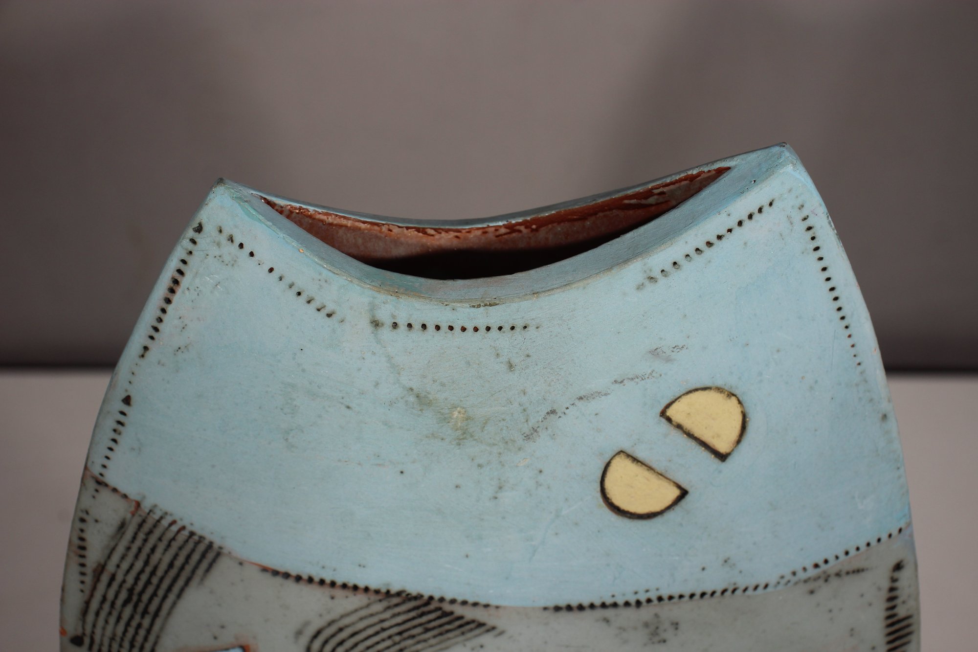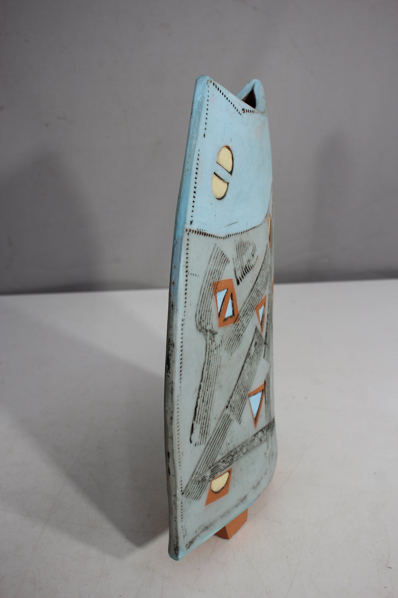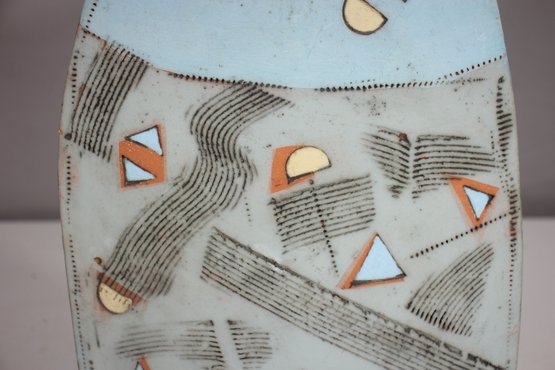 This striking handcrafted ceramic vase features a unique geometric form with an abstract modernist design. The textured surface showcases intricate incised patterns, raised triangular accents, and a dynamic blend of soft blue, gray, and earthy terracotta tones. The vase is supported by four small feet, adding to its sculptural appeal. Signed on the underside, this one-of-a-kind piece is perfect for collectors of contemporary ceramics, abstract pottery, or statement decor pieces. A beautiful fusion of form and function, ideal for adding an artistic touch to any space.