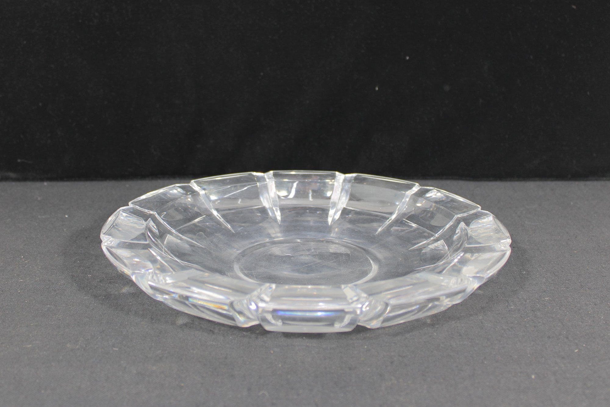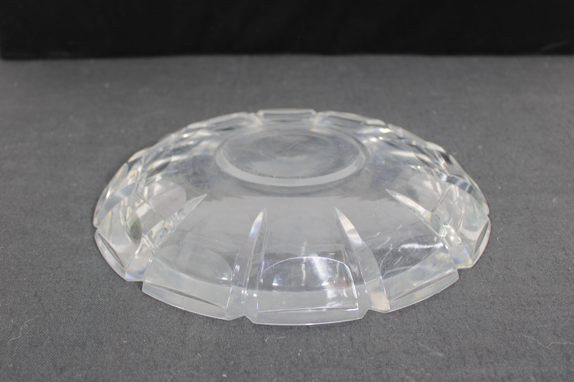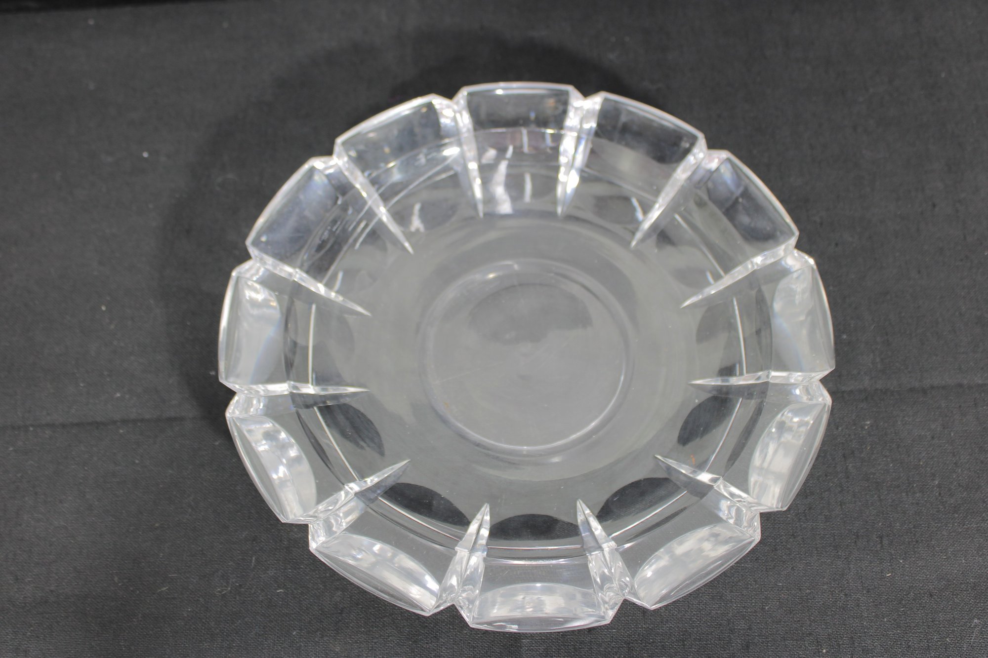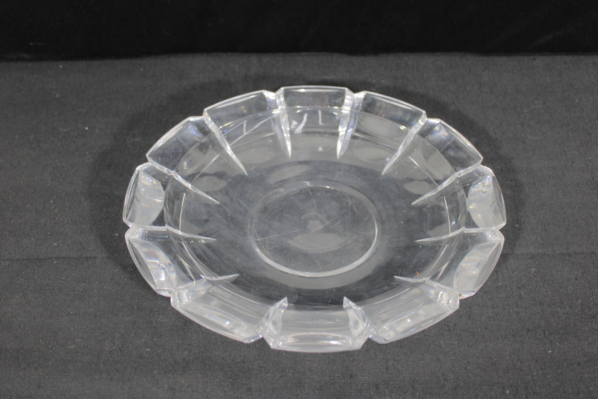 signed cut crystal glass bowl, featuring a classic faceted edge design that reflects light elegantly. This 11" round bowl showcases clean, geometric cuts around the rim, giving it a timeless and sophisticated look.