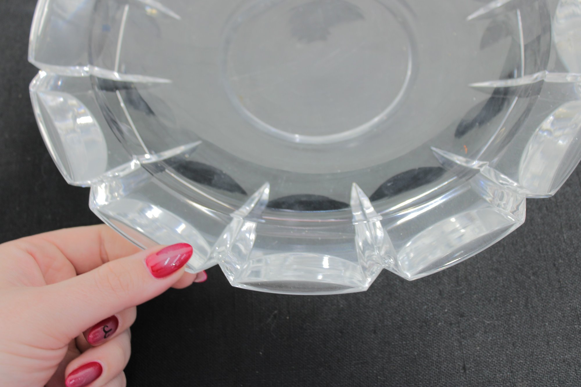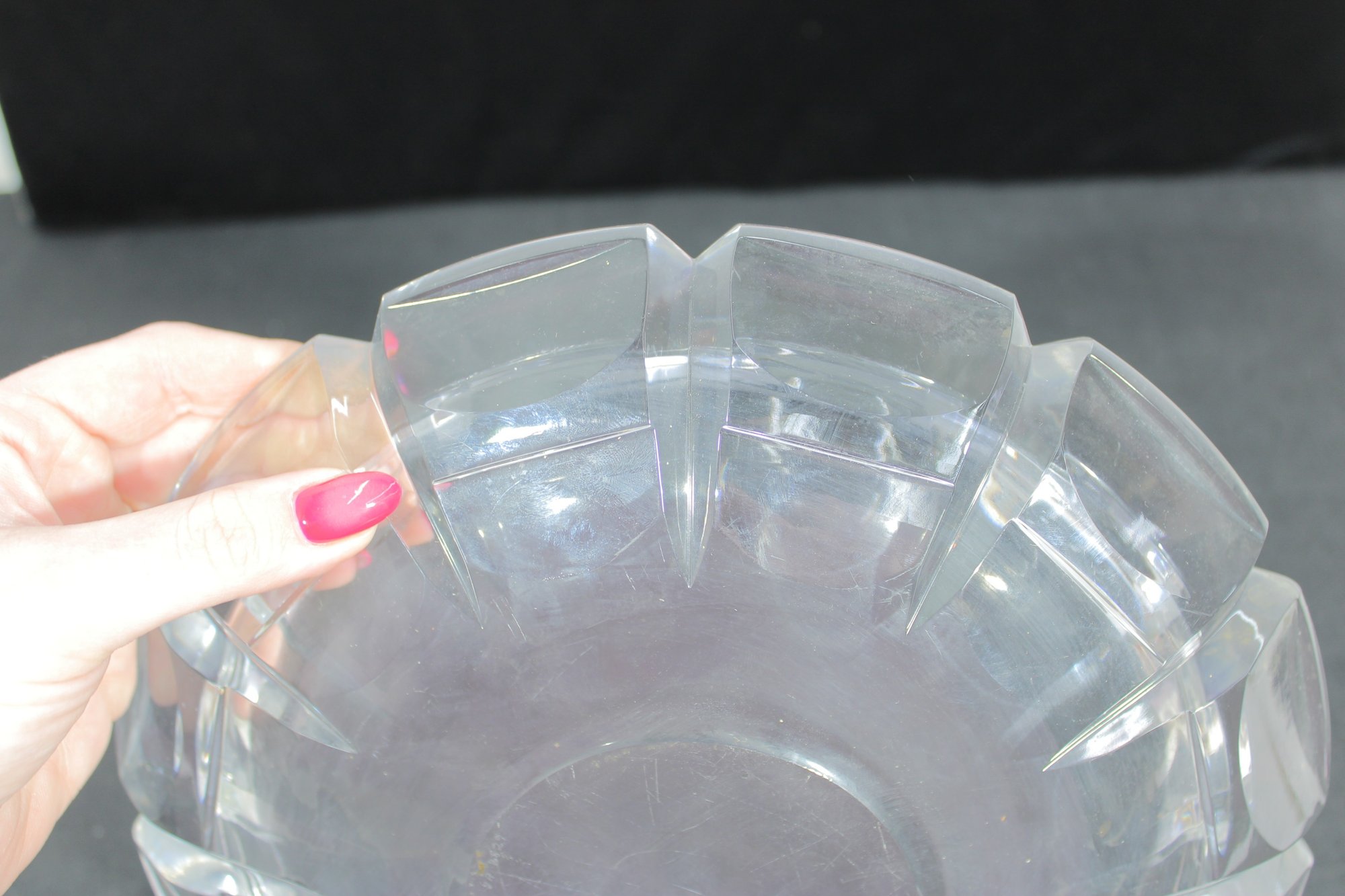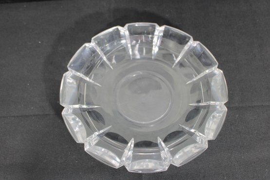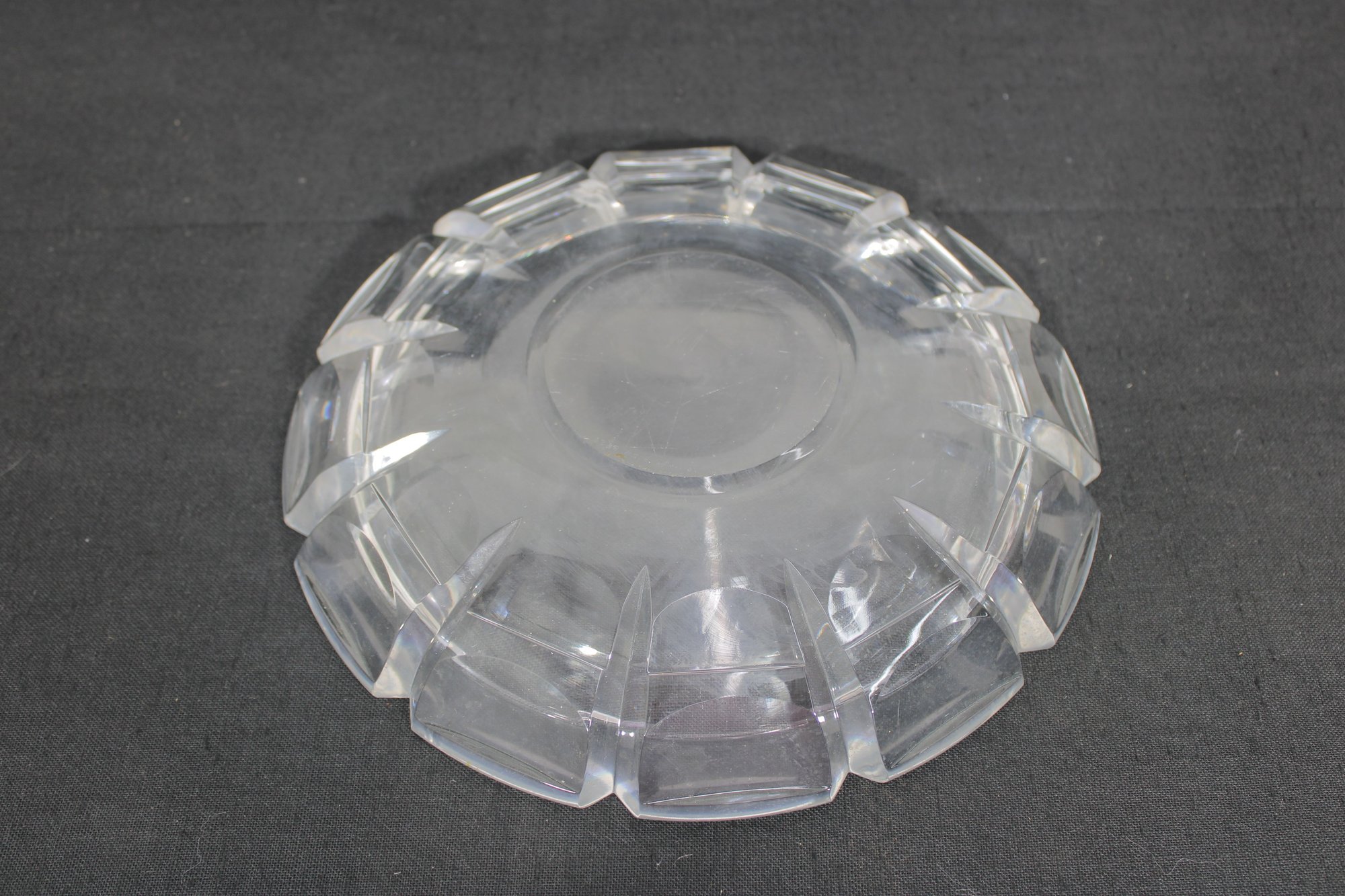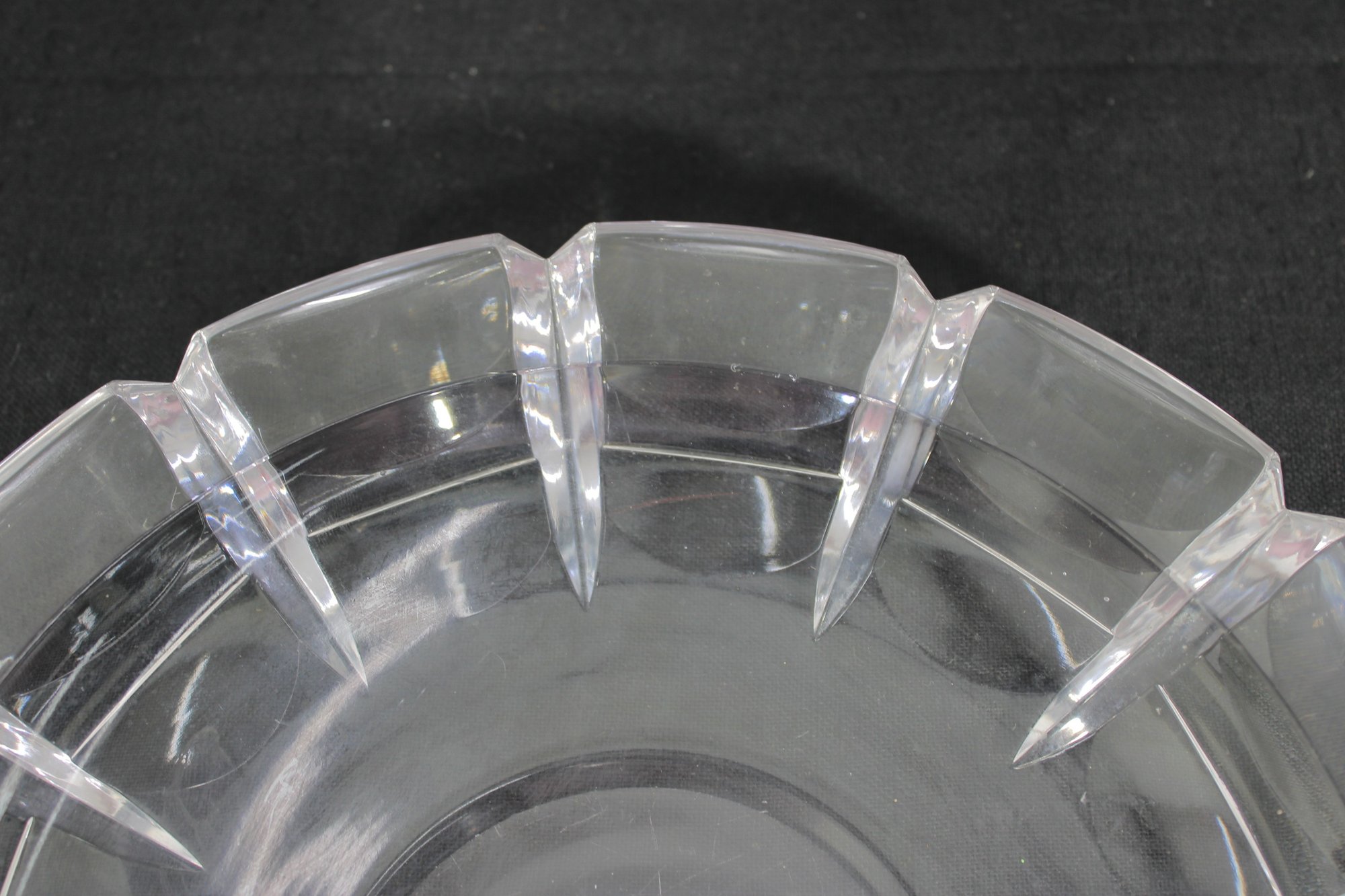 signed cut crystal glass bowl, featuring a classic faceted edge design that reflects light elegantly. This 11" round bowl showcases clean, geometric cuts around the rim, giving it a timeless and sophisticated look.