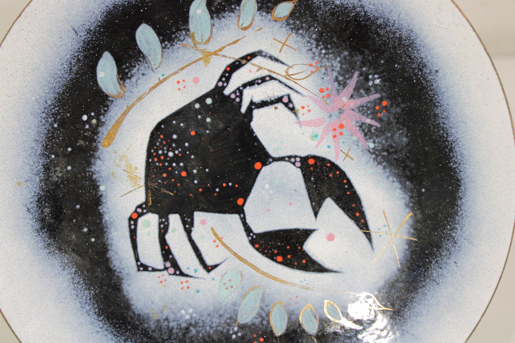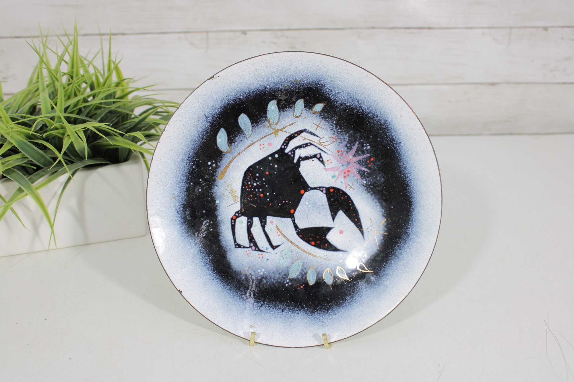 Unique and artistic signed enamel on copper plate by Dane, featuring a bold mid-century modern abstract animal motif. The design showcases a stylized black animal form accented with white, red, and gold details, set against a dramatic speckled background with soft blue and pink elements.