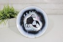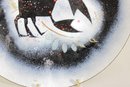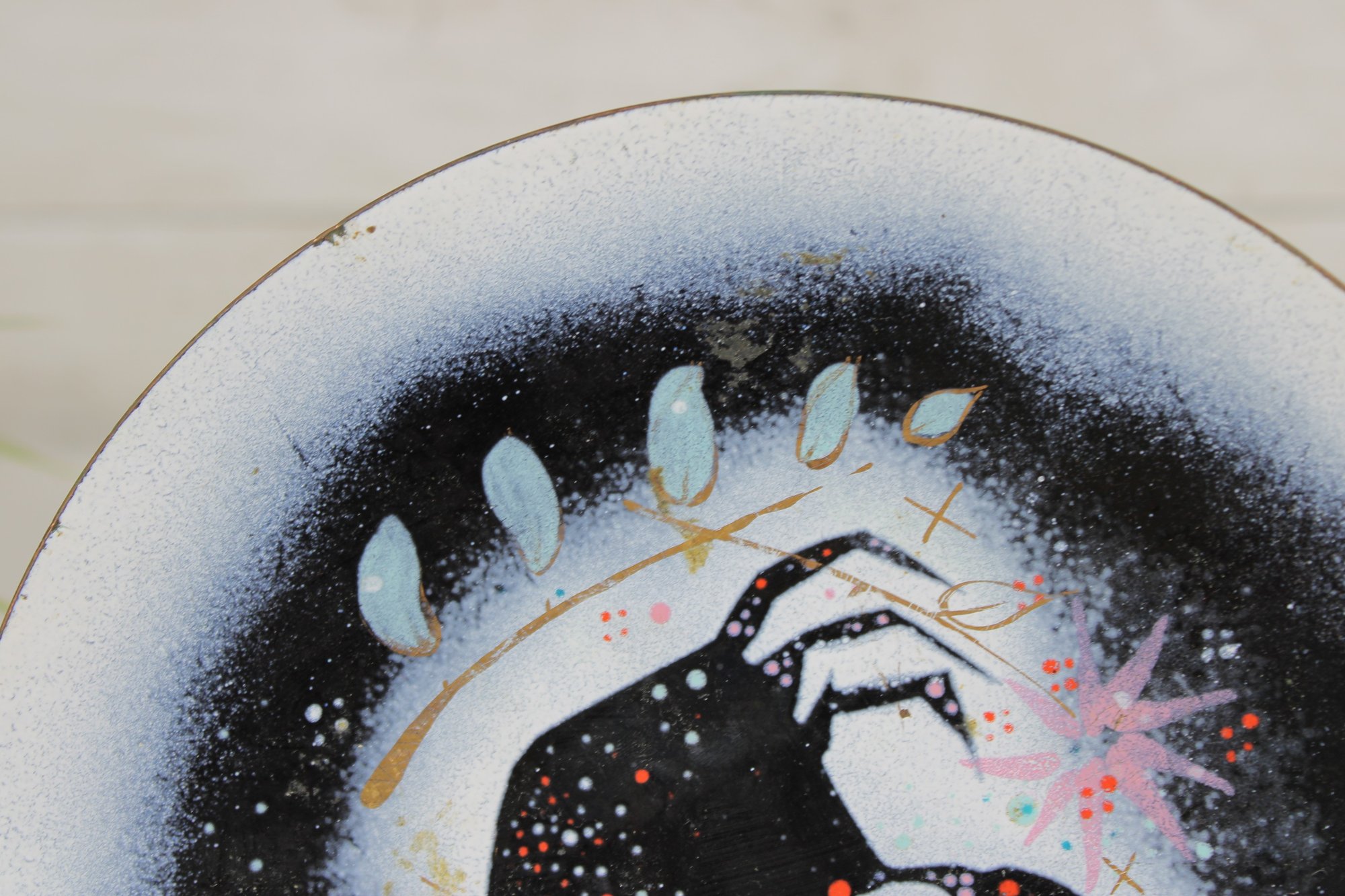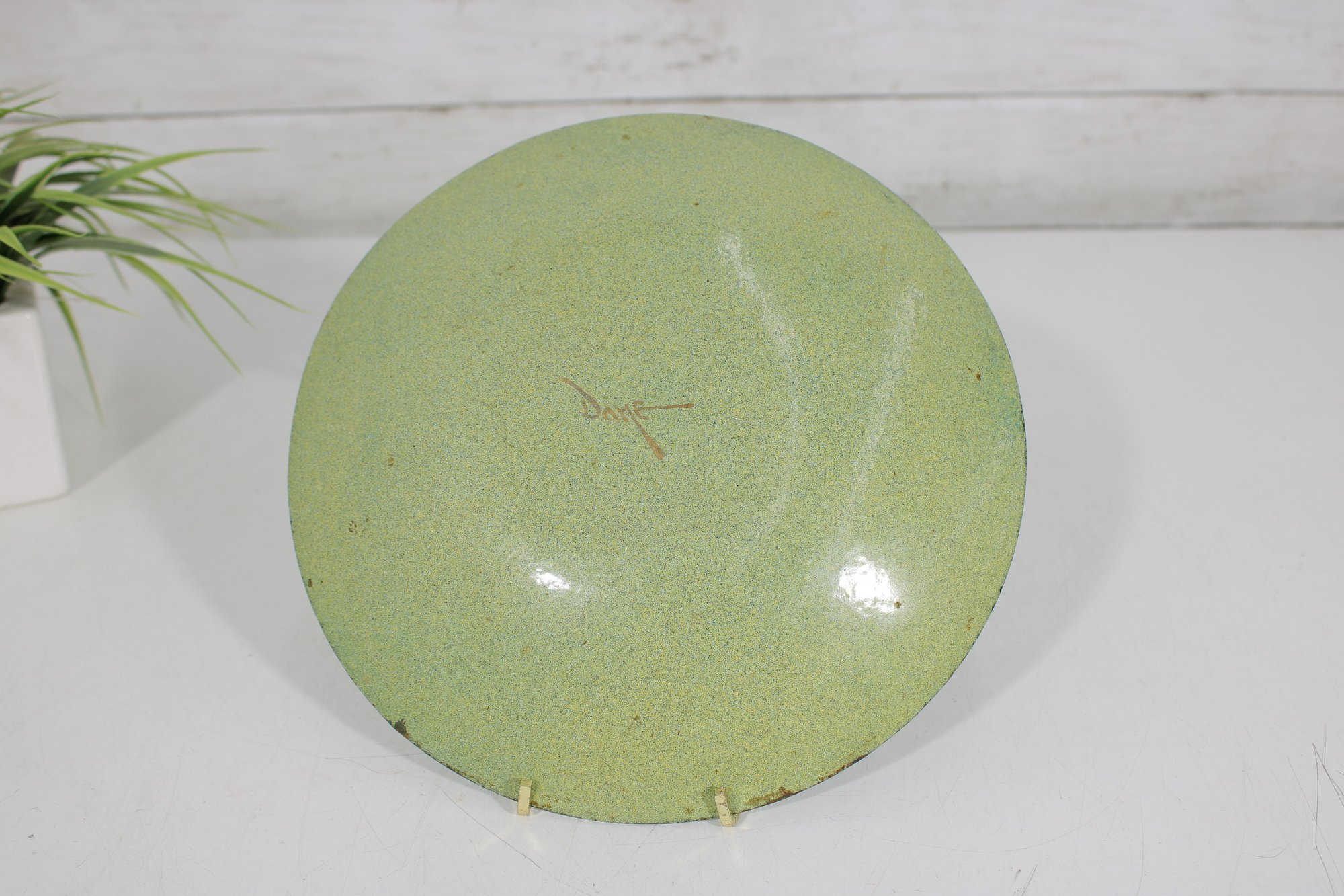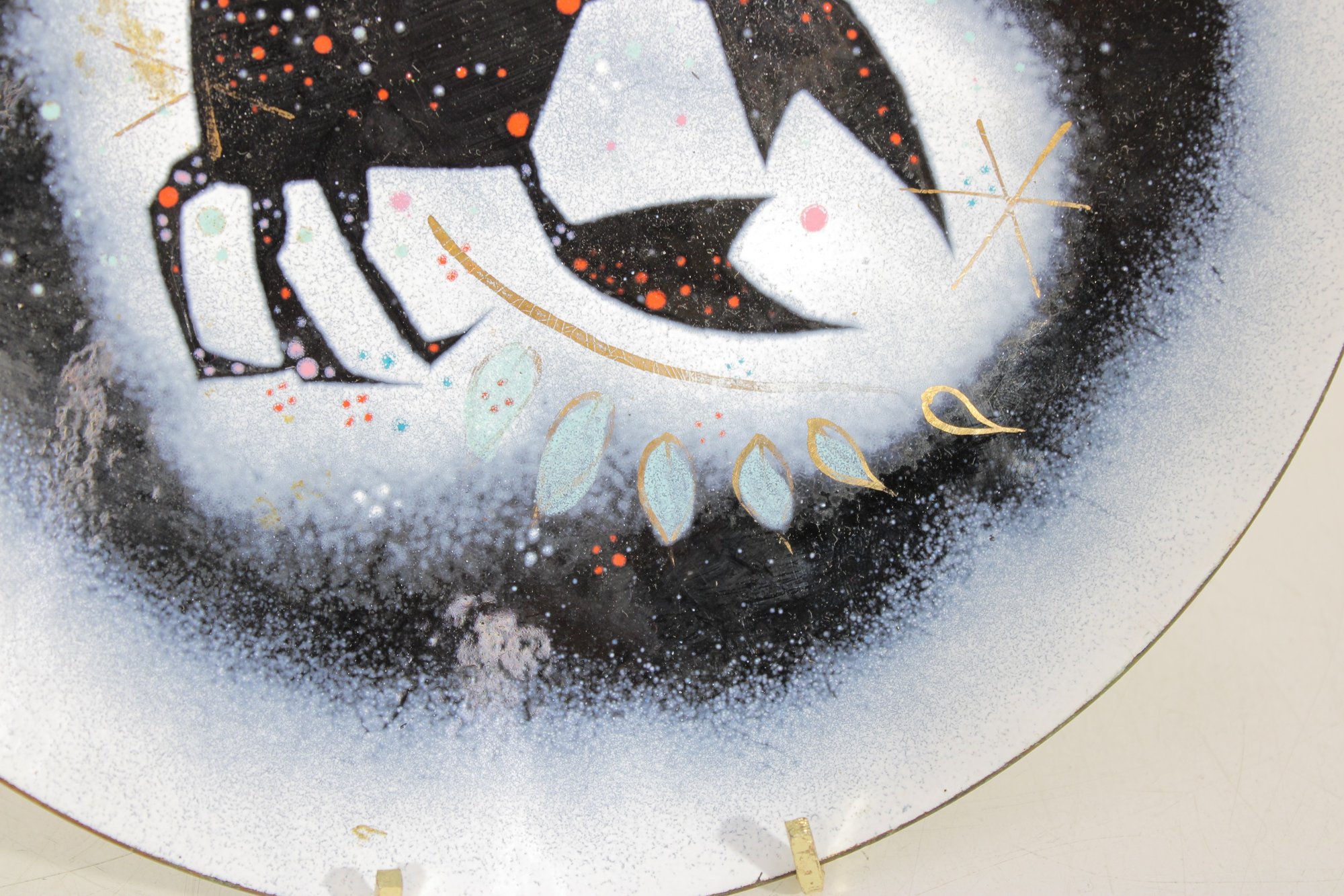 Measuring approximately 9” in diameter, this plate has a gently curved form and a glossy enamel finish that enhances the rich colors and intricate detailing. The composition has a whimsical, almost folk-art quality combined with modernist design.