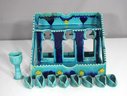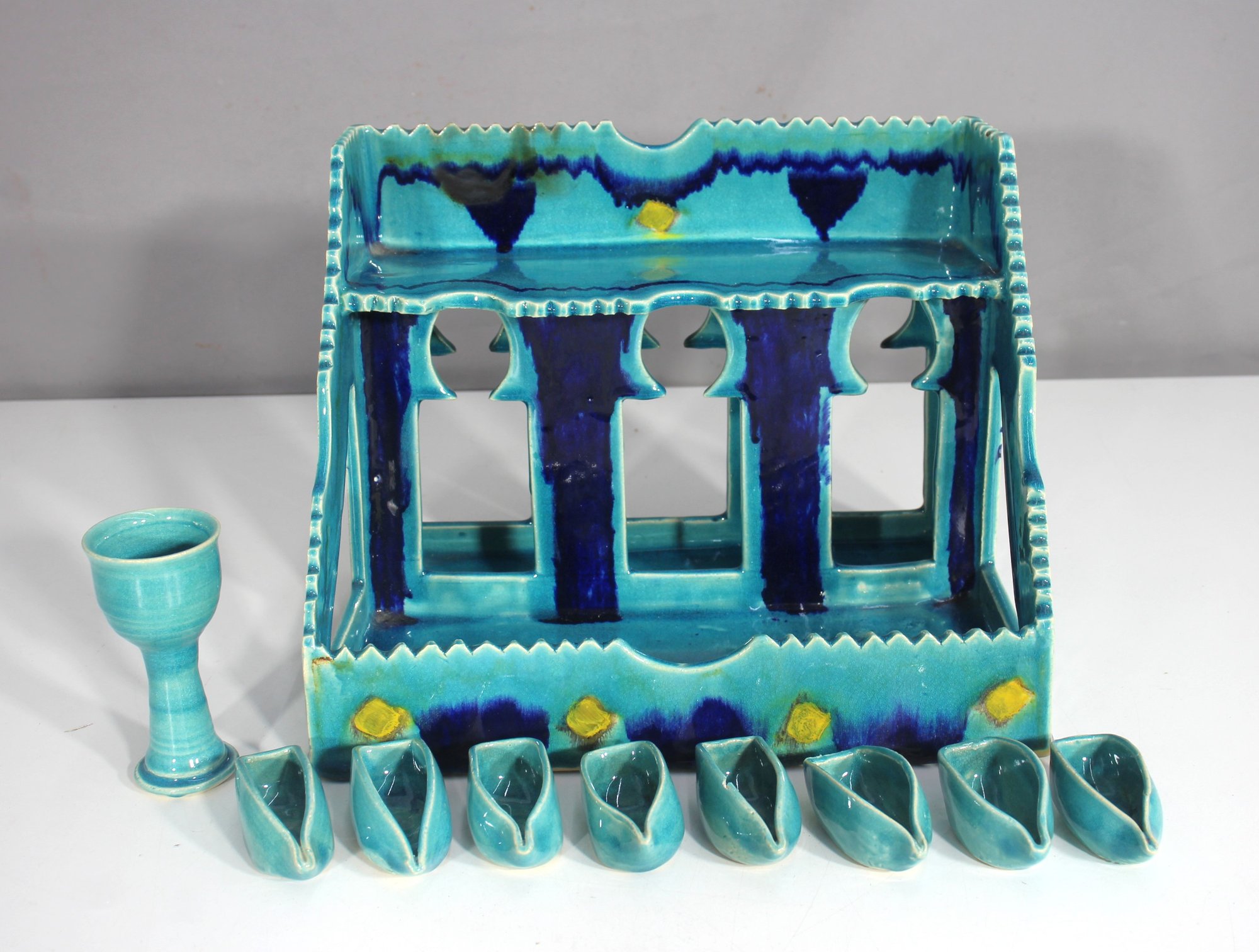 Beautiful and unique, this handcrafted ceramic Judaica Seder set is signed on the reverse by Didir Lovadsley, Jeu Salem—a distinctive and expressive piece rooted in traditional themes and bold artistic style. Featuring vibrant turquoise and cobalt glazing with sculptural yellow accents, this set includes a tiered stand, individual serving dishes, and a matching goblet.