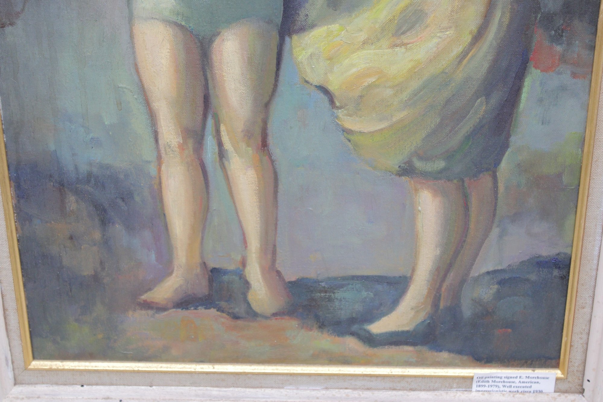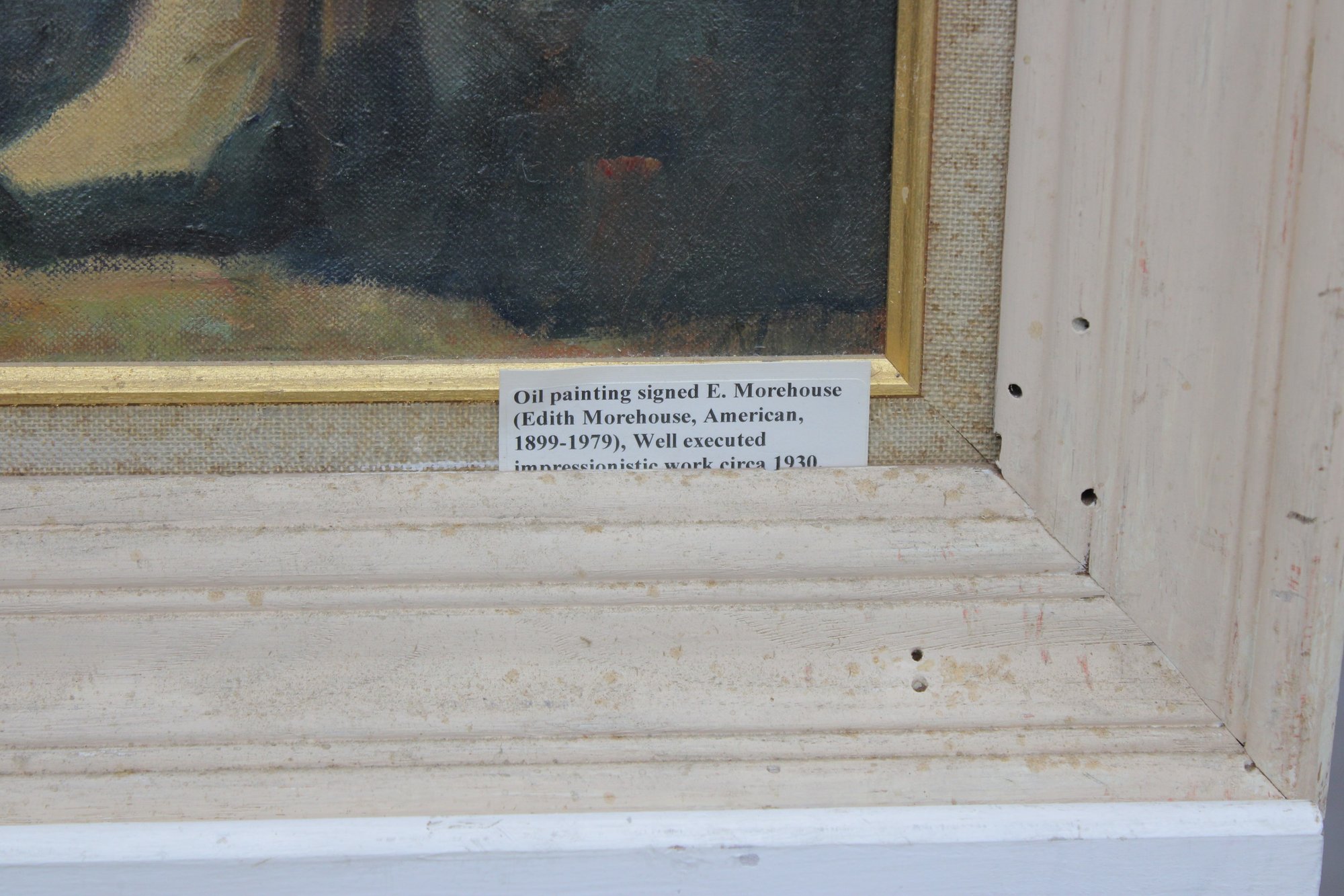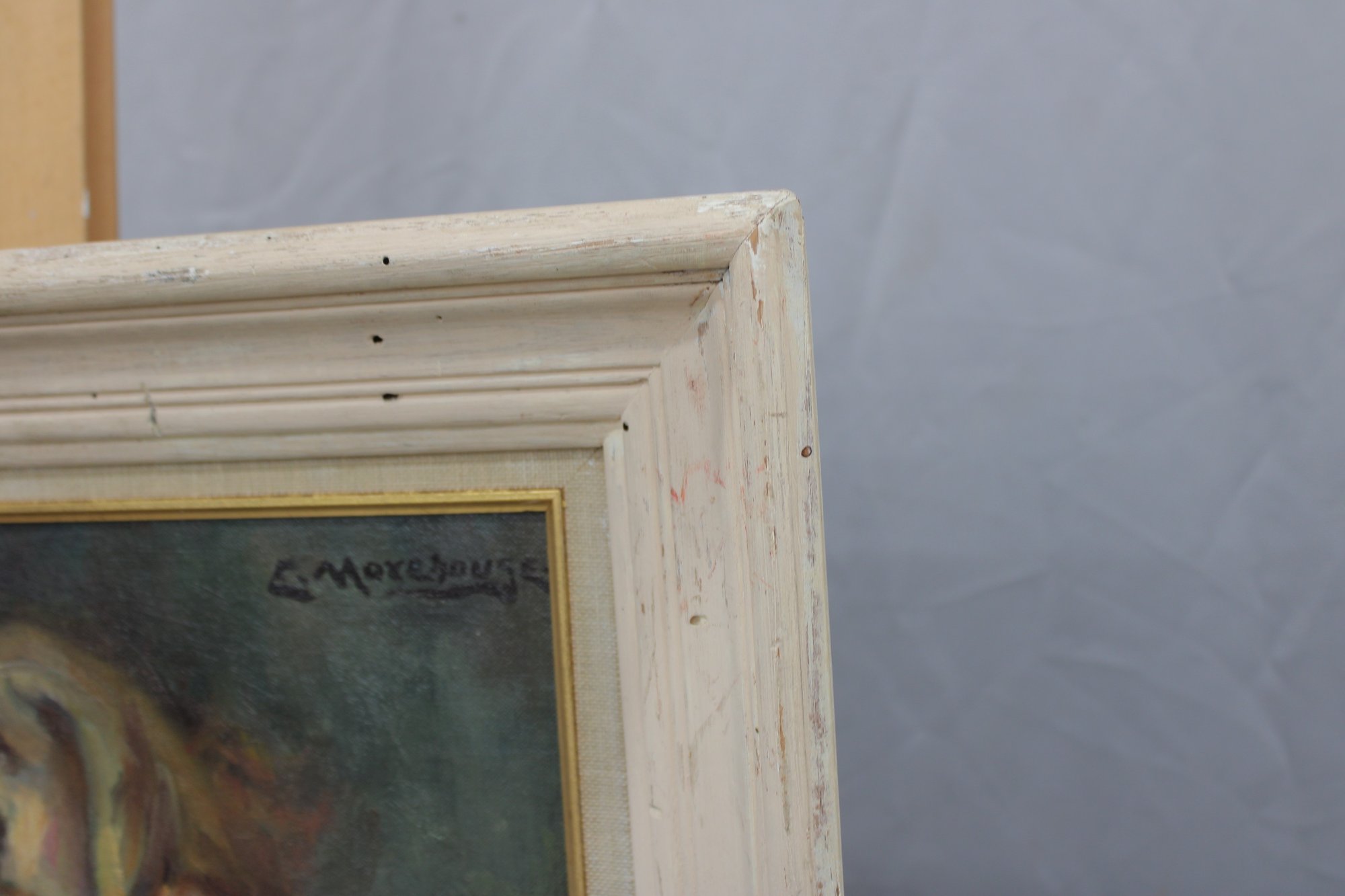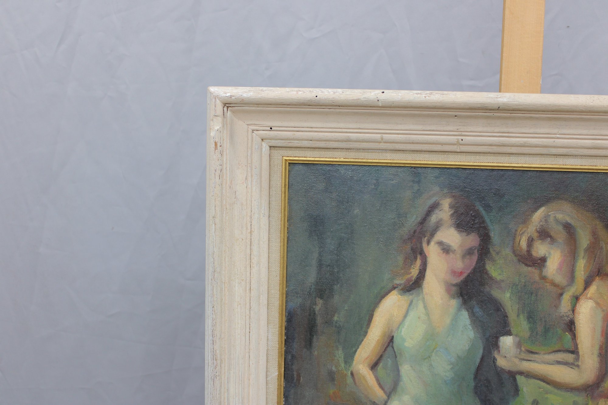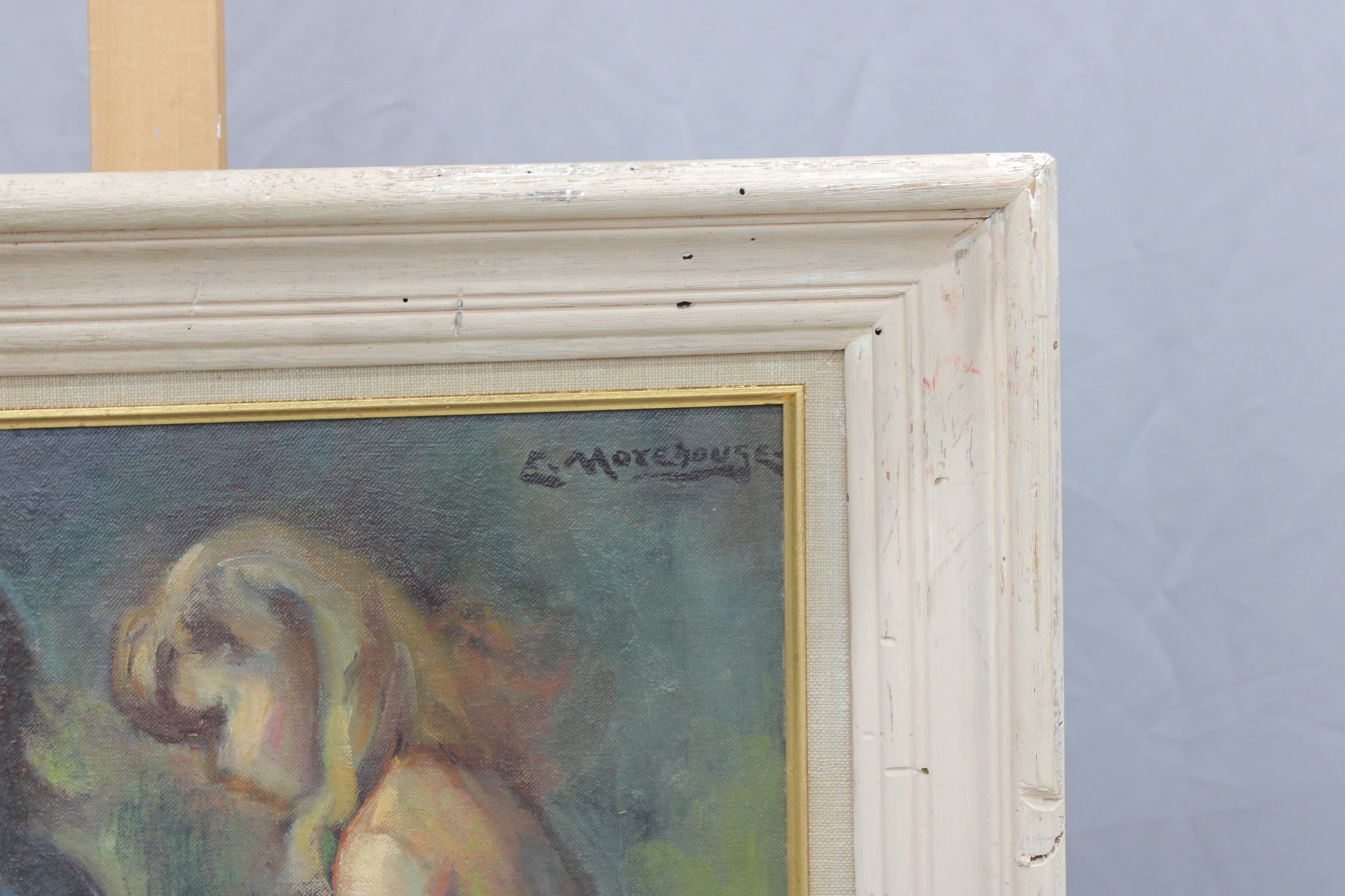 The painting is signed on the front (see photos) and is presented in a painted wood frame with gold inner liner, which complements the artwork and appears period-appropriate.