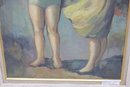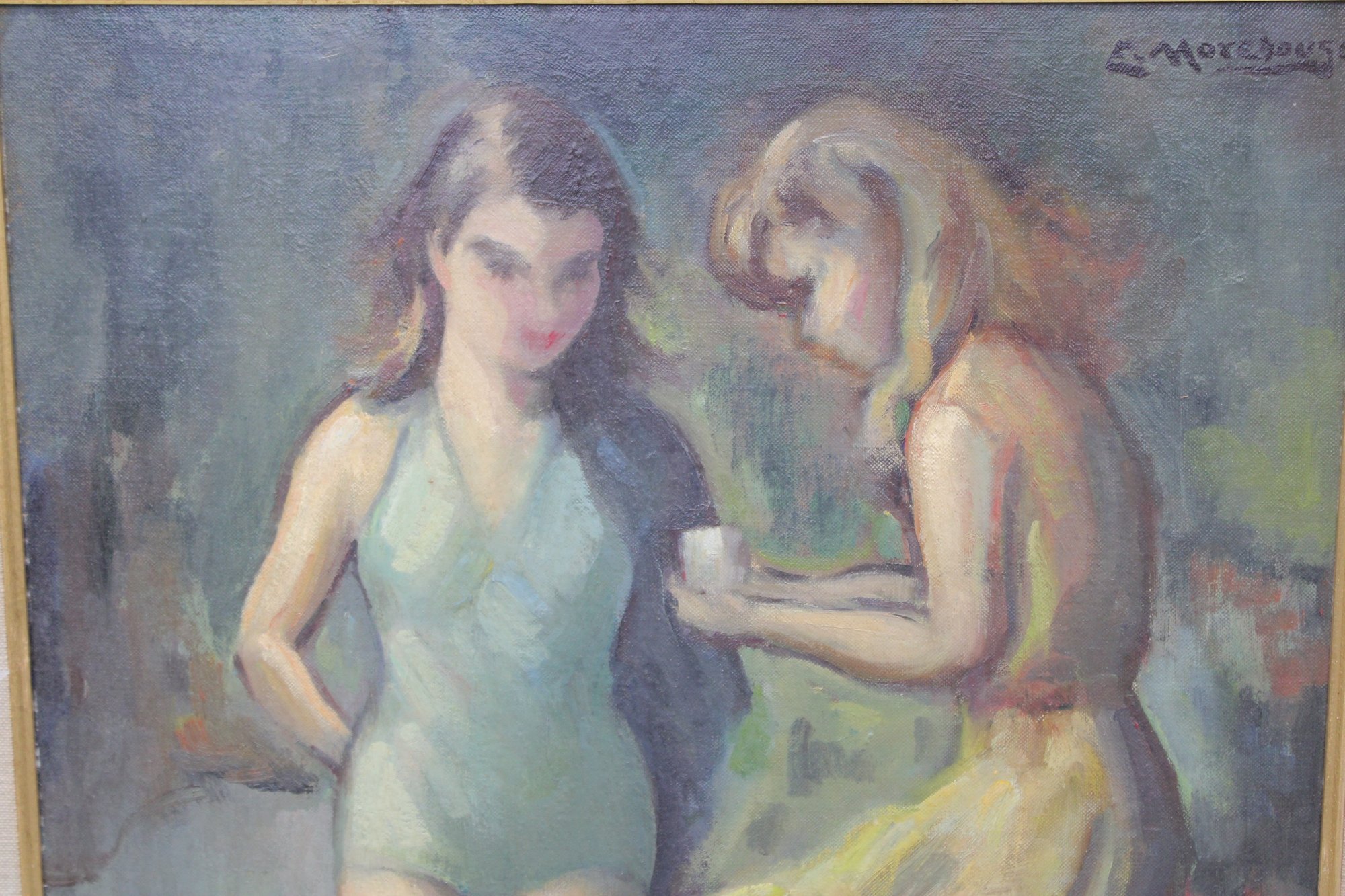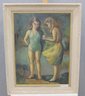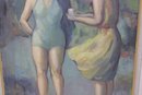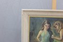 a signed original oil painting on artist board, depicting two young girls in a softly rendered figurative scene. The figures are painted with expressive brushwork and a muted, harmonious palette, giving the composition a gentle, intimate quality typical of mid-20th-century figurative art.