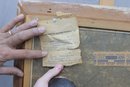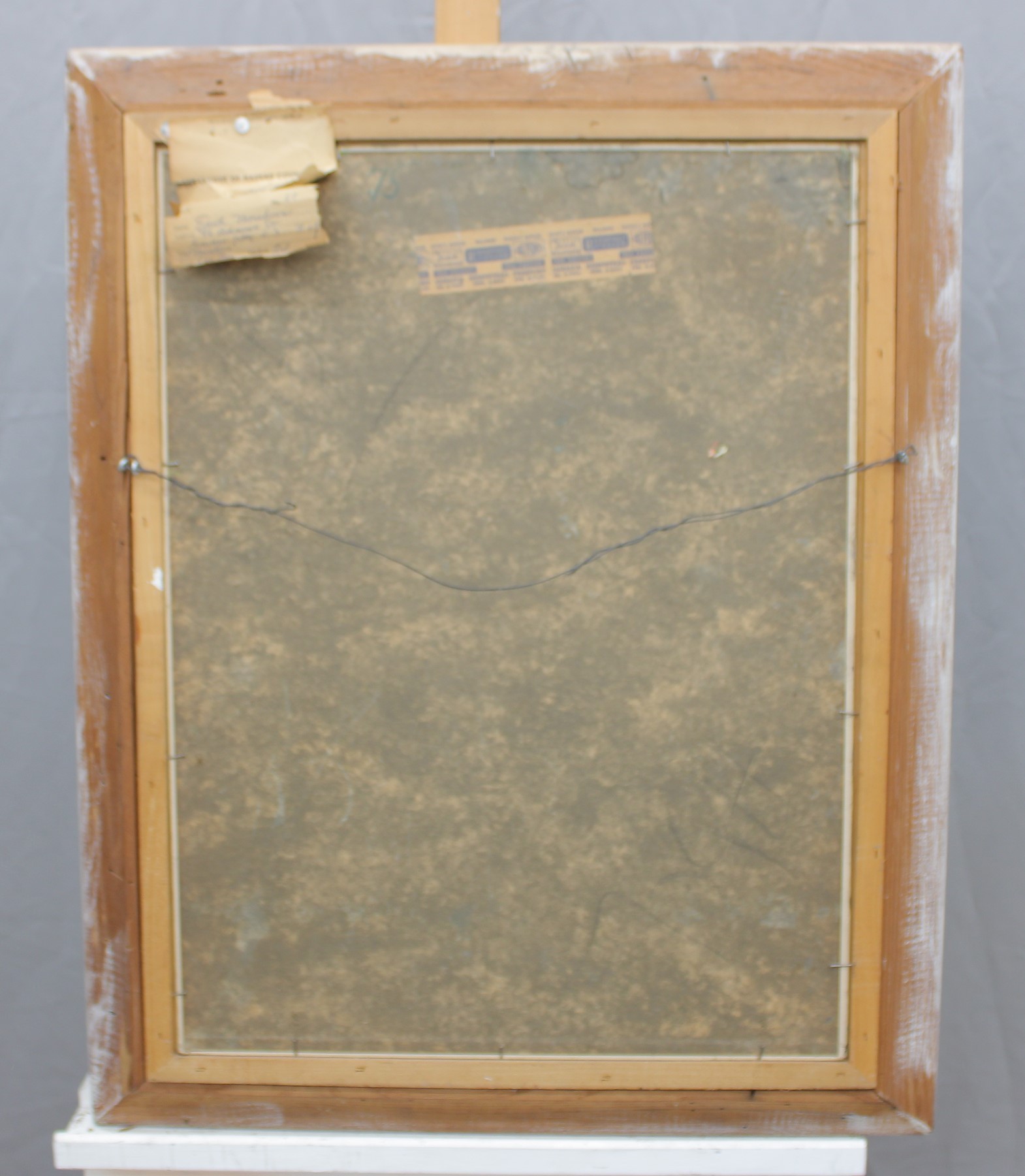 On the reverse, there are labels and handwritten notes, including references indicating the painting was exhibited and sold in 1950. These materials are original to the piece and are shown clearly in the photographs, offering additional historical context and provenance as found.