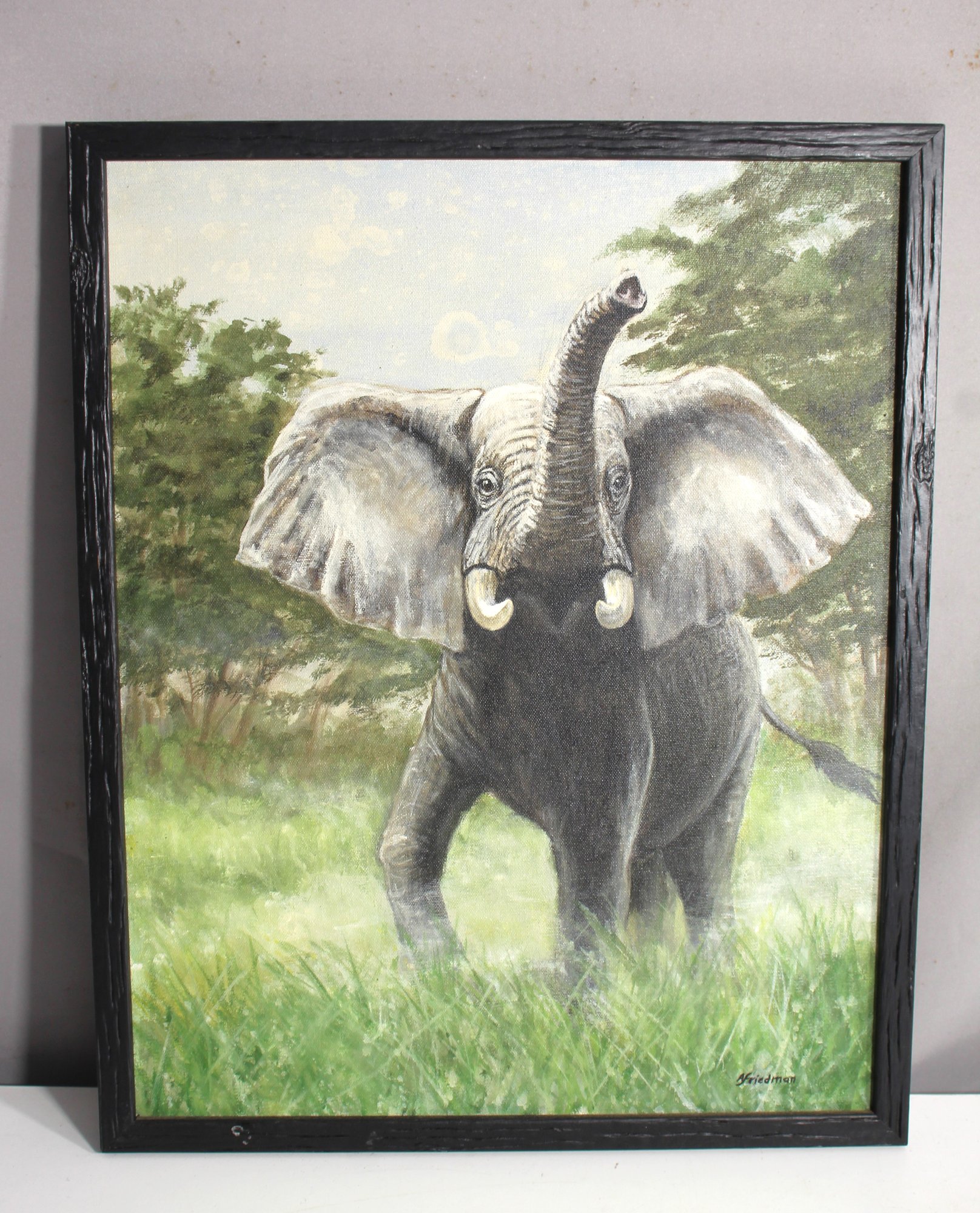 A striking print of an elephant charging through the grasslands, signed by the artist B. Friedman. The artwork is framed and ready to hang, making it a wonderful addition to a wildlife or nature-themed collection.
