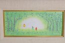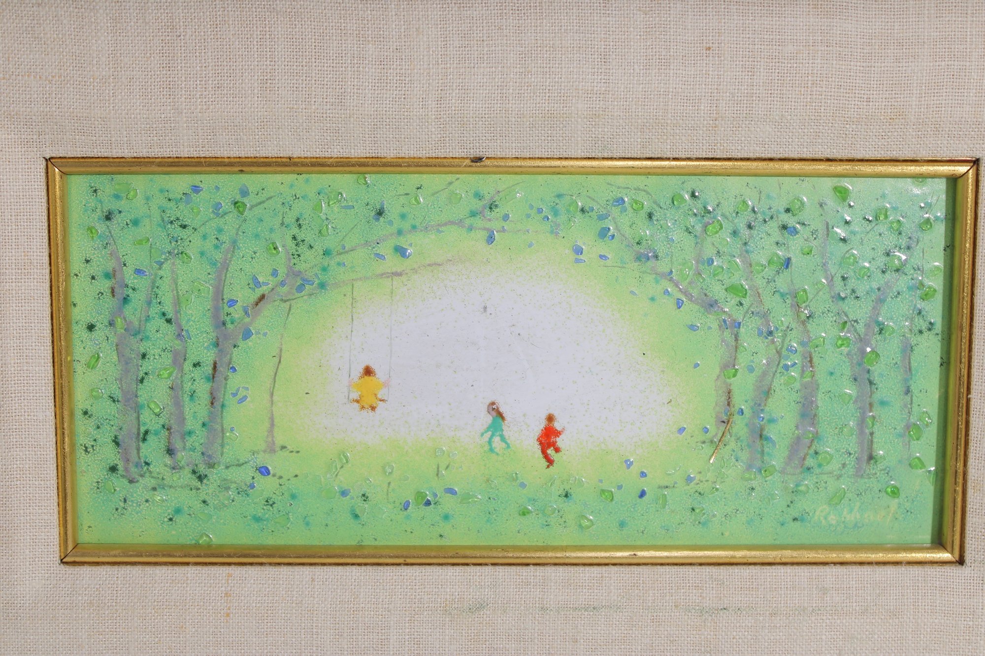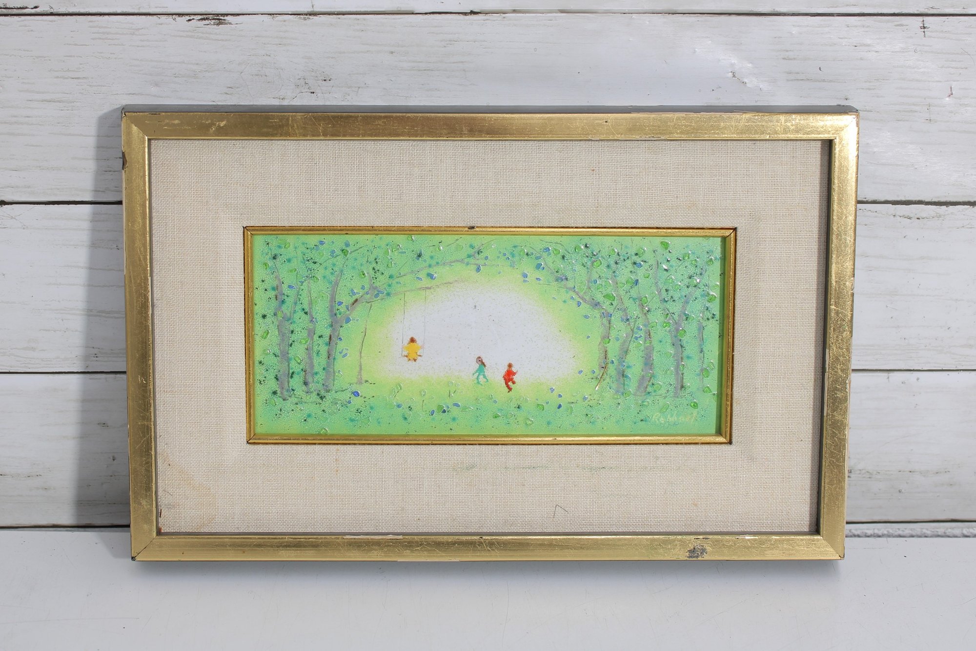 a charming signed enamel on copper artwork featuring a whimsical forest scene with children at play. This beautifully crafted piece showcases vibrant green tones with delicate detailing, depicting small figures walking through a stylized grove of trees surrounding a glowing clearing.
