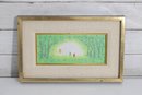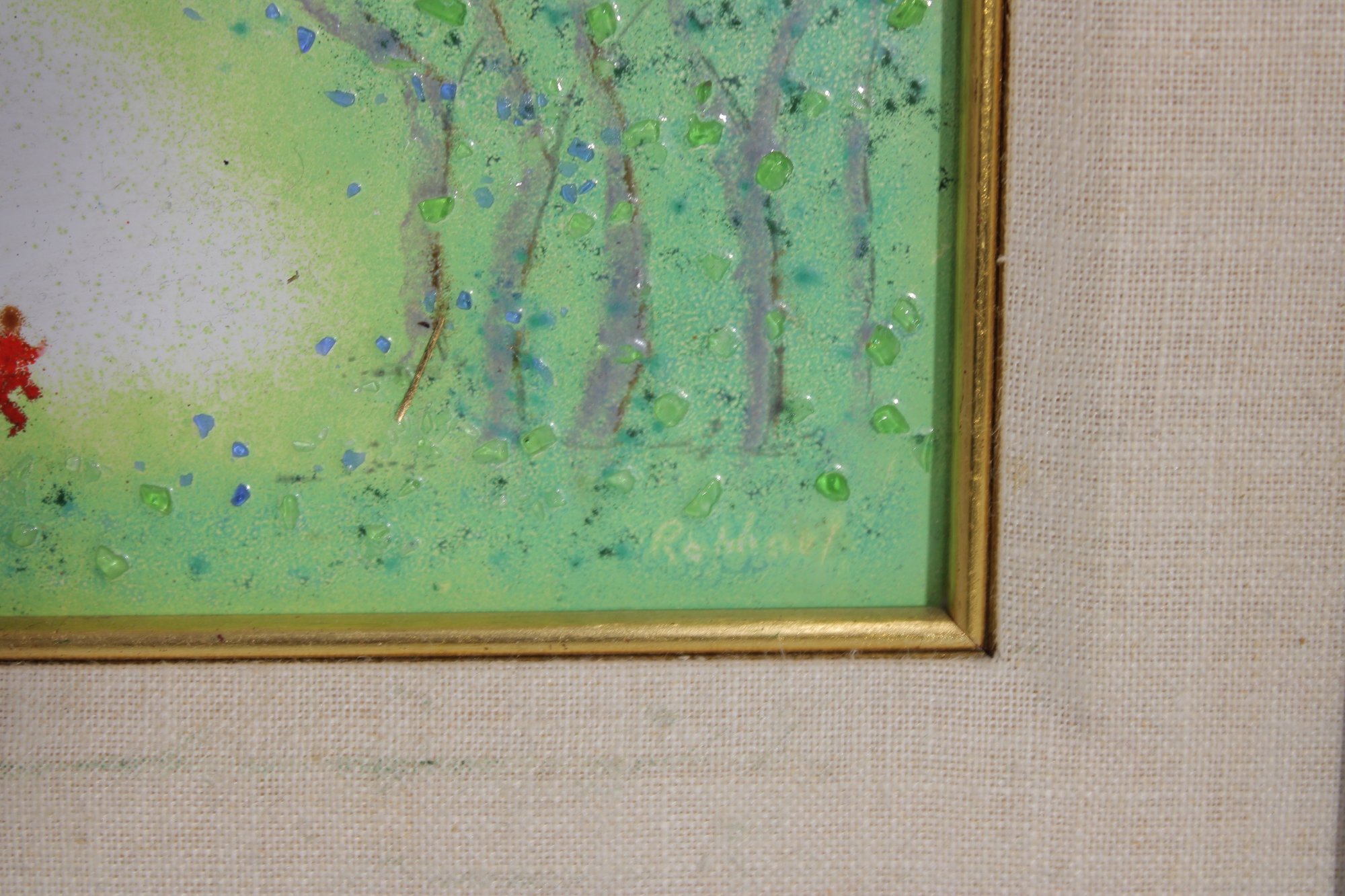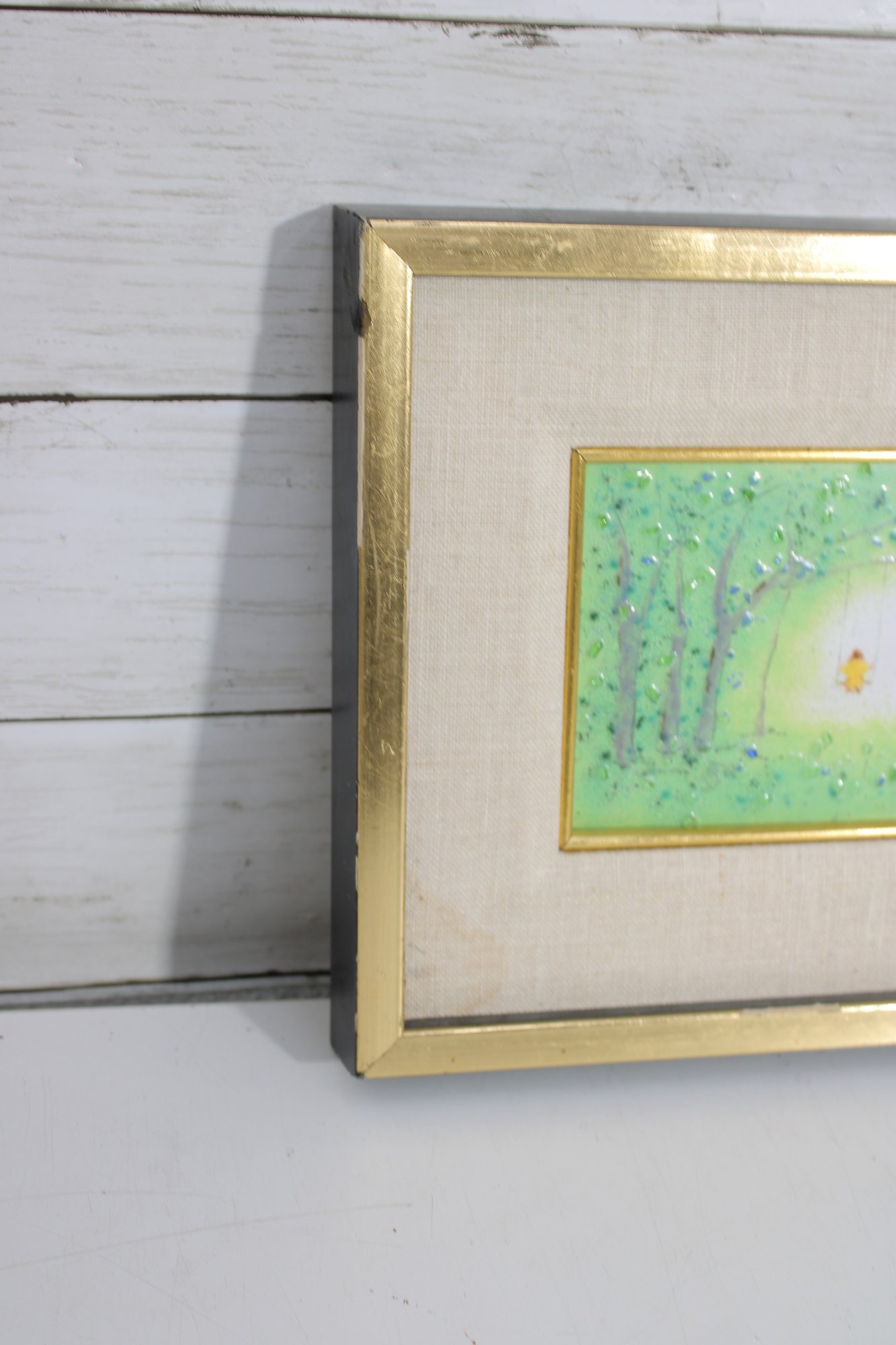 The enamel technique gives the surface a luminous, slightly textured quality, enhancing the depth and color brilliance. The piece is professionally framed with a linen-style mat and gold-tone frame, adding an elegant presentation suitable for any décor.