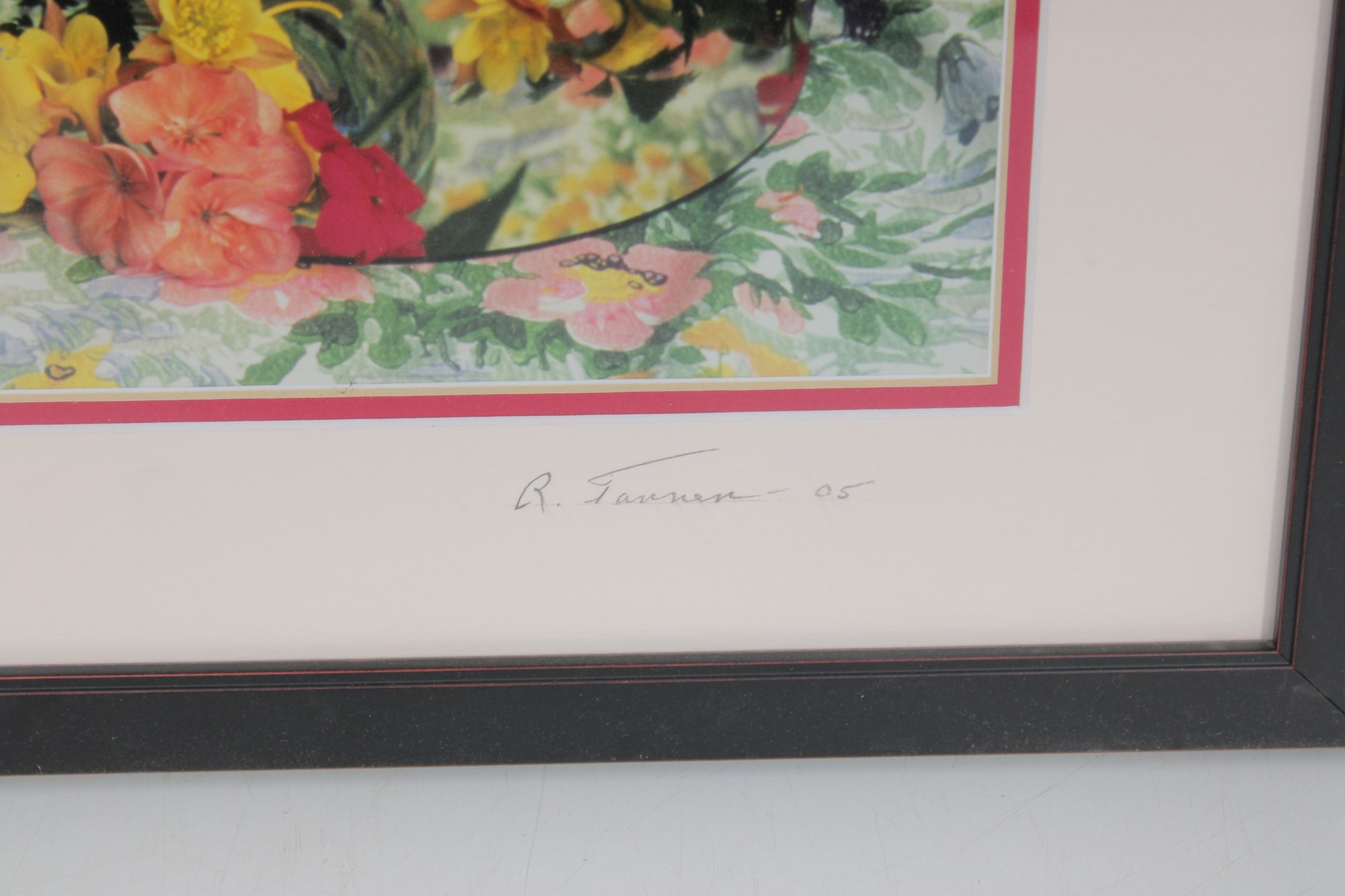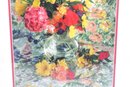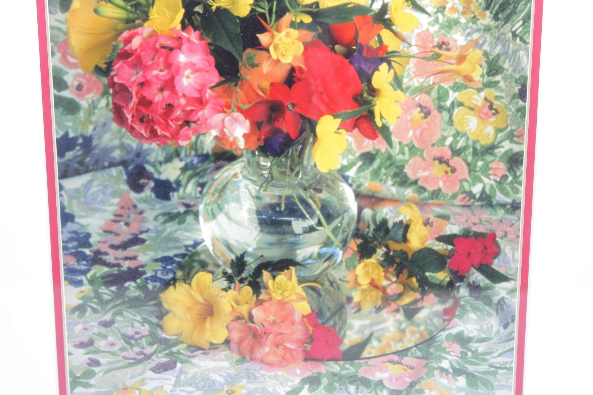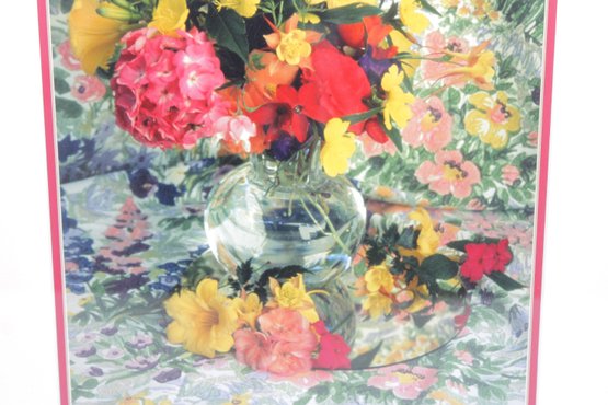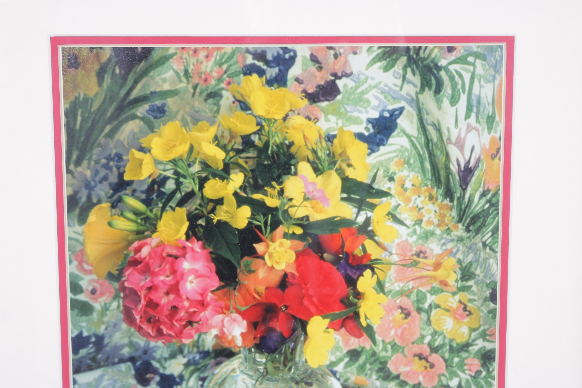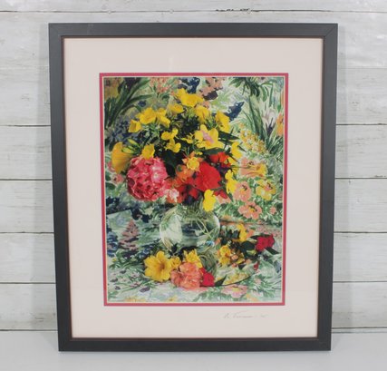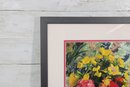Beautiful signed floral print featuring a vibrant bouquet in vivid shades of yellow, red, pink, and green. This colorful composition has an impressionistic style and is attractively matted and framed, making it a lovely decorative piece for home or office display.