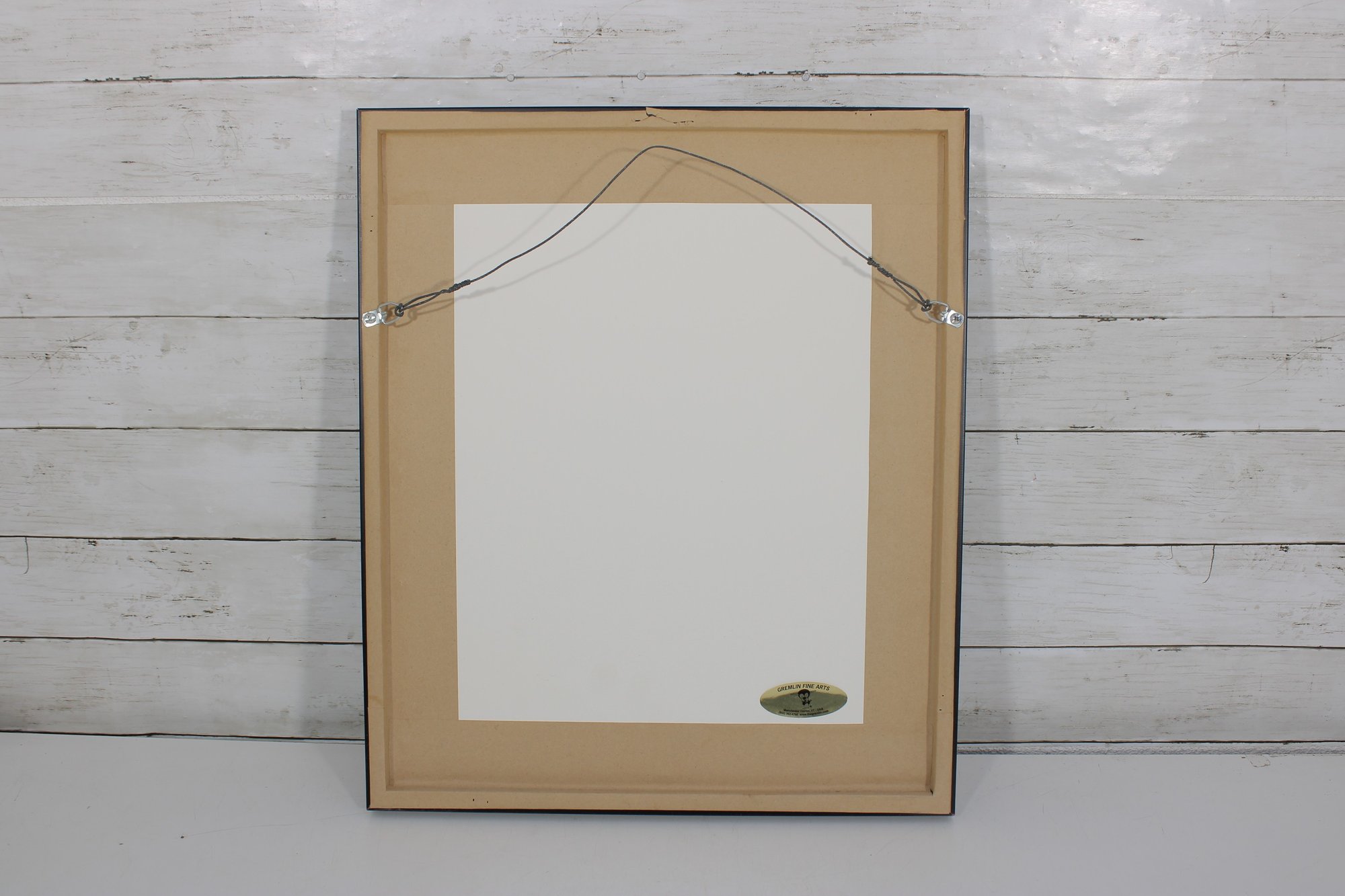 Overall measurements are approximately 20" high x 17" wide. Pencil signed along the lower margin. Housed in a dark frame with contrasting mat and pink inner border that complements the artwork nicely. Appears to be in good display condition with light wear to the frame consistent with age and handling. Please review all photos carefully for condition and details.