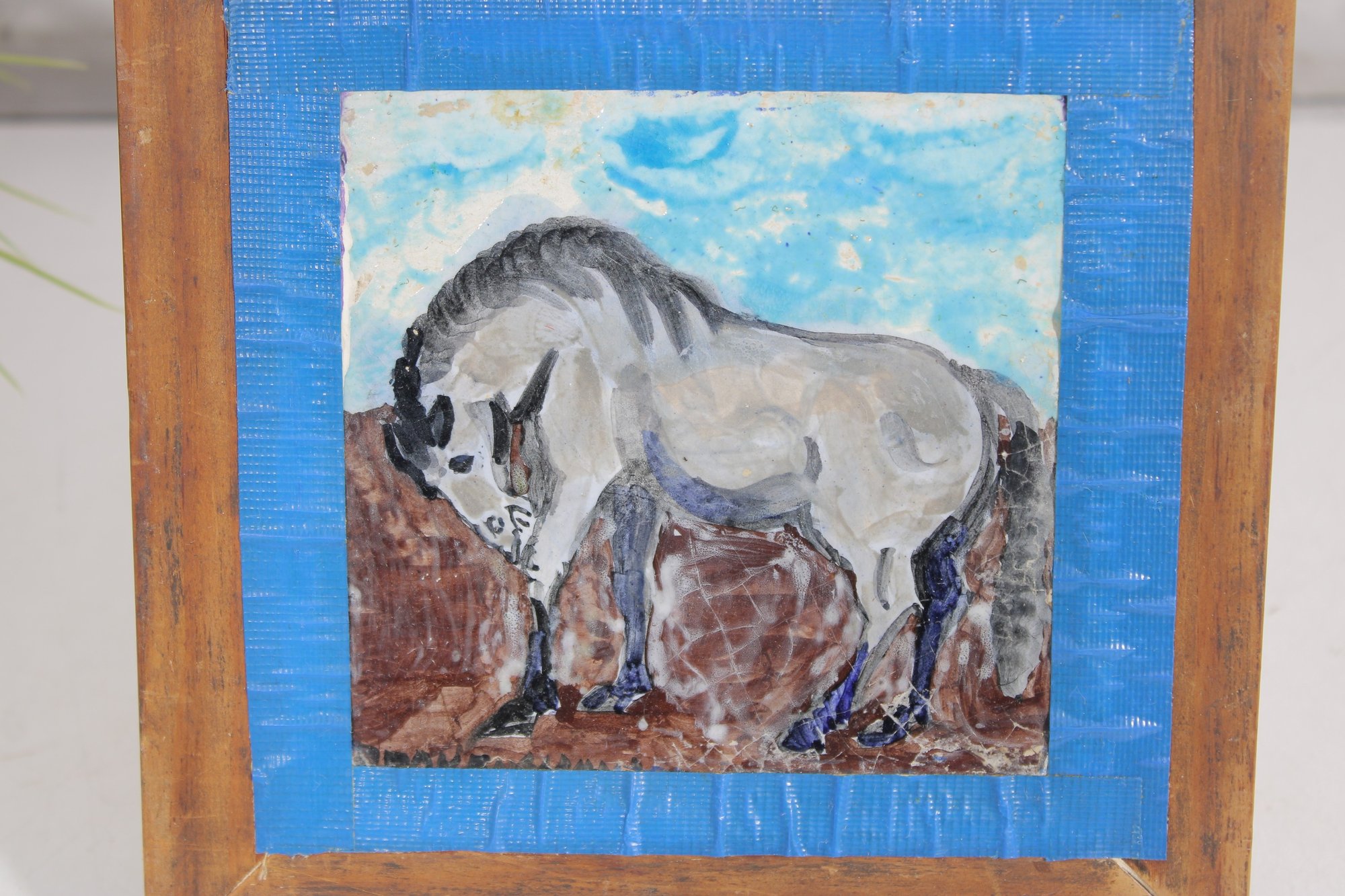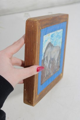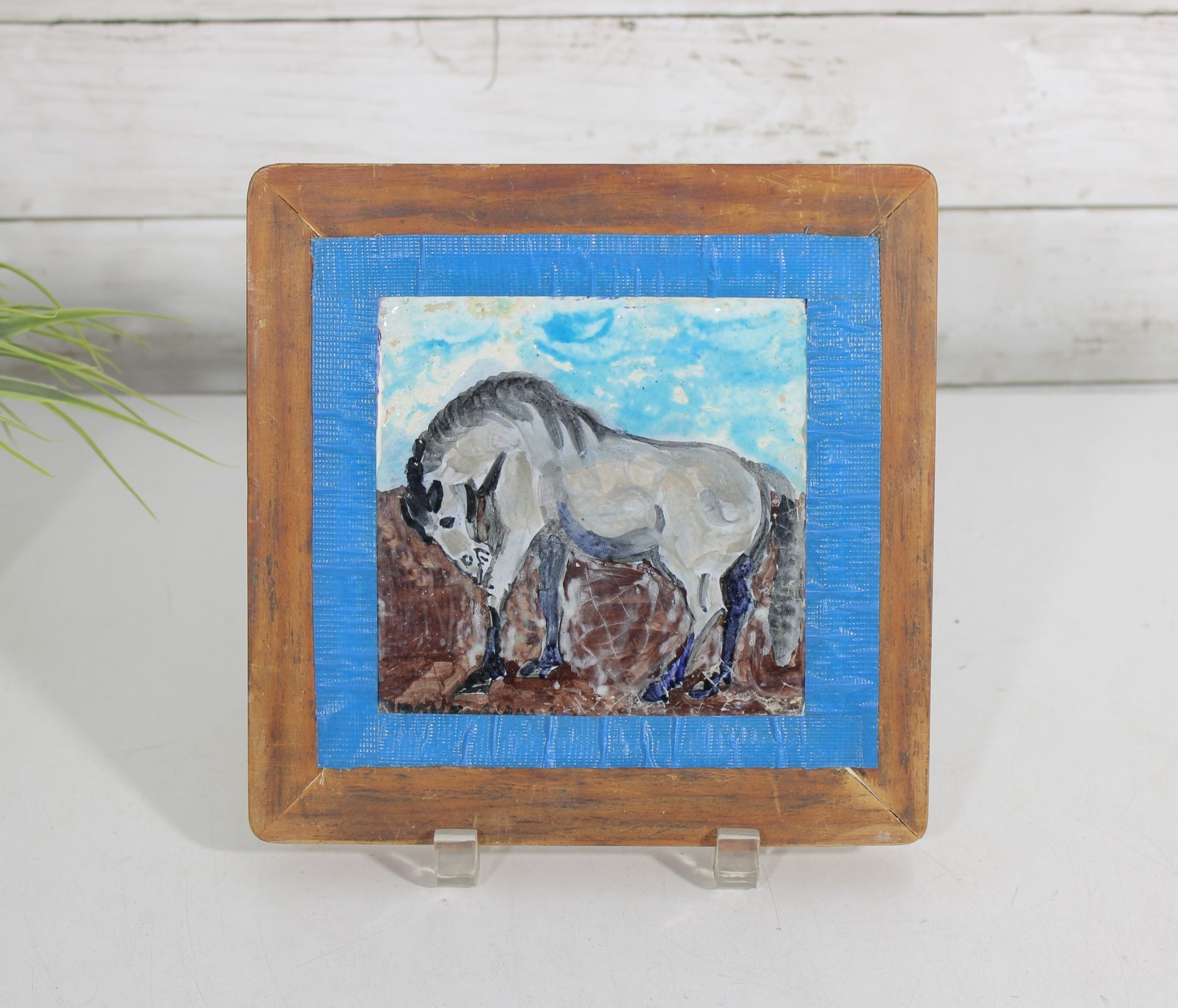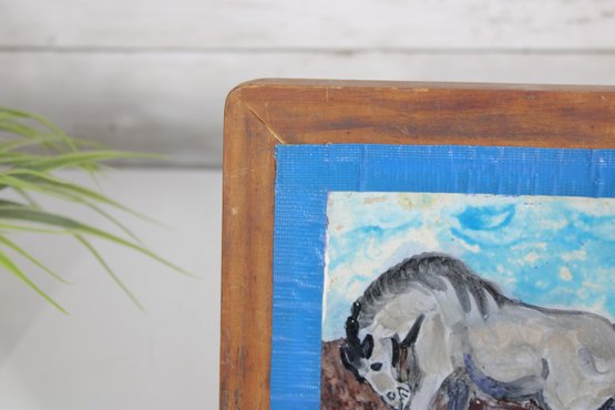 Charming signed ceramic tile artwork featuring a hand-painted horse in a rustic, folk art style. The composition depicts a gray horse standing against a soft blue sky and earthy ground, rendered with expressive brushwork and a gentle, pastoral feel.