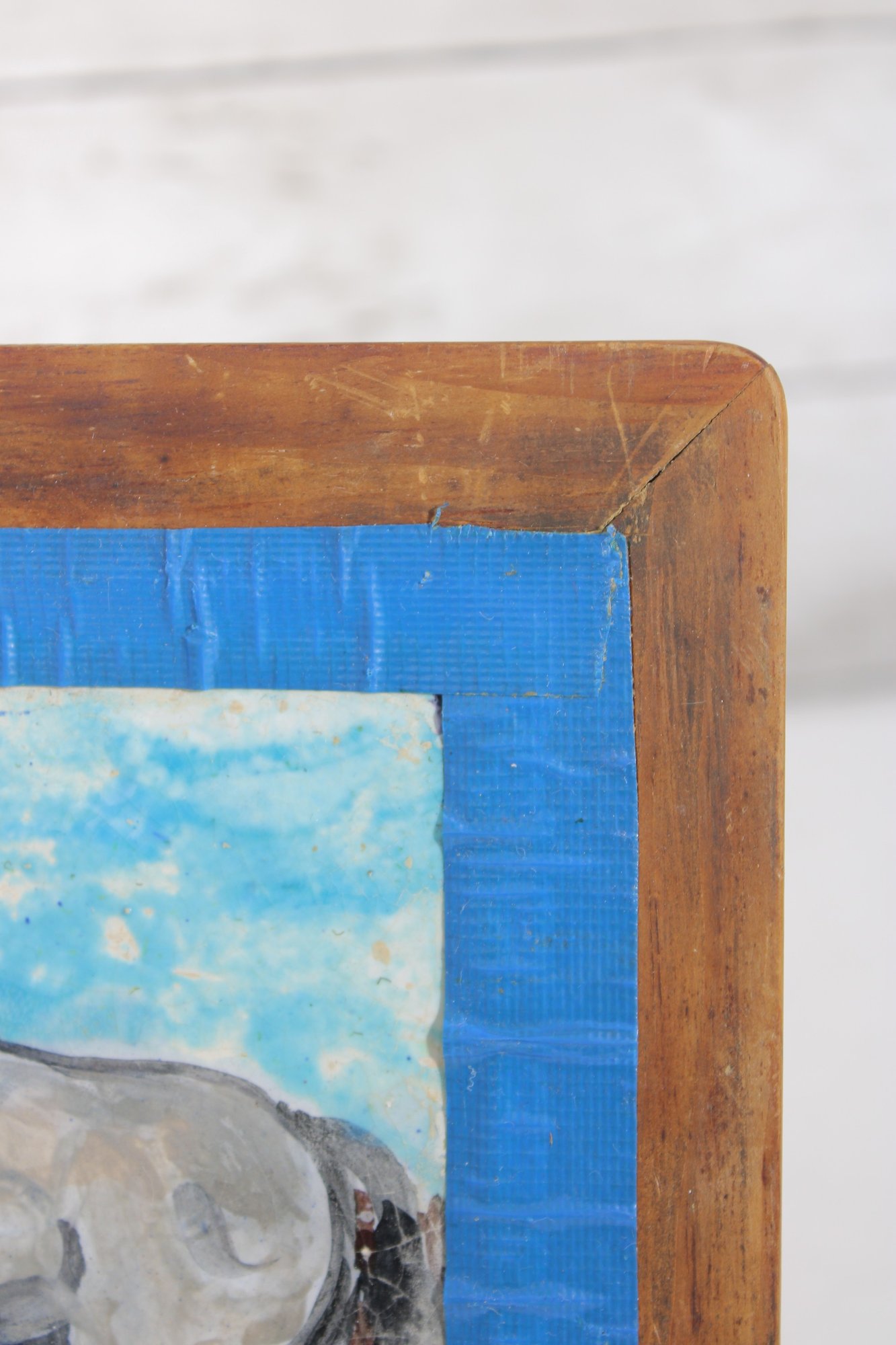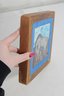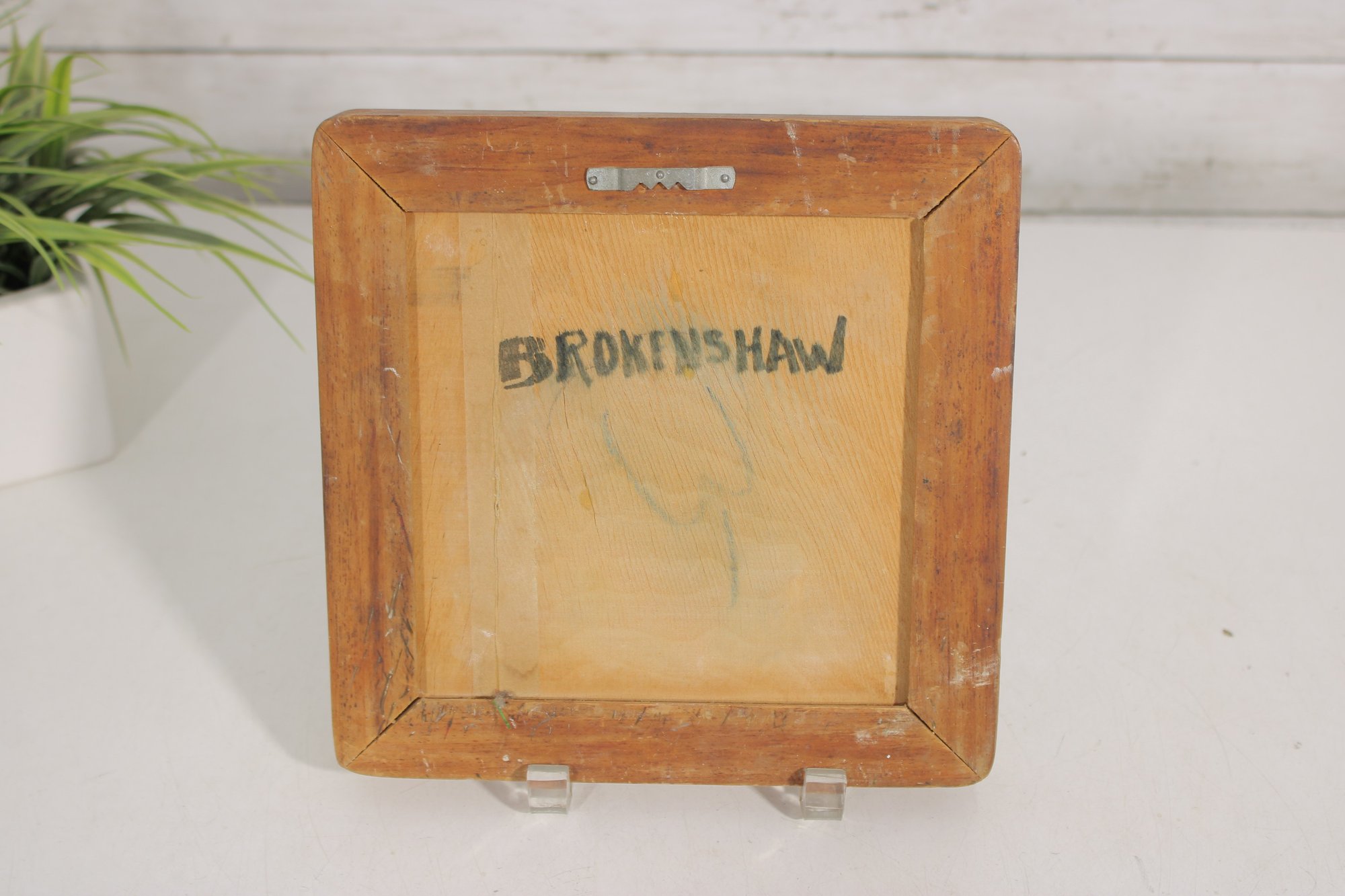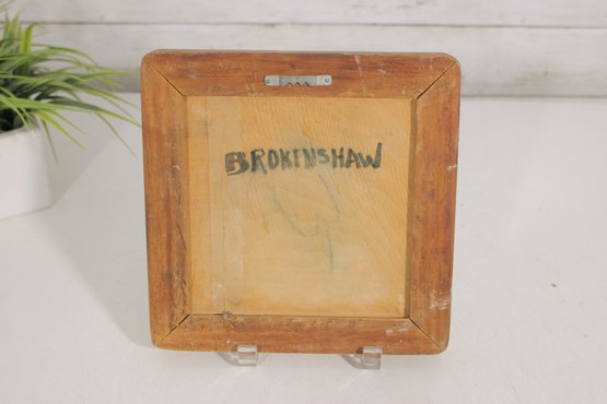 The tile is mounted within a solid wood frame with a painted blue border that complements the artwork beautifully, giving it a warm, handcrafted appearance. The reverse is signed “Brokenshaw,” adding to its collectible appeal.